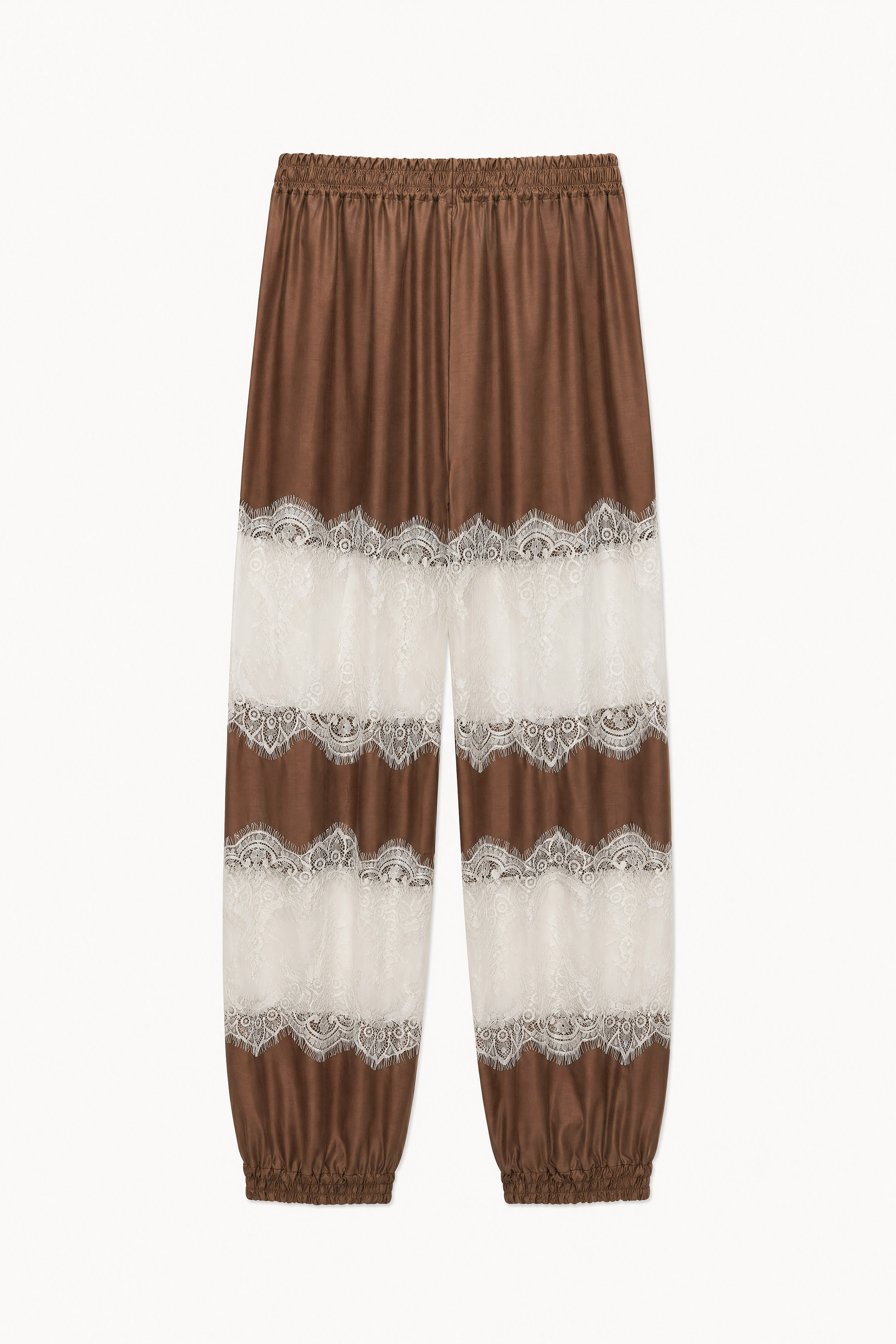 Pantaloni in tessuto satinato misto lyocell. Vita elasticizzata. Tasche laterali inserite. Inserti in pizzo floreale con finiture sfrangiate. Fondo gamba con elastico e arricciatura. Vestibilità regolare, disponibile in taglia S/M, M/L.