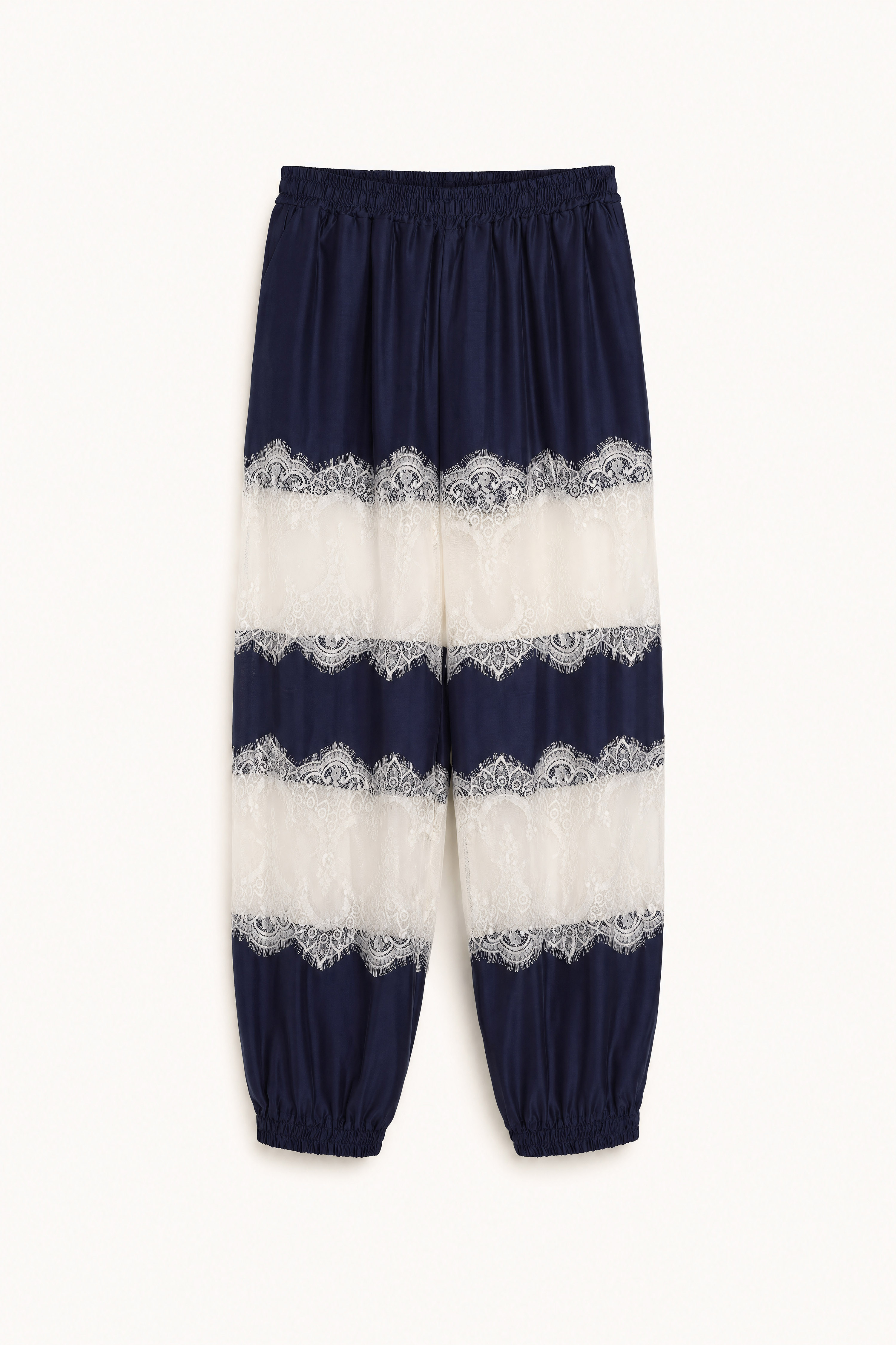 Pantaloni in tessuto fluido e satinato. Vita elasticizzata per massimo comfort. Inserti laterali in pizzo floreale trasparente. Fondo gamba arricciato. Linea morbida. Vestibilità regolare, disponibile in taglia S/M, M/L.