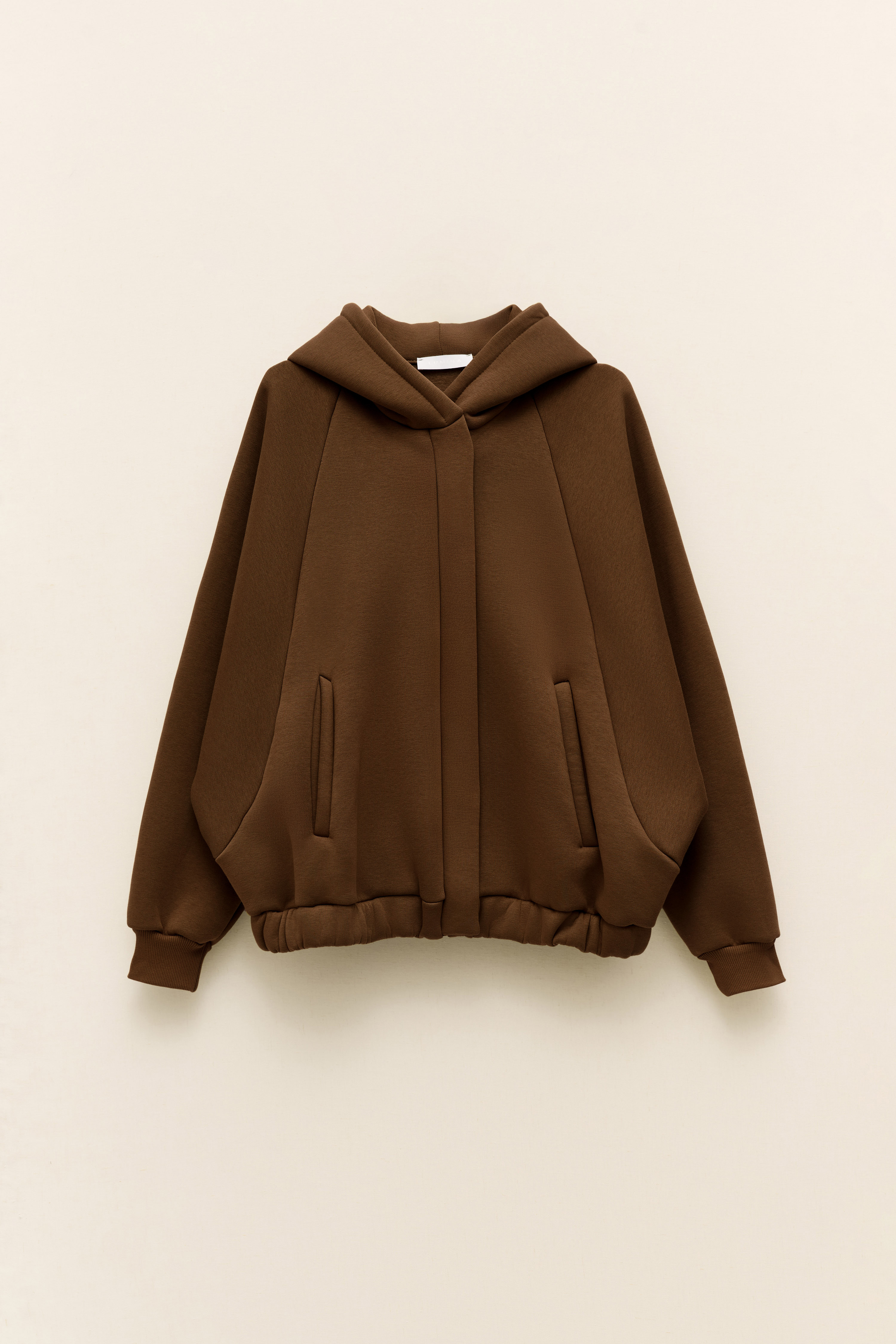 Felpa in pelle scamosciata sintetica con cappuccio.