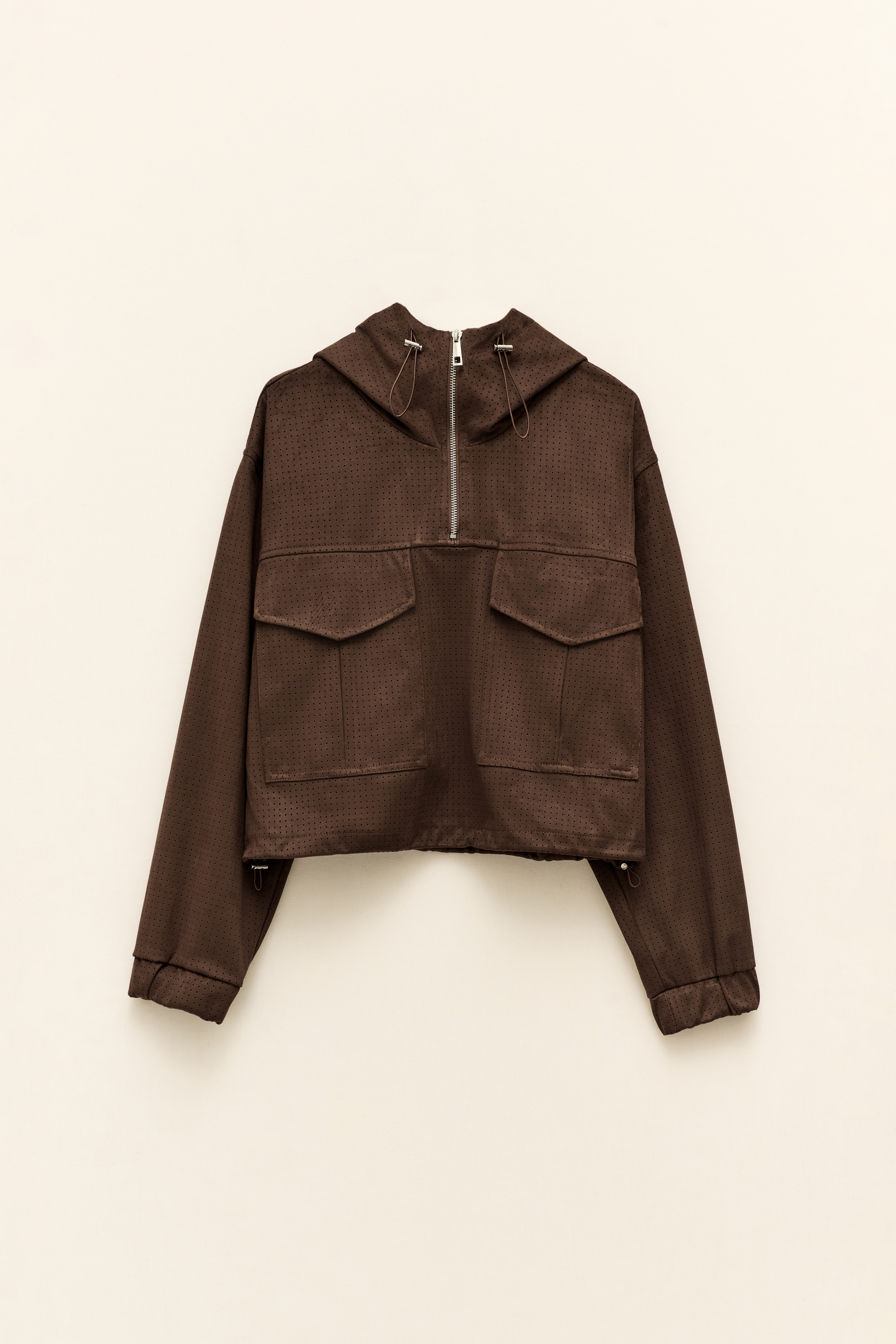 Cappuccio regolabile. Polsini alle maniche.