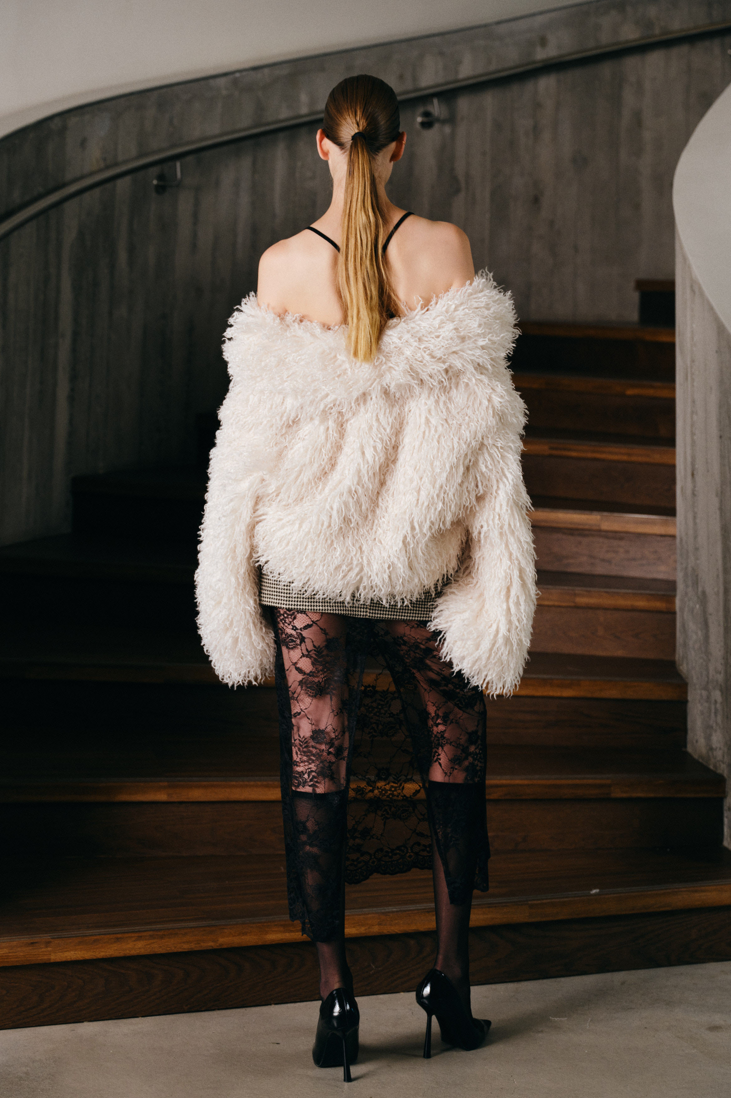 Capotto lungo realizzato in pelliccia sintetica.