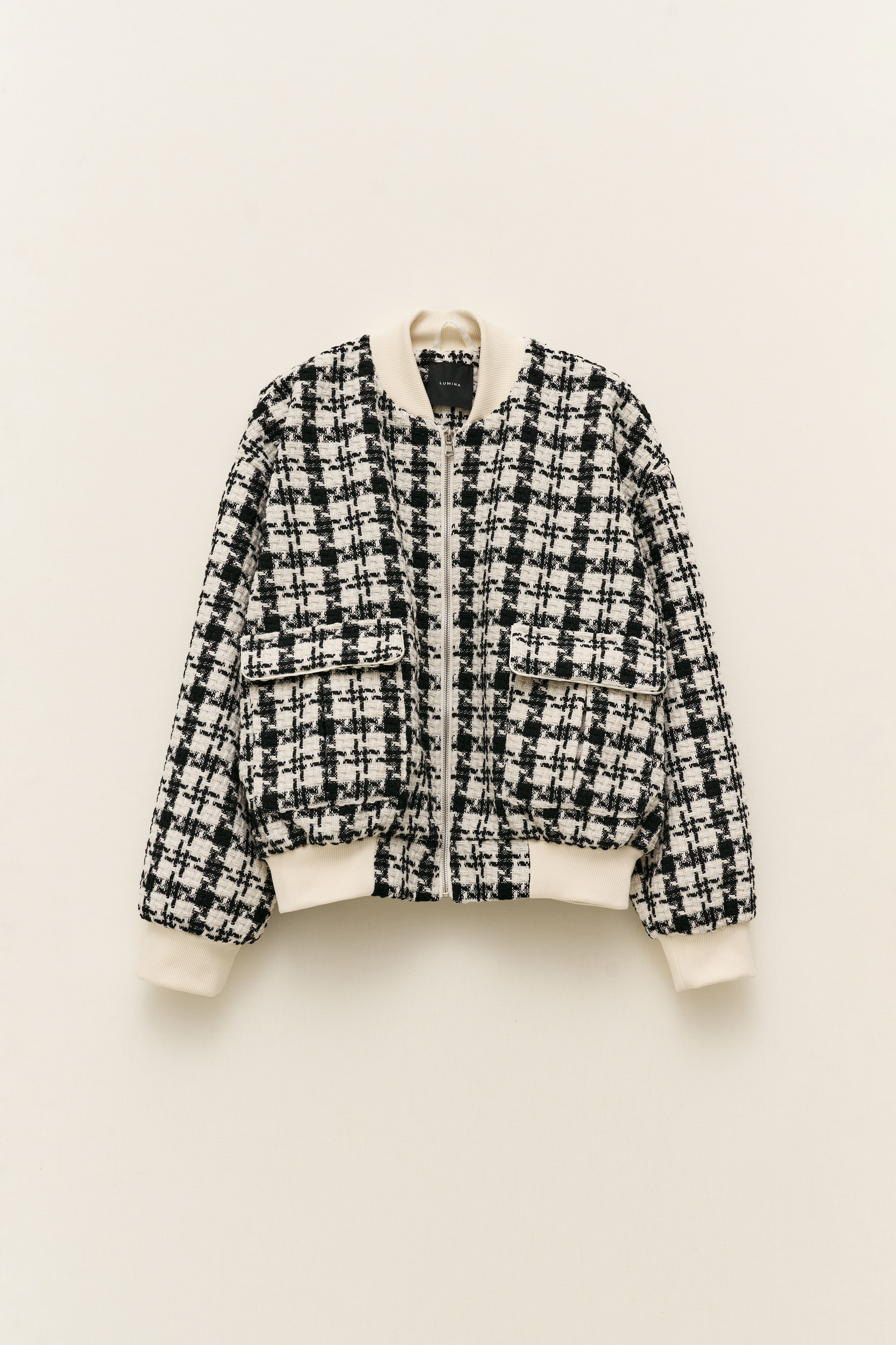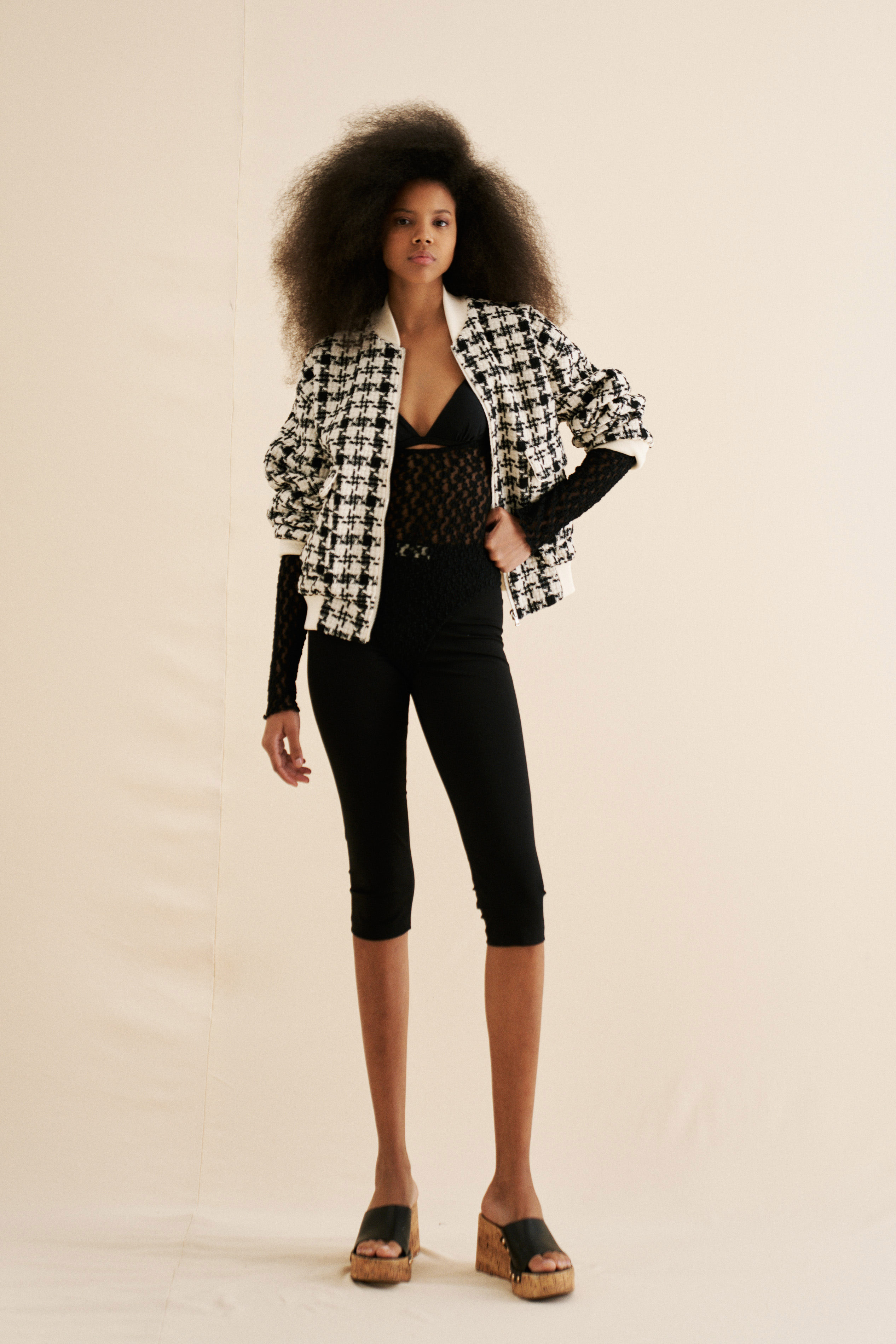 Collo e polsini rifiniti a costina. Maniche a tre quarti con spalla scesa.