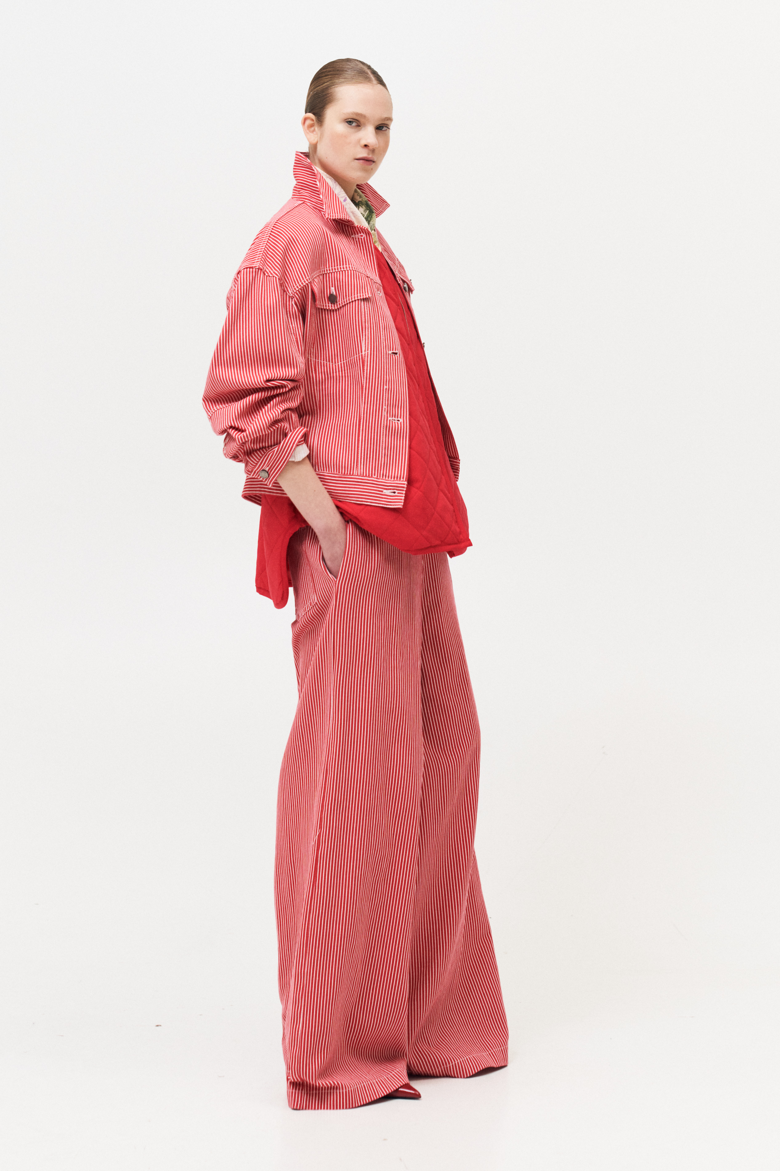 Pantaloni lunghi realizzati in tessuto a righe 100% cotone. Vita regolare con passanti per cintura. Tasche laterali inserite. Tasche posteriori applicate. Chiusura frontale con cerniera e bottone. Vestibilità regolare, disponibile in taglia S, M, L.