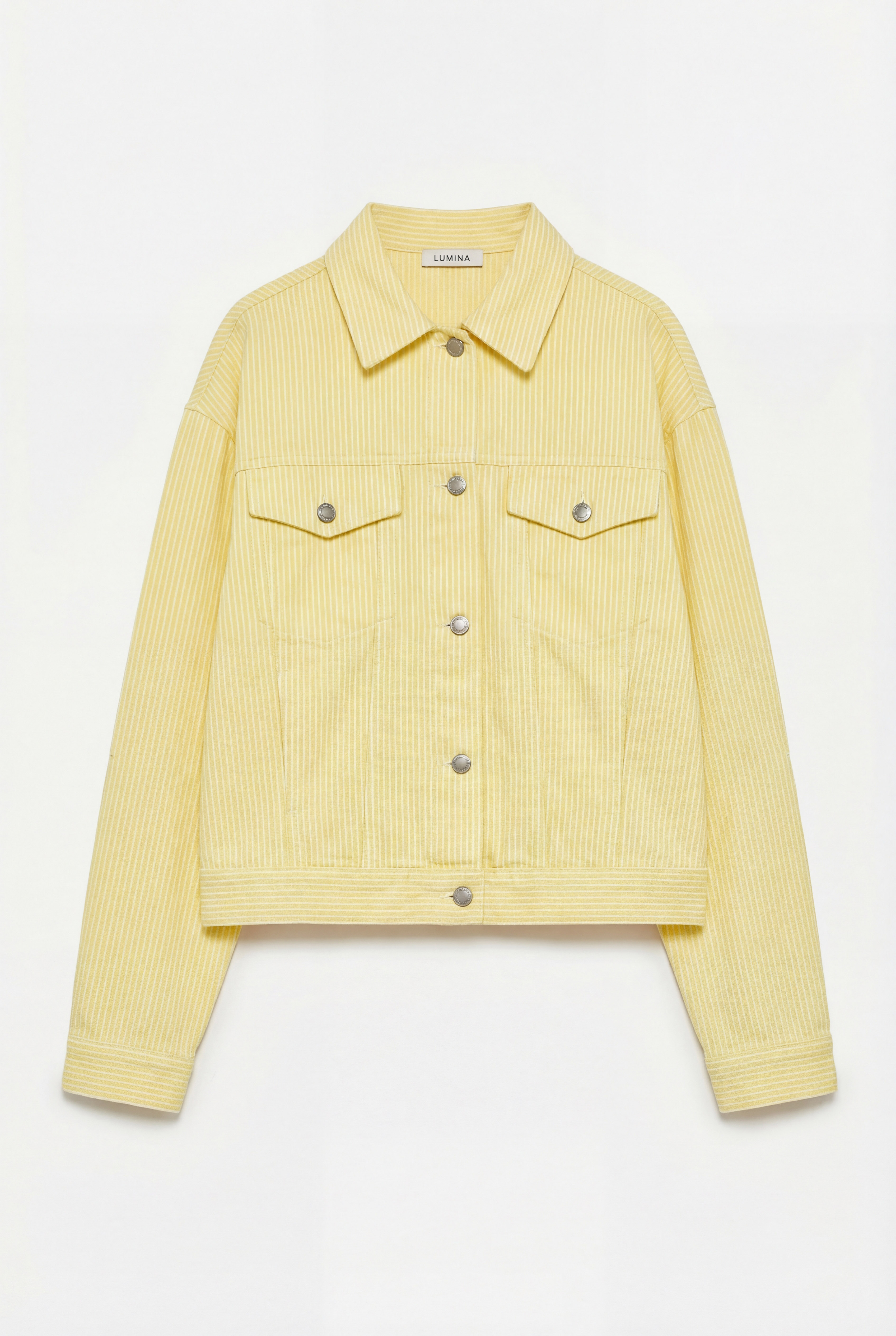 Giacca realizzata in tessuto a righe 100% cotone. Colletto classico a camicia. Tasche applicate sul davanti con patta e bottone. Maniche lunghe con polsino e bottone. Cinturino posteriore regolabile con bottoni. Chiusura frontale con bottoni. Vestibilità regolare, disponibile in taglia S/M, M/L.
