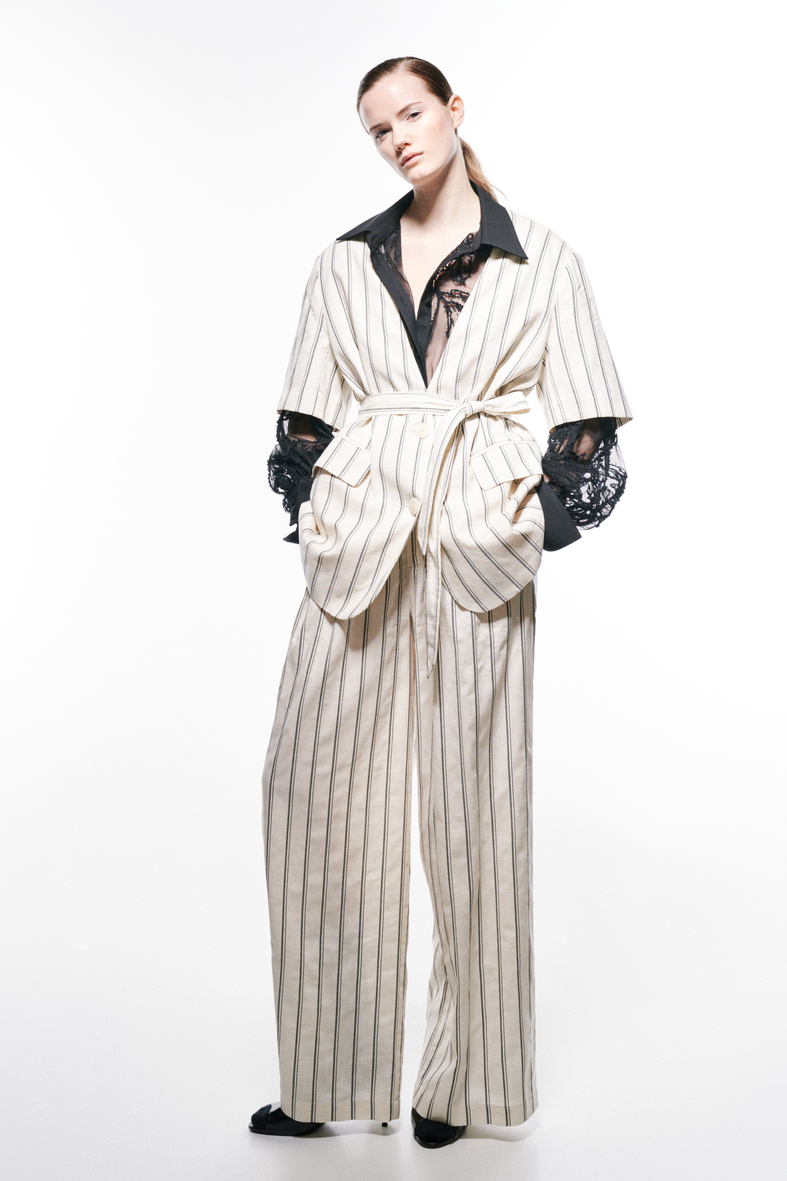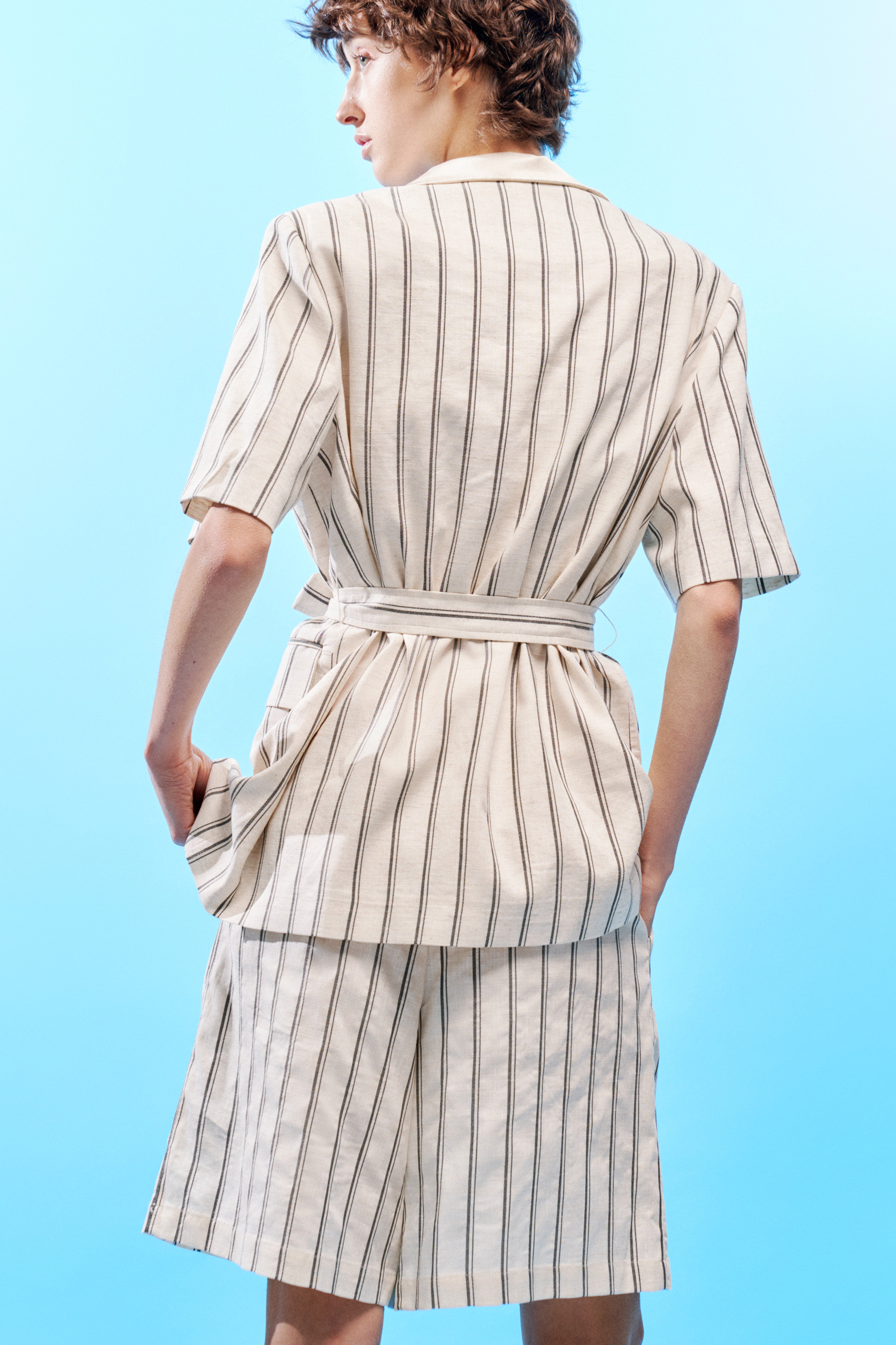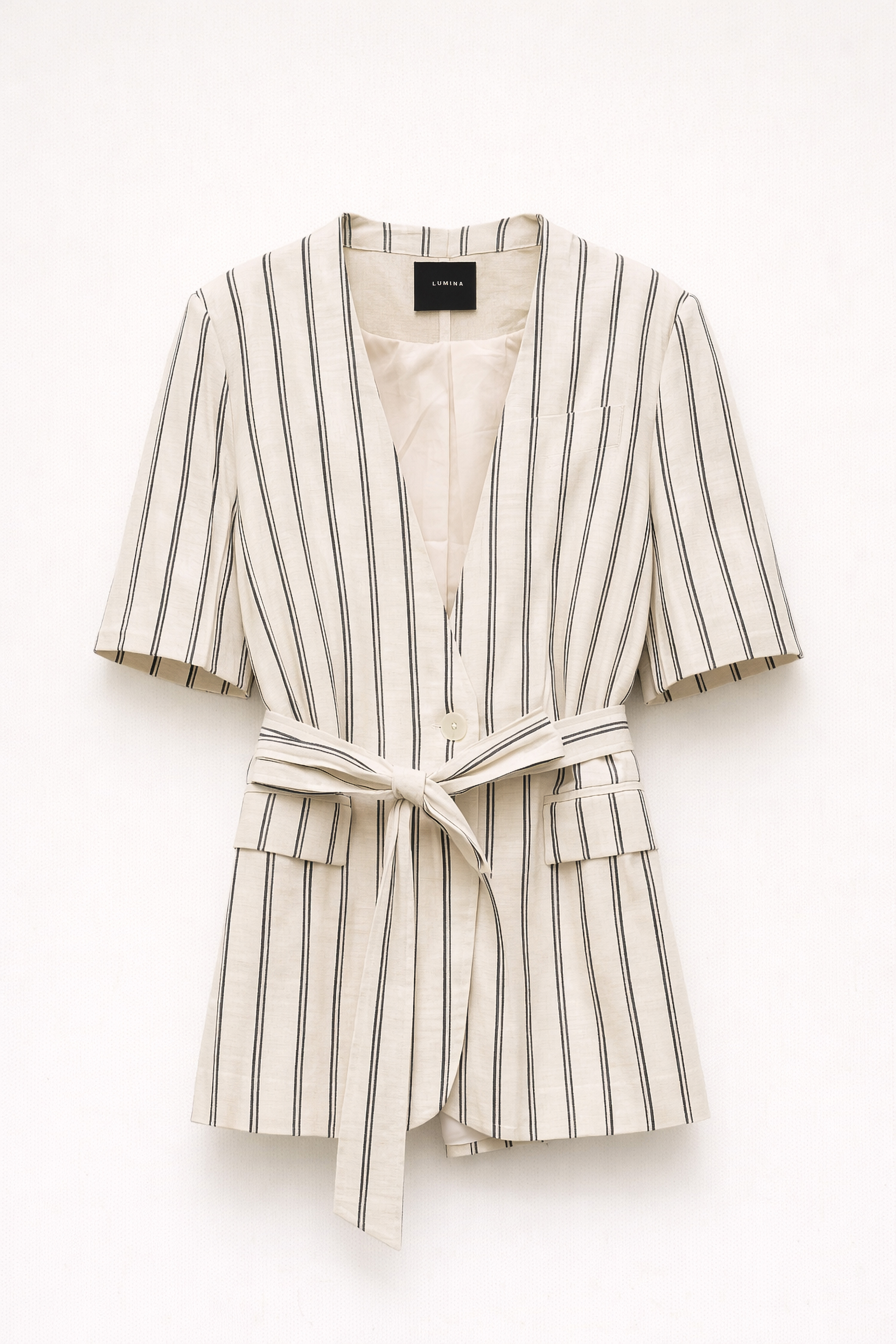 Giacca maniche corte a righe in misto lino. Scollo a V. Presenta fodera interna. Cintura in tessuto coordinato rimovibile. Tasche anteriori con patta strutturata. Chiusura frontale con bottoni. Vestibilità regolare, disponibile in taglia UNICA.