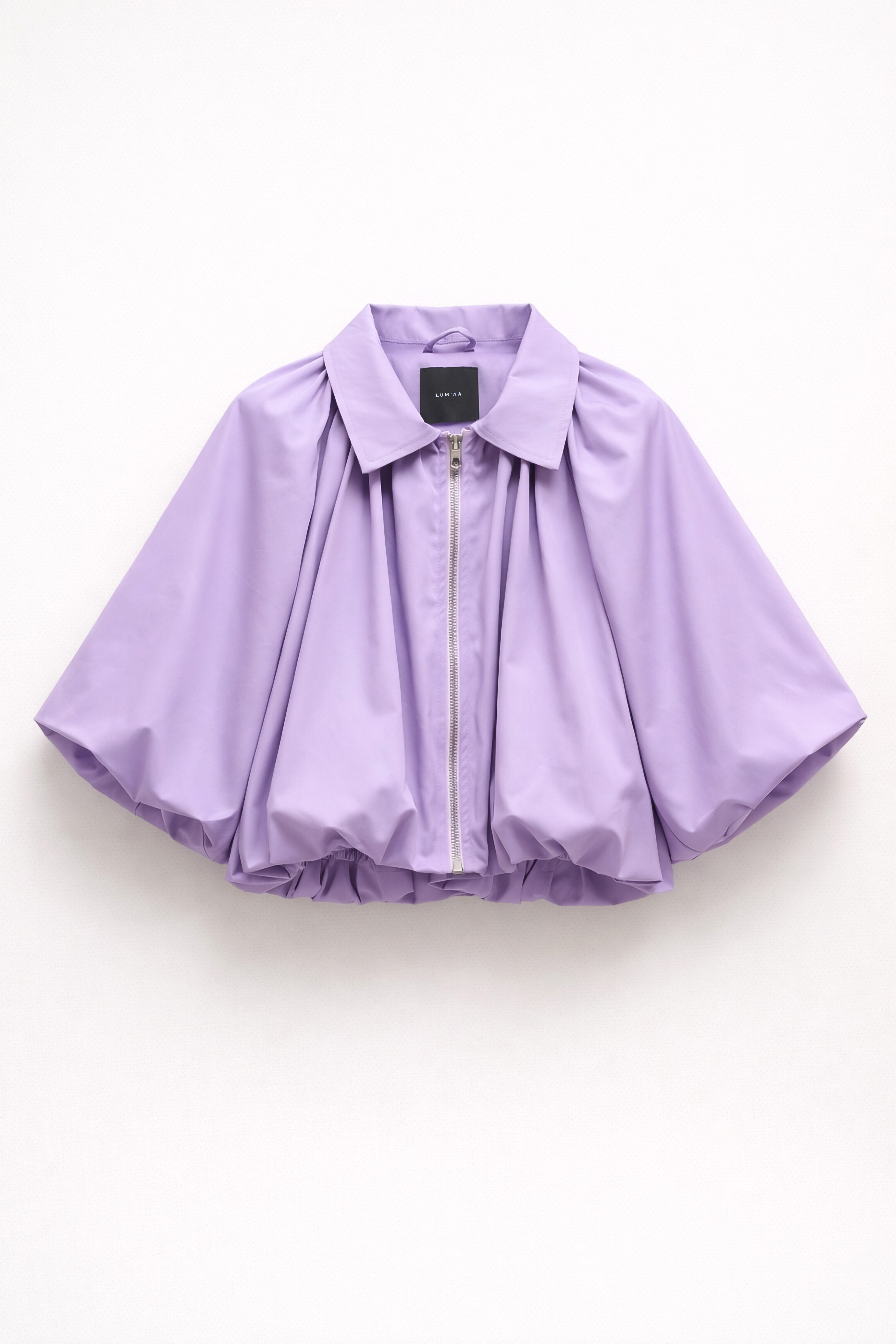 Bomber cropped con colletto a punta. Maniche lunghe ampie effetto balloon. Polsini con elastico interno arricciato. Fondo con elastico per effetto balloon. Costruzione con arricciature sul retro. Chiusura frontale con zip metallica. Vestibilità regolare, disponibile in taglia S/M, M/L.