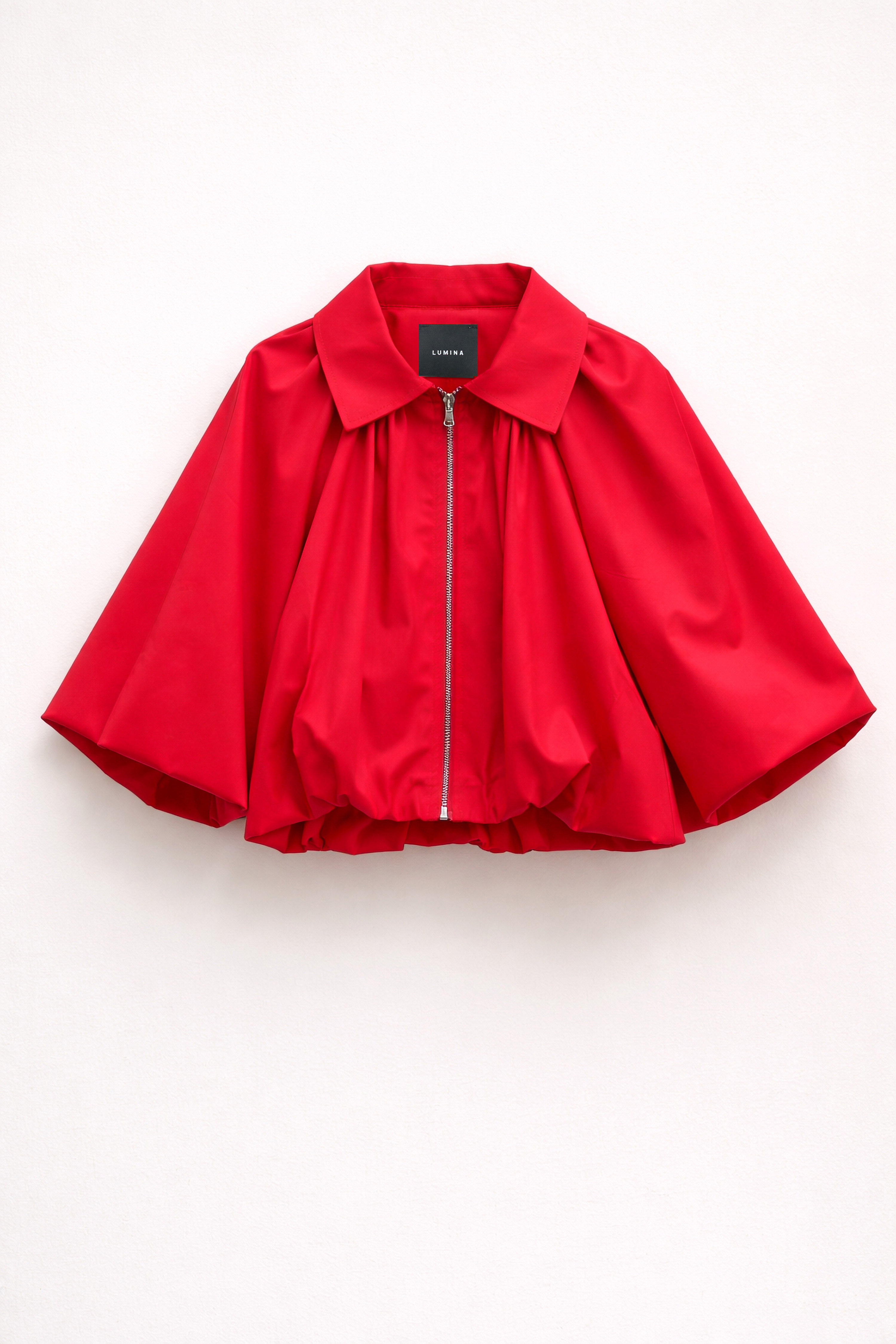 Bomber cropped con colletto a punta. Maniche lunghe ampie effetto balloon. Polsini con elastico interno arricciato. Fondo con elastico per effetto balloon. Costruzione con arricciature sul retro. Chiusura frontale con zip metallica. Vestibilità regolare, disponibile in taglia S/M, M/L.