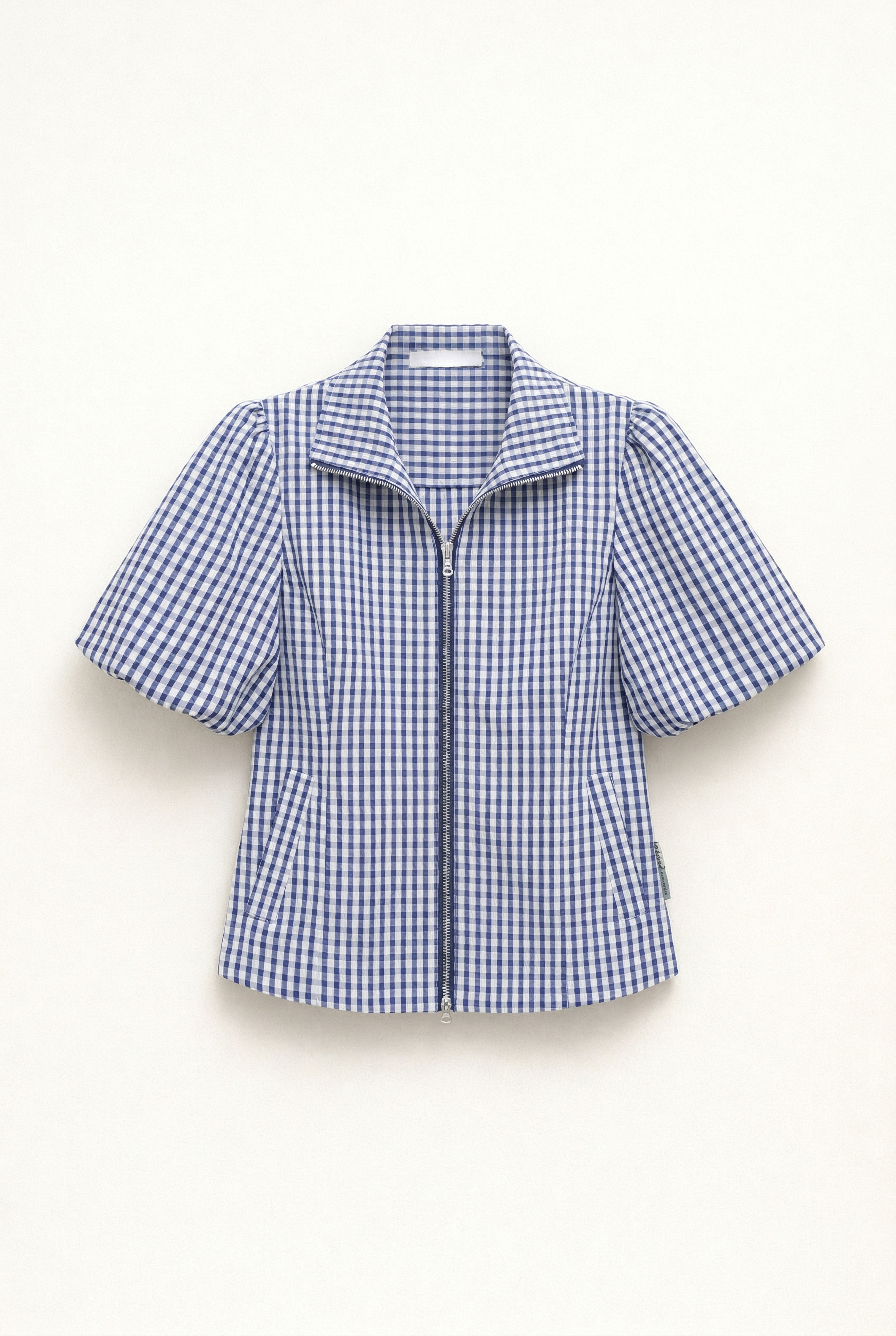Bomber cropped con fantasia vichy a quadretti. Colletto a punta. Maniche corte a sbuffo. Tasche frontali laterali inserite. Fodera interna. Vestibilità regolare, disponibile in taglia S, M, L.