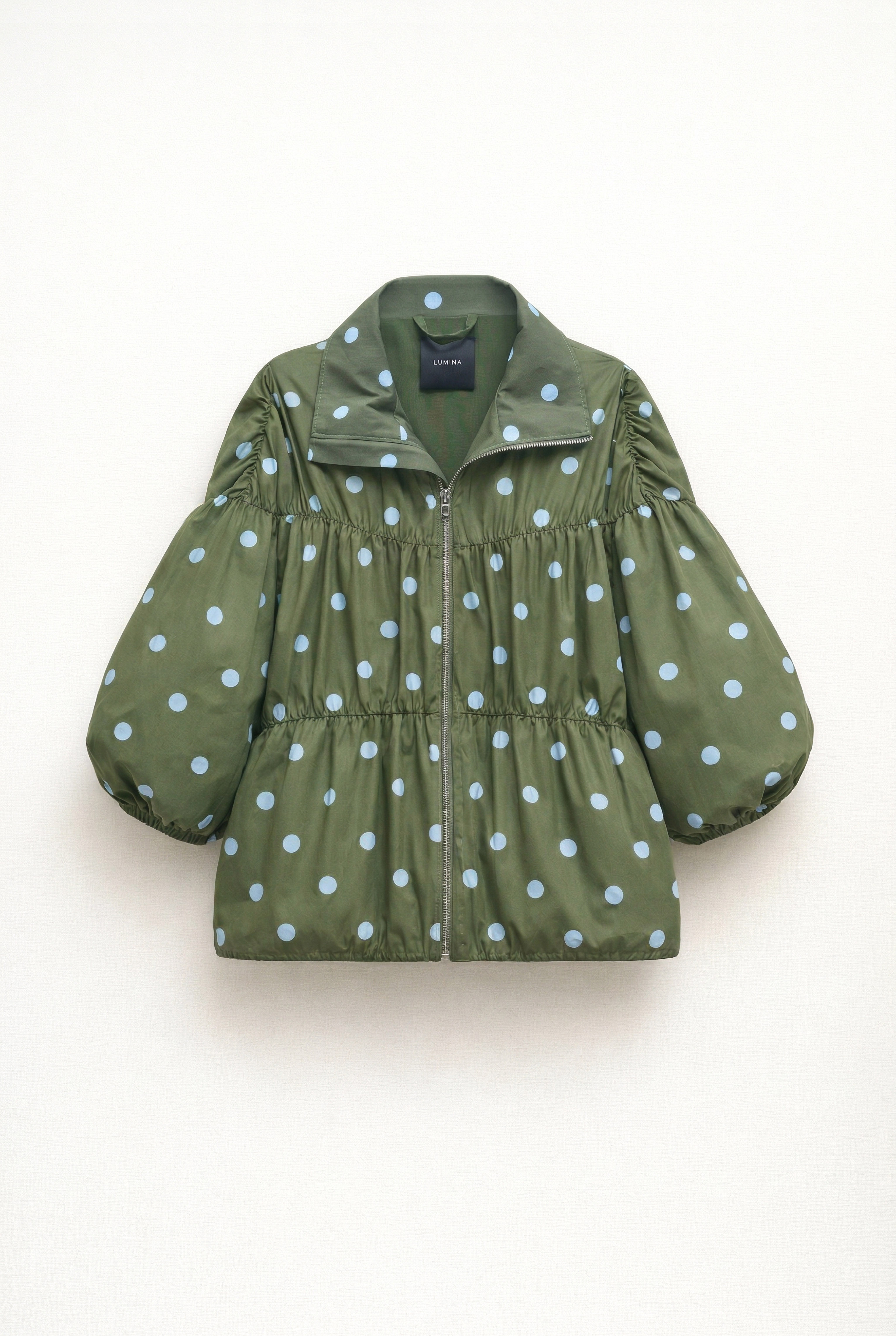 Bomber in misto cotone con stampa a pois. Colletto a punta. Foderato internamente. Costruzione a pannelli con arricciature orizzontali. Maniche lunghe ampie. Fondo elasticizzato effetto balloon. Chiusura frontale con cerniera in metallo. Vestibilità regolare, disponibile in taglia UNICA.