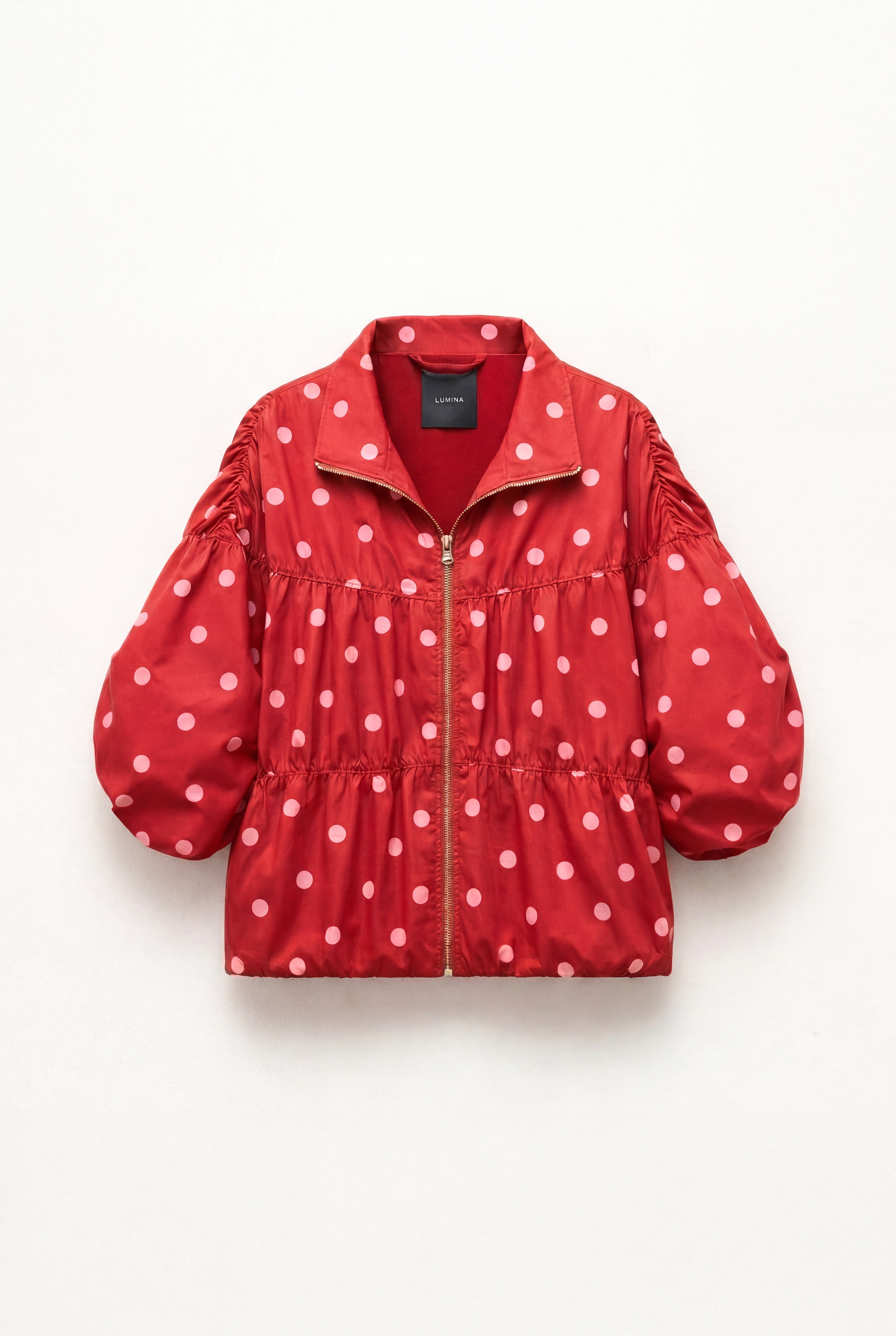 Bomber in misto cotone con stampa a pois. Colletto a punta. Foderato internamente. Costruzione a pannelli con arricciature orizzontali. Maniche lunghe ampie. Fondo elasticizzato effetto balloon. Chiusura frontale con cerniera in metallo. Vestibilità regolare, disponibile in taglia UNICA.