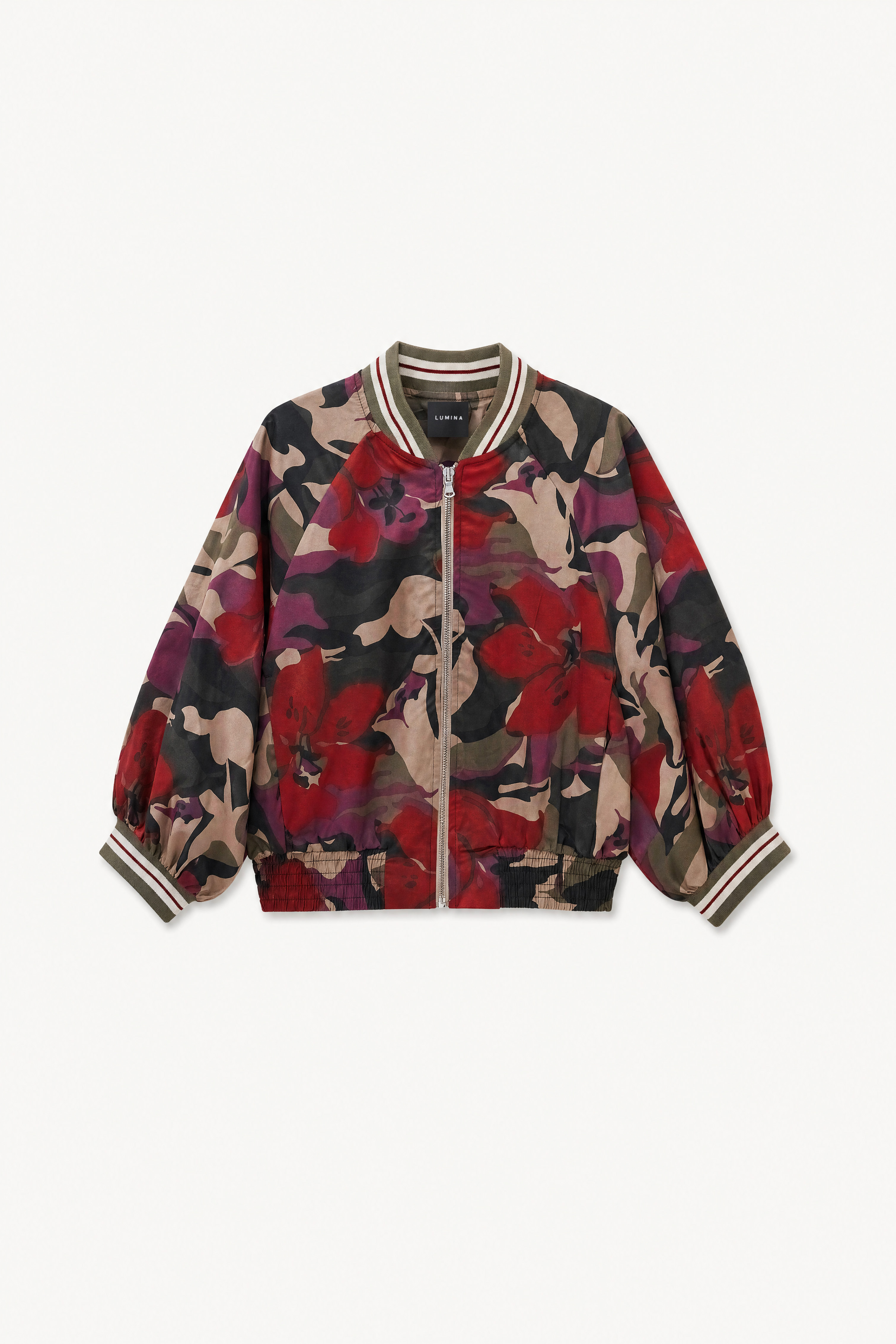 Bomber cropped con stampa camouflage. Collo rifinito a costine. Maniche a tre quarti ampie. Fondo con elastico arricciato effetto balloon. Chiusura frontale con cerniera metallica. Vestibilità regolare, disponibile in taglia S/M, M/L.
