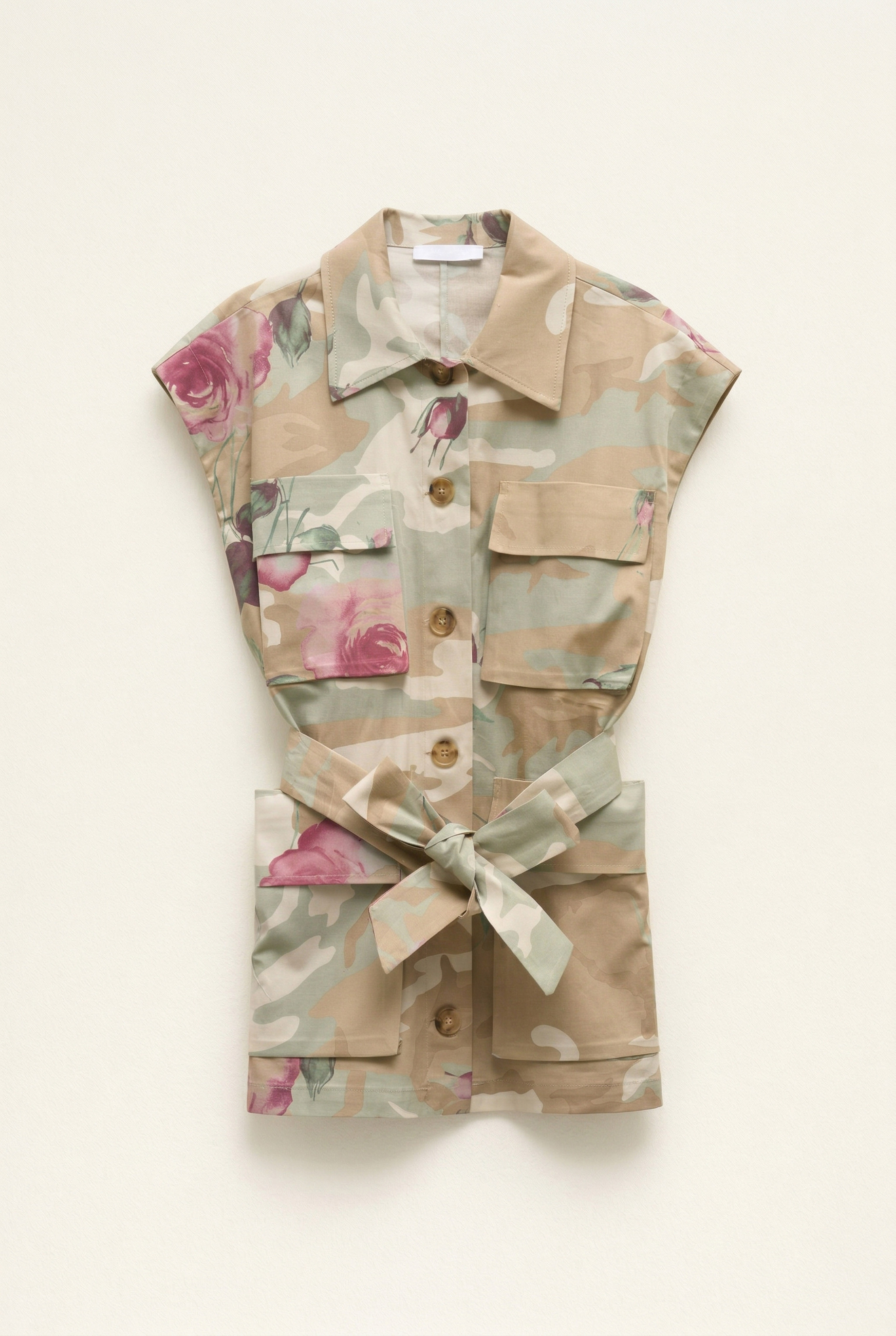 Colletto a punta strutturato. Tasche frontali applicate con patta.