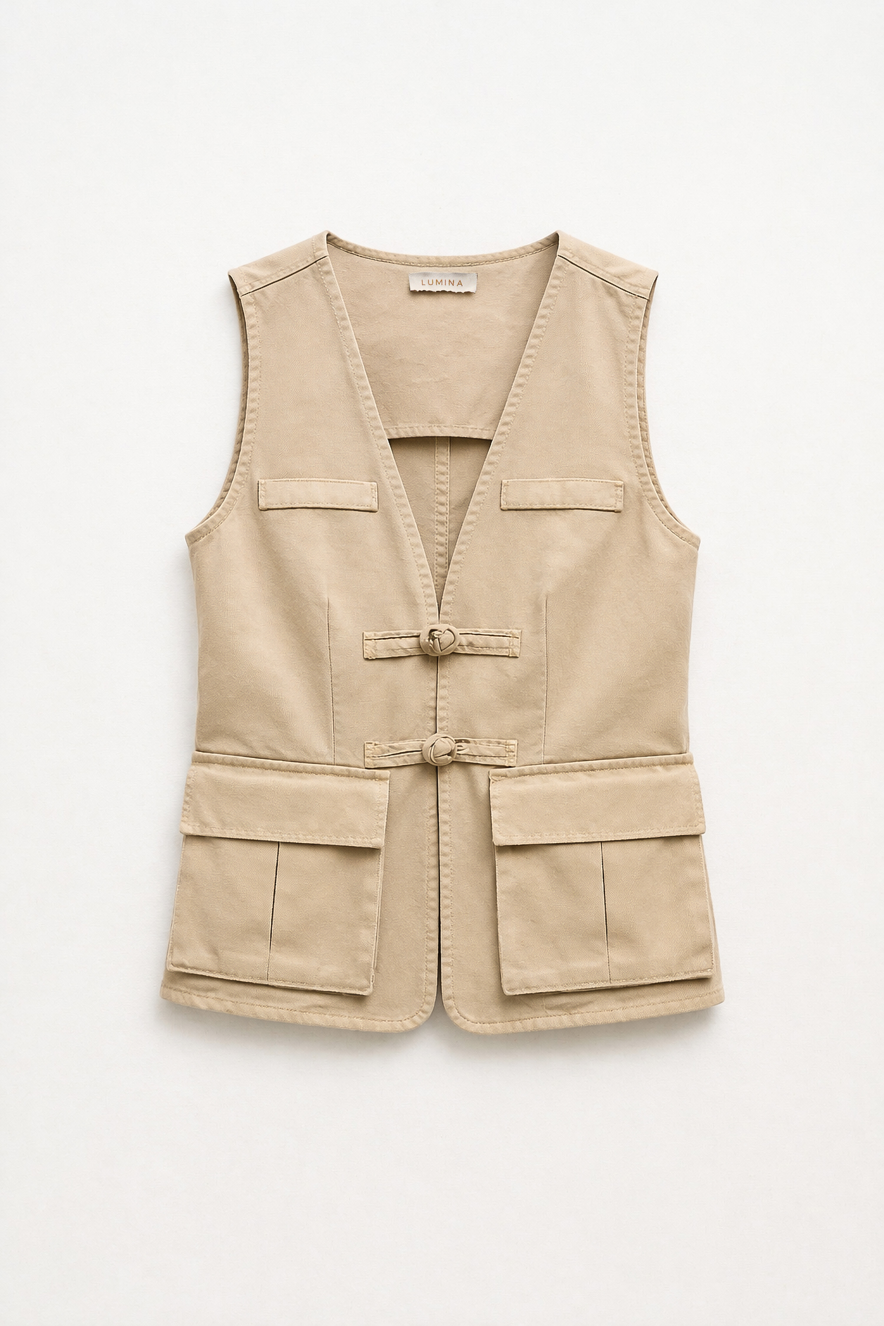 Gilet cargo smanicato con scollo a V. Tasche decorative applicate con patta sul petto. Tasche cargo applicate sul davanti. Chiusura frontale con nodi decorativi. Vestibilità regolare, disponibile in taglia S, M, L.