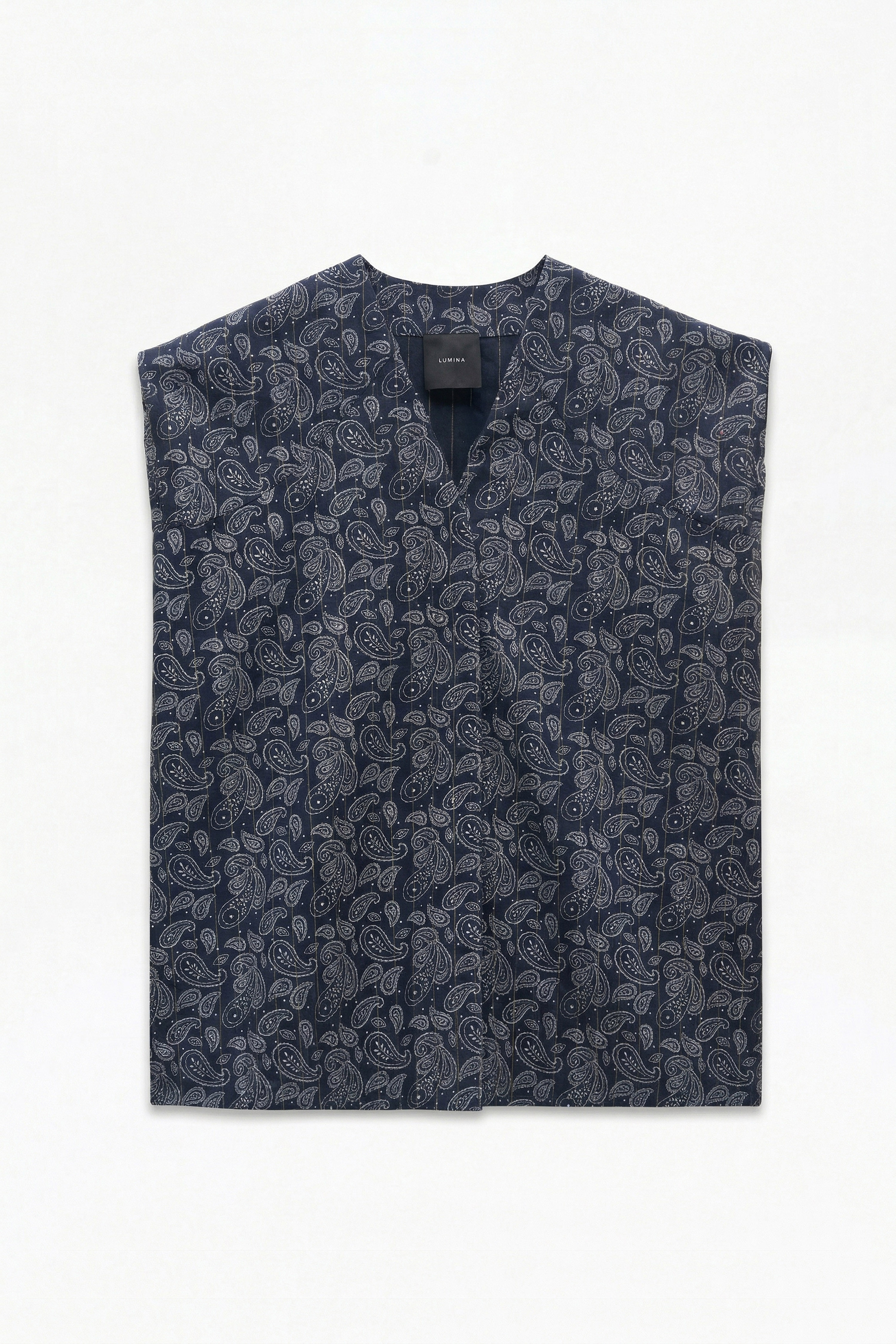 Gilet oversize a righe con stampa paisley. Scollo a V. Modello smanicato con risvolto. Chiusura frontale con bottoni nascosti. Vestibilità oversize, disponibile in taglia UNICA.