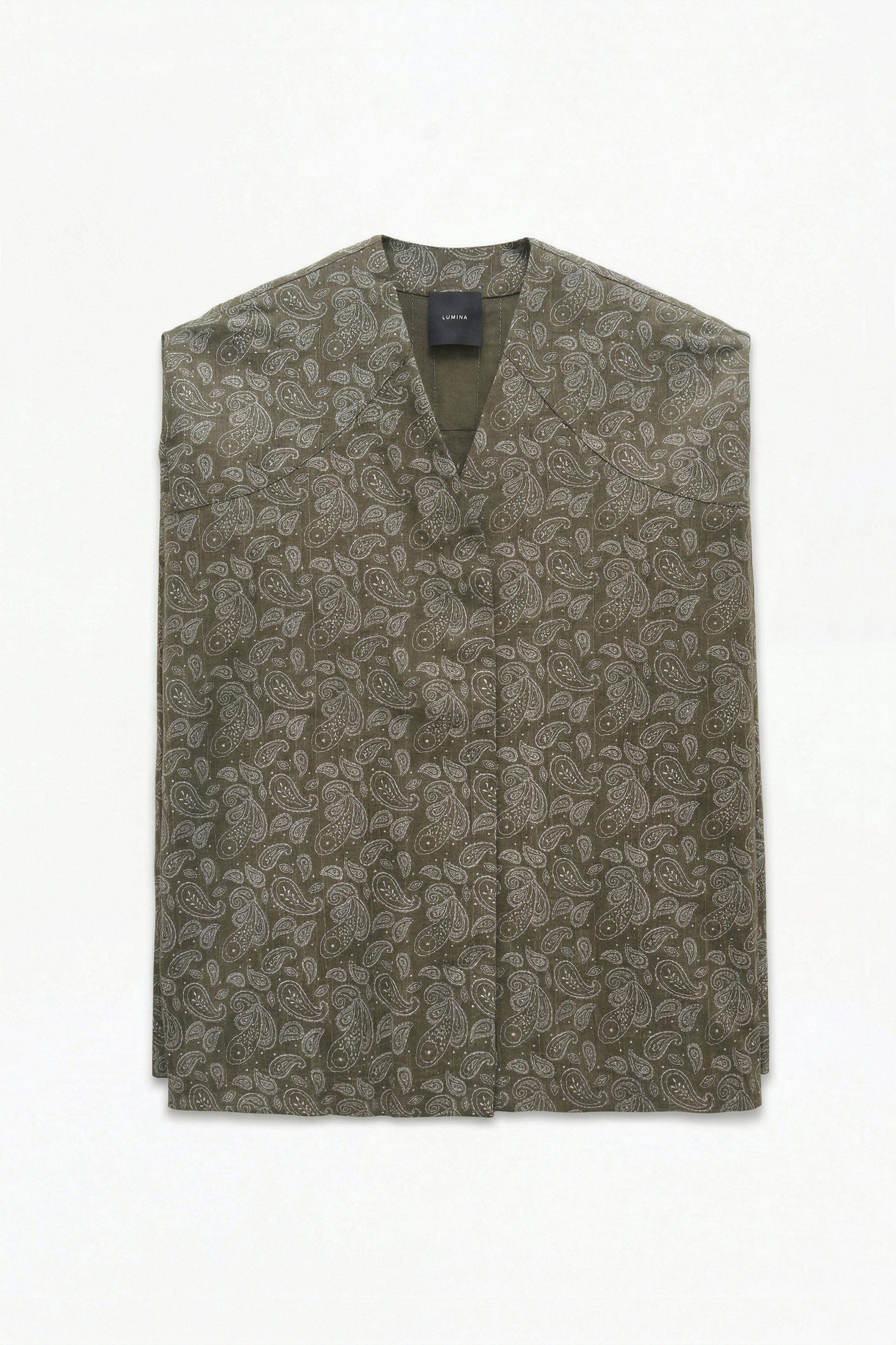 Gilet oversize a righe con stampa paisley. Scollo a V. Modello smanicato con risvolto. Chiusura frontale con bottoni nascosti. Vestibilità oversize, disponibile in taglia UNICA.