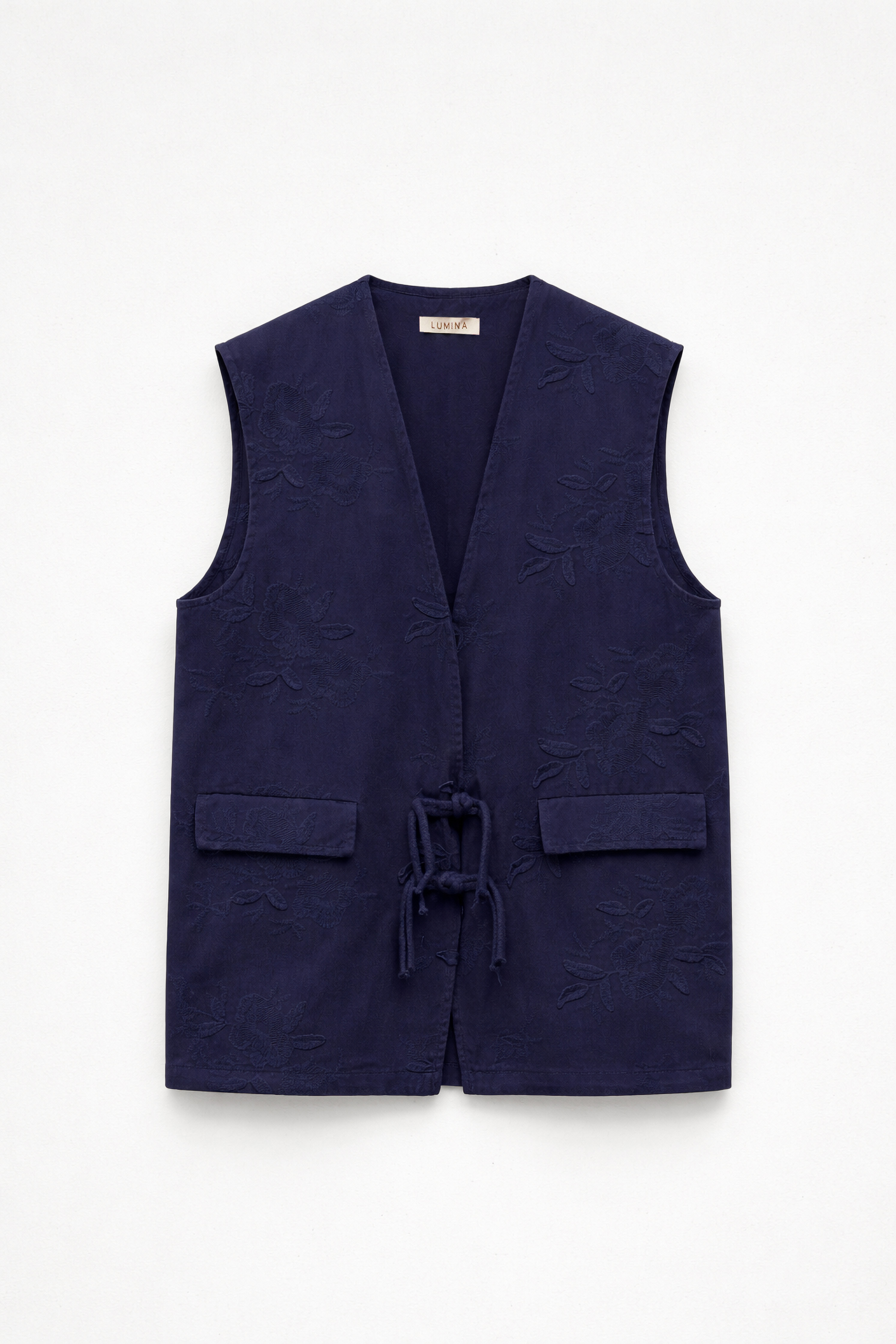 Gilet in cotone con ricami floreali in rilievo. Scollo a V. Modello senza maniche. Tasche frontali decorative applicate con patta. Chiusura frontale con nodi decorativi. Vestibilità regolare, disponibile in taglia S, M, L.