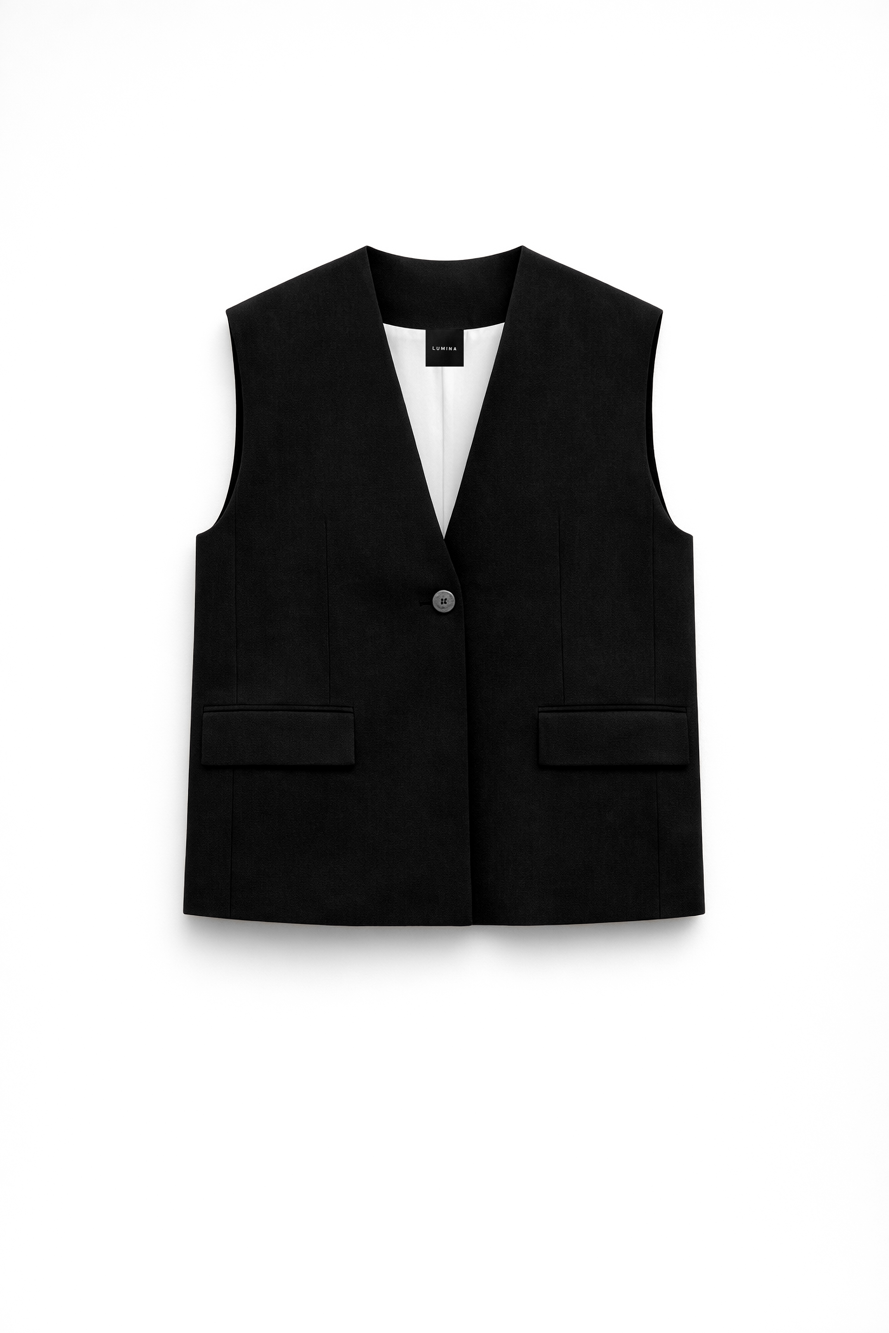 Colletto a punta strutturato. Tasche frontali applicate con patta.