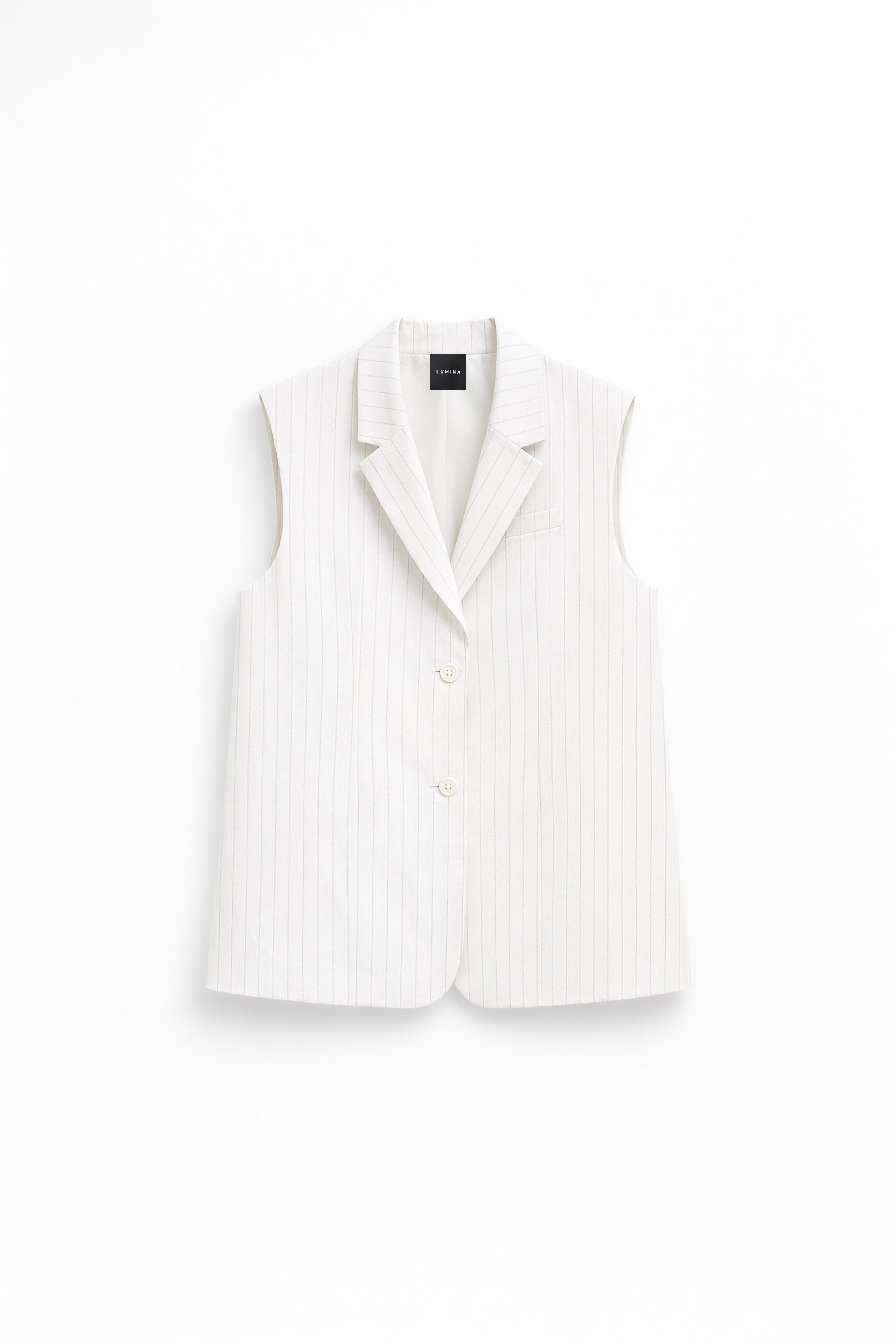 Gilet strutturato con motivo a righe. Scollo con revers. Design senza maniche. Taschino sul petto a filetto. Fodera interna. Chiusura frontale con bottoni. Vestibilità regolare, disponibile in taglia S, M, L.