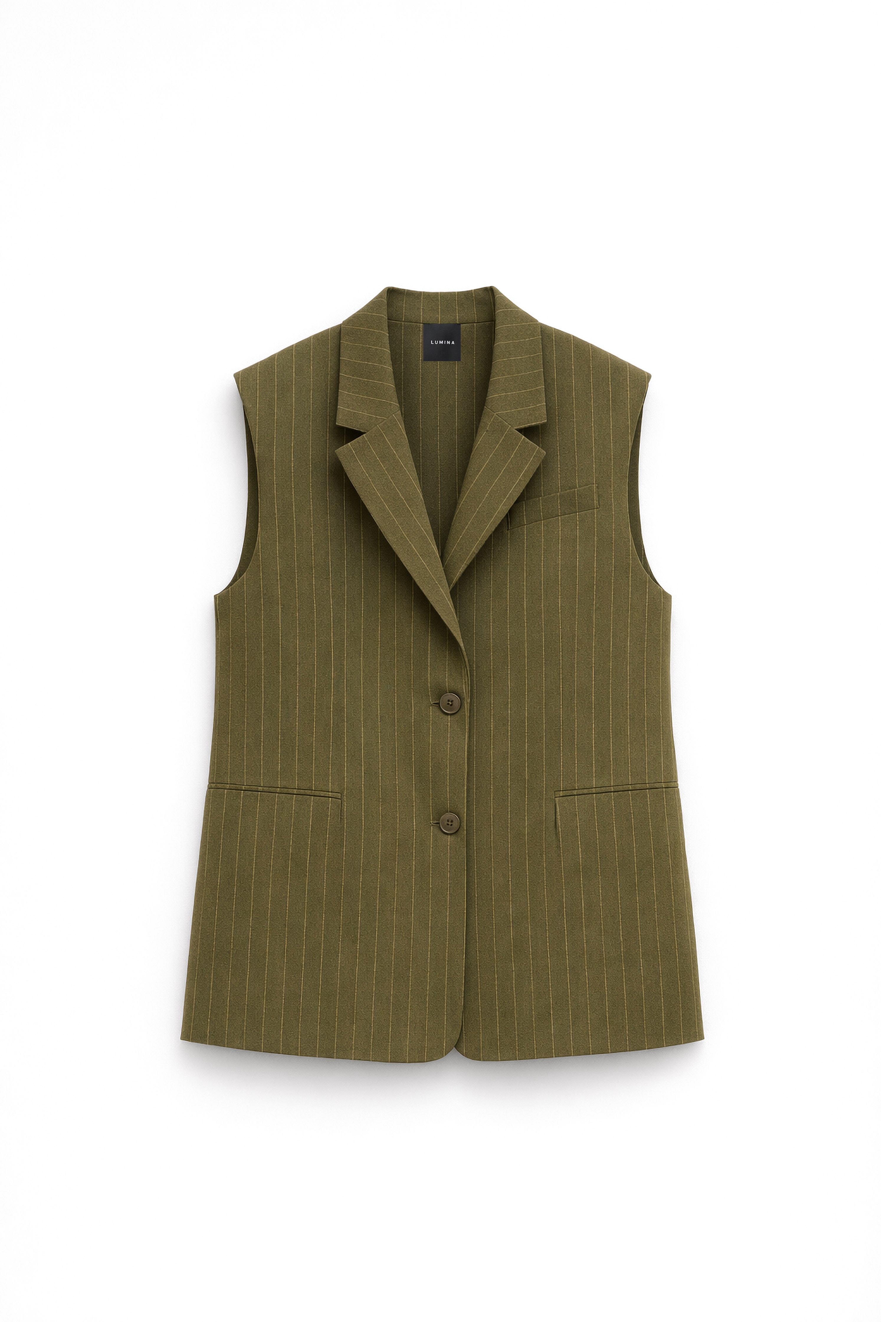 Gilet strutturato con motivo a righe. Scollo con revers. Design senza maniche. Taschino sul petto a filetto. Fodera interna. Chiusura frontale con bottoni. Vestibilità regolare, disponibile in taglia S, M, L.