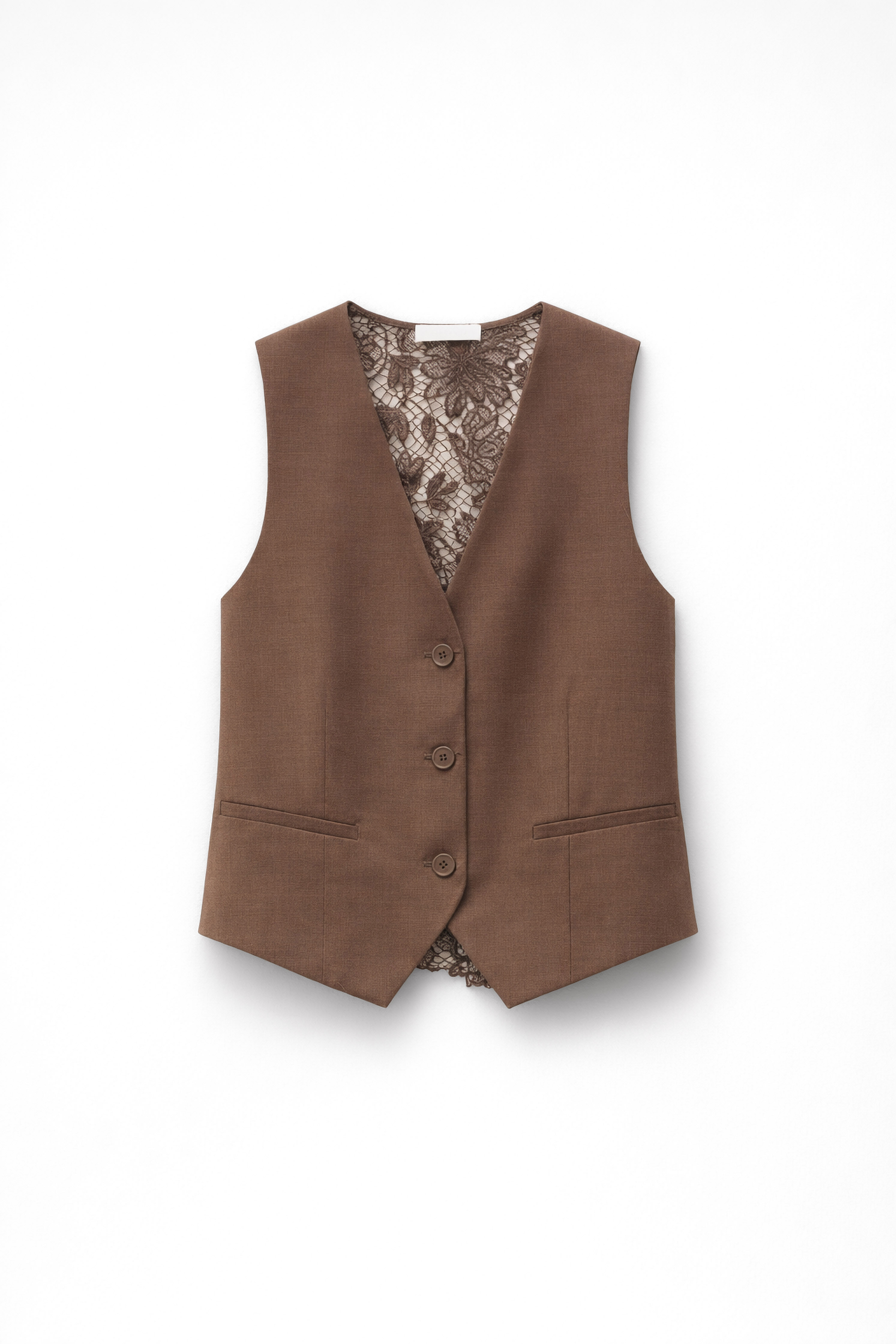 Gilet smanicato in tessuto misto lino. Schiena interamente in pizzo floreale ricamato. Scollo a V profondo. Foderato internamente. Tasche frontali a filetto decorative. Chiusura frontale con bottone tono su tono. Vestibilità regolare, disponibile in taglia S/M, M/L.