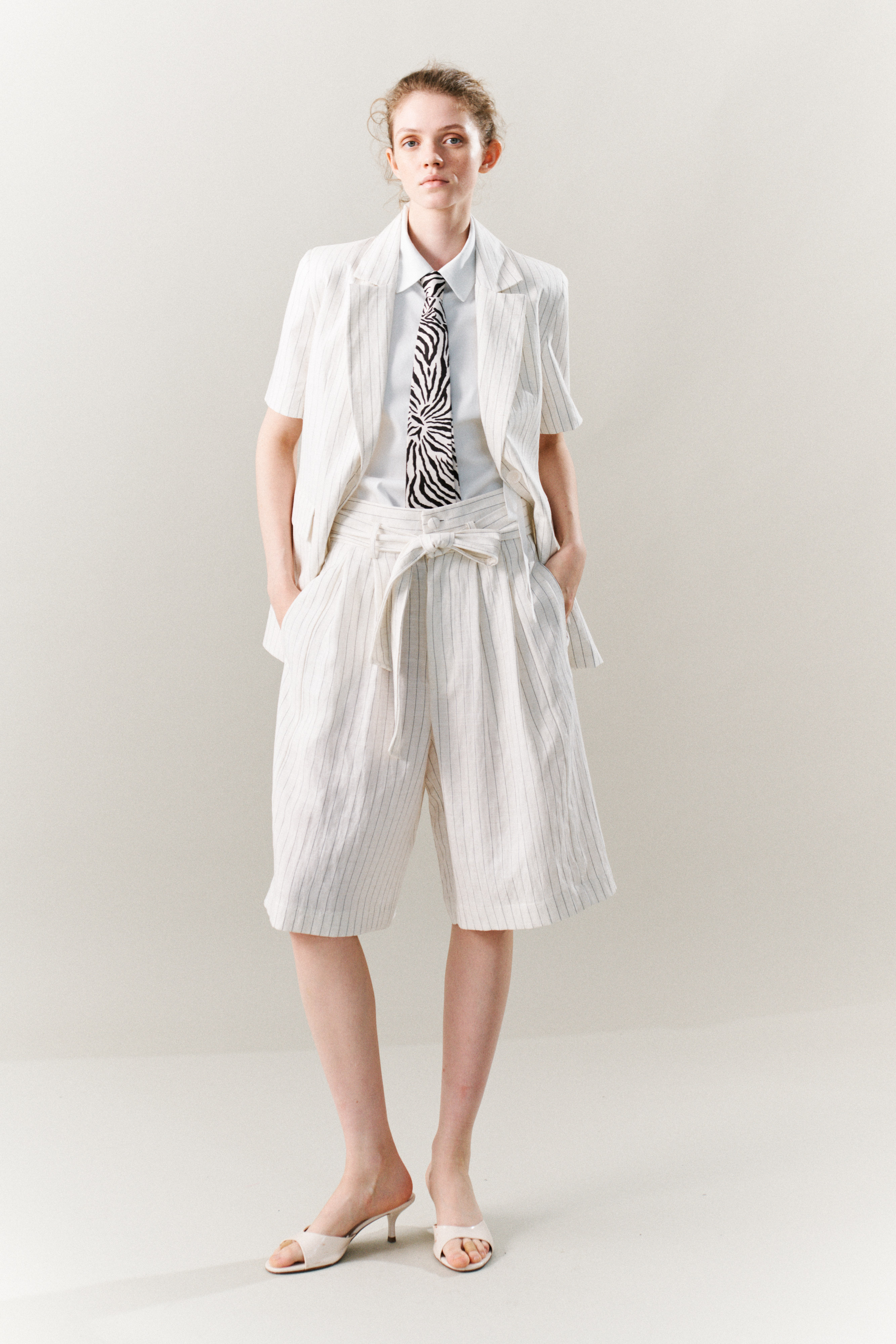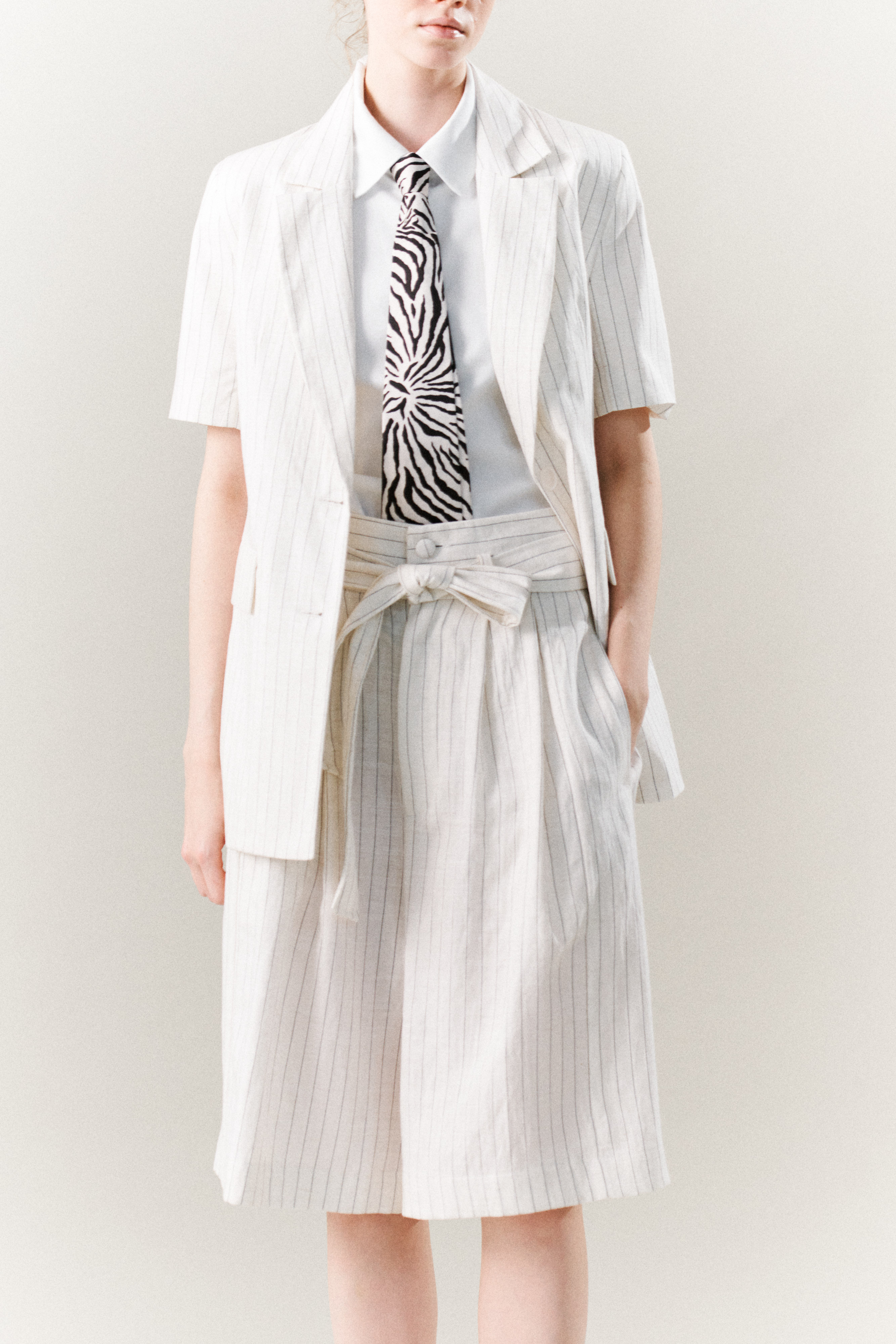 Chiusura frontale con cerniera e bottoni rivestiti.