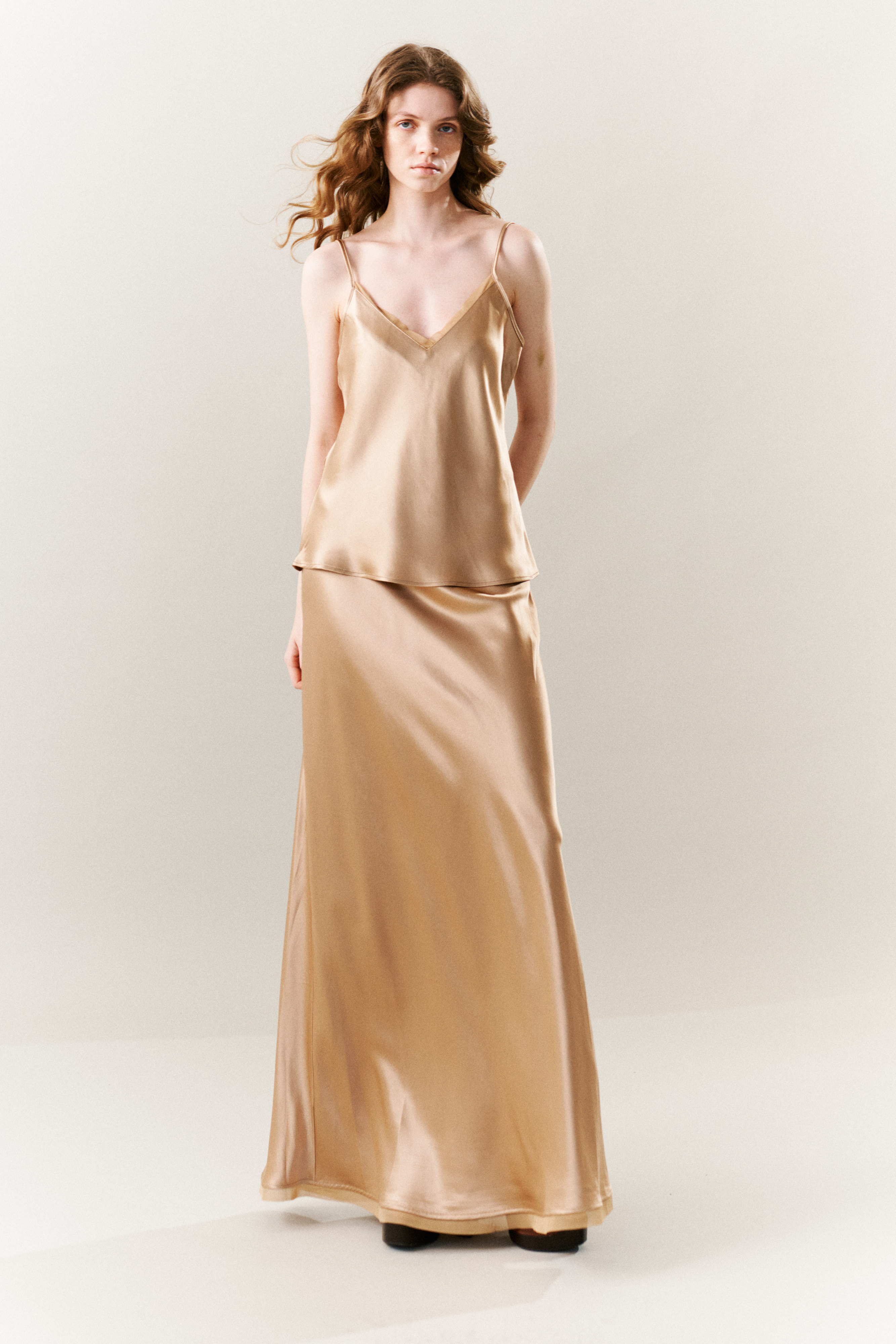 Gonna maxi in raso fluido e satinato. Vita lineare. Fondo leggermente svasato. Orlo rifinito con bordo in tessuto coordinato. Vestibilità regolare, disponibile in taglia S, M, L.
