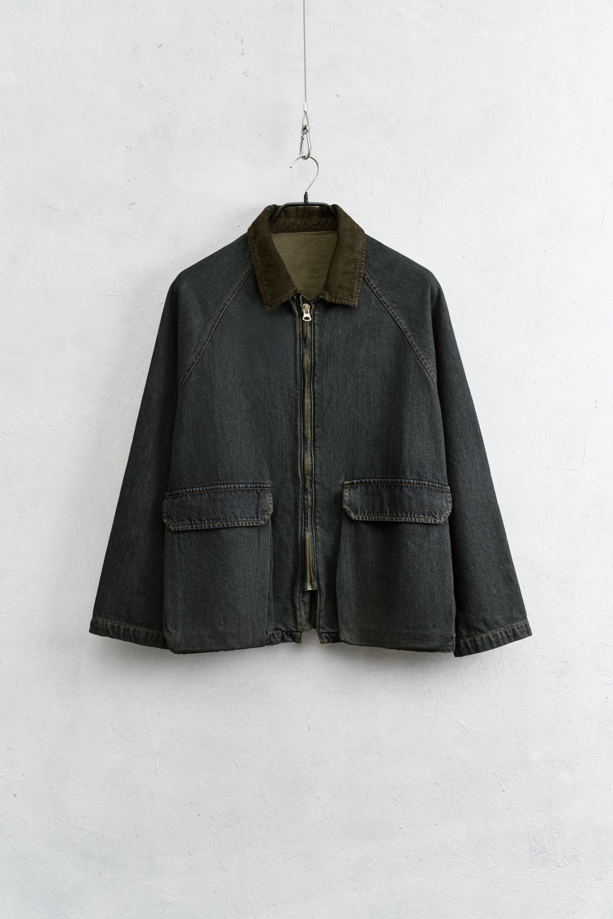 Presenta collo a revers e quattro tasche anteriori.