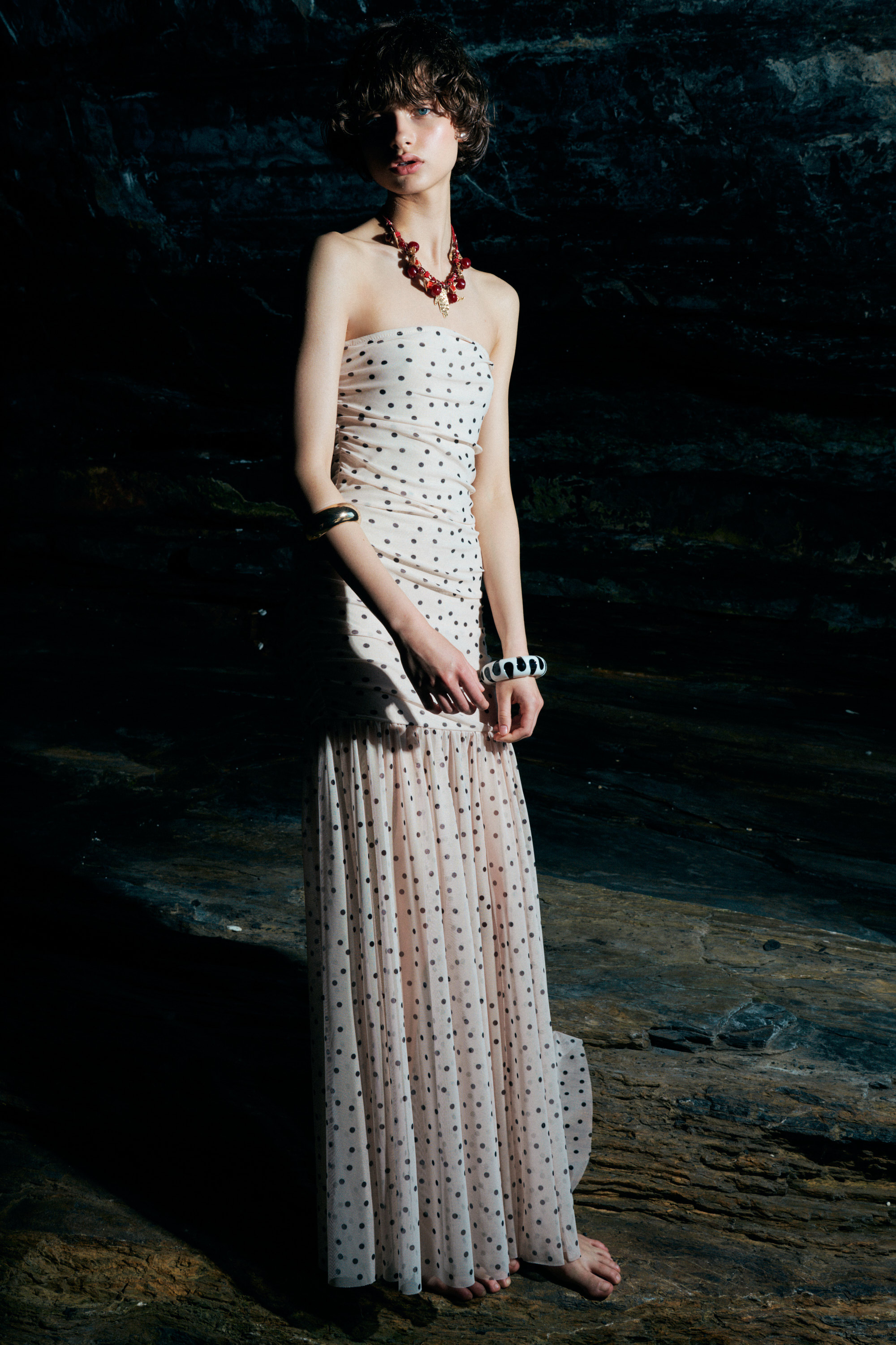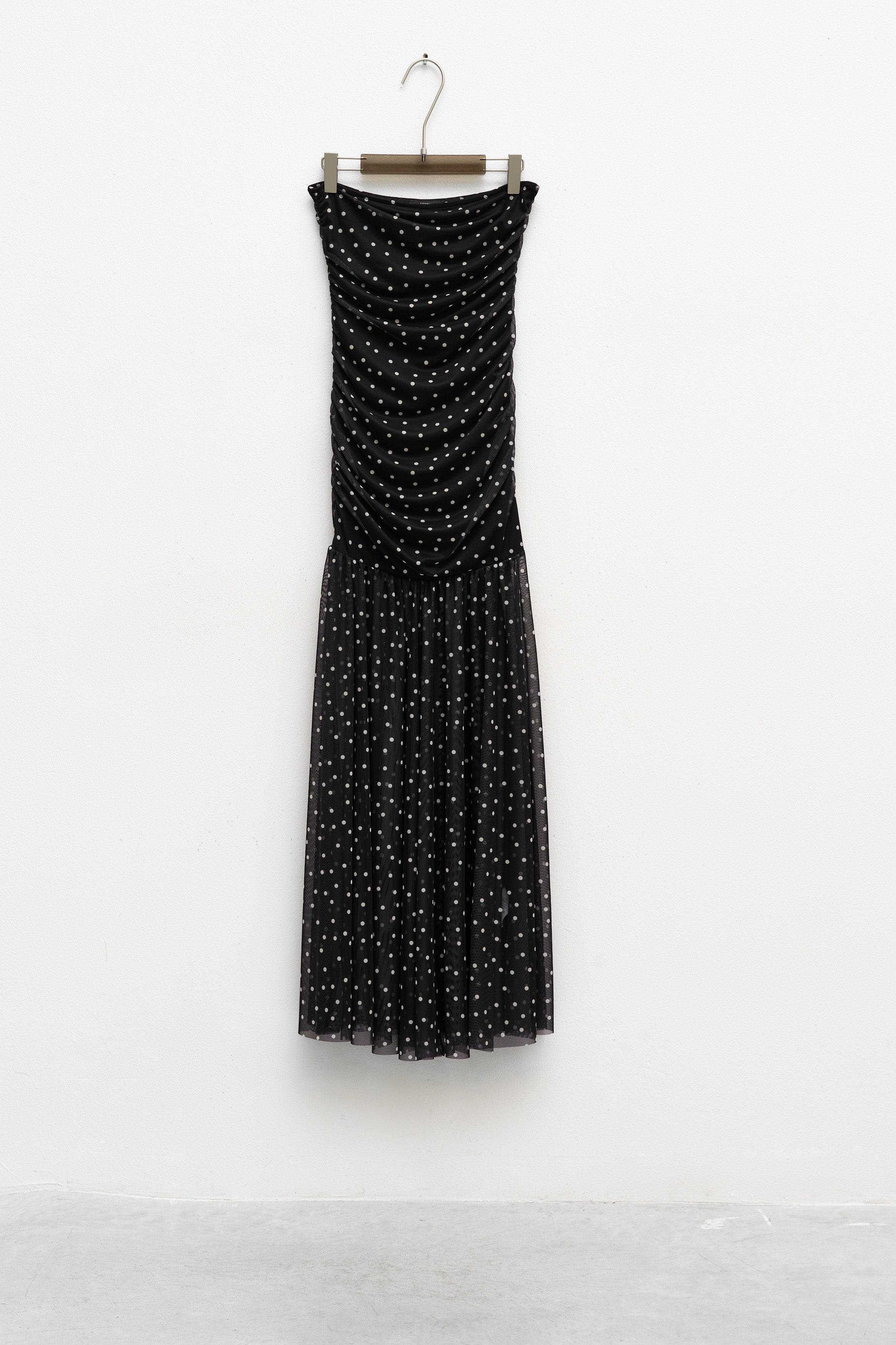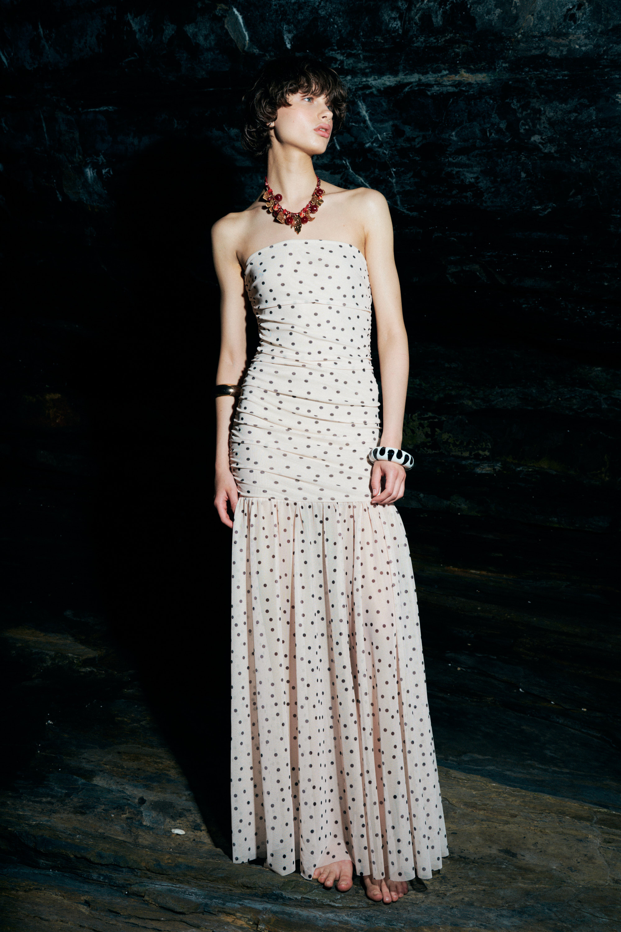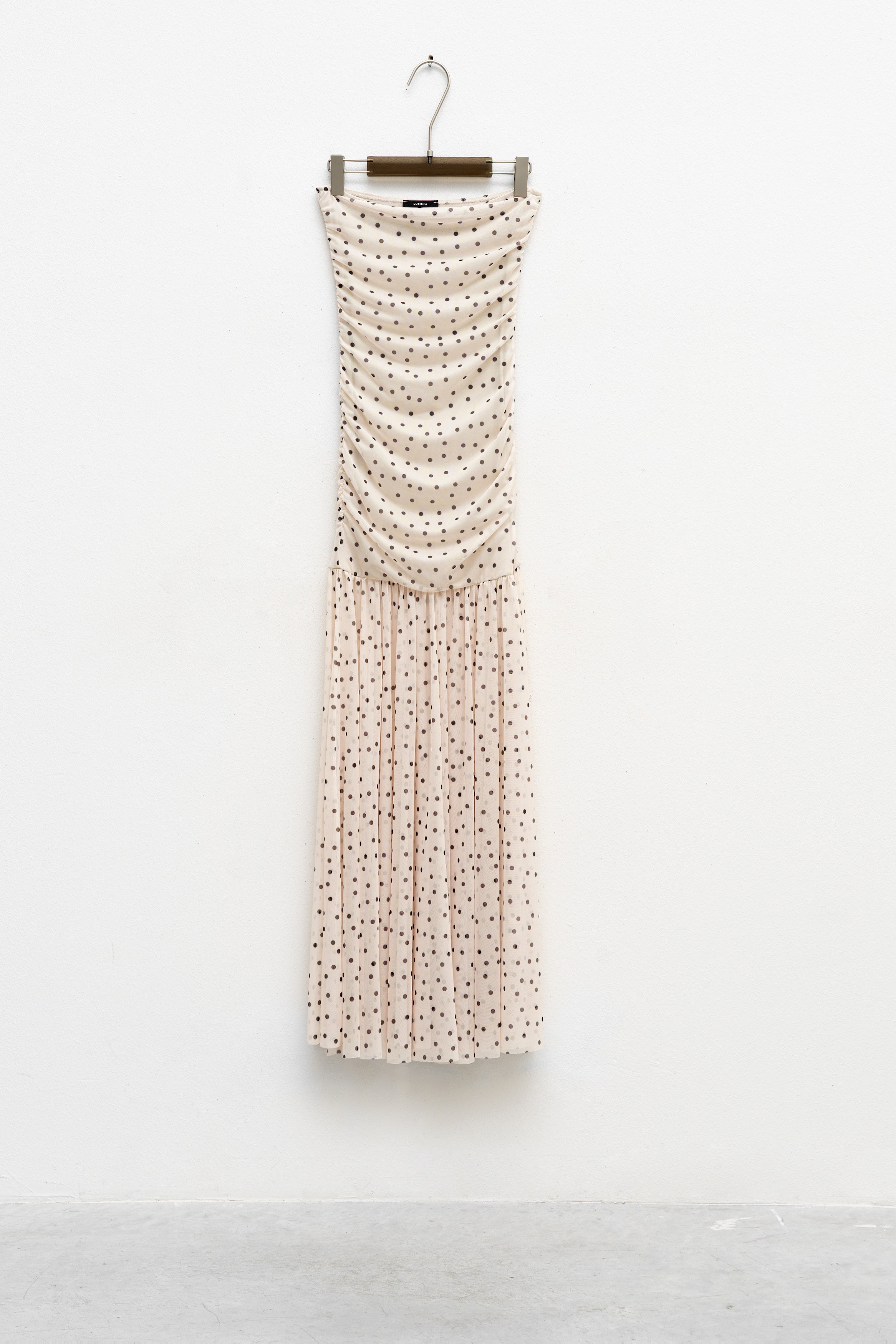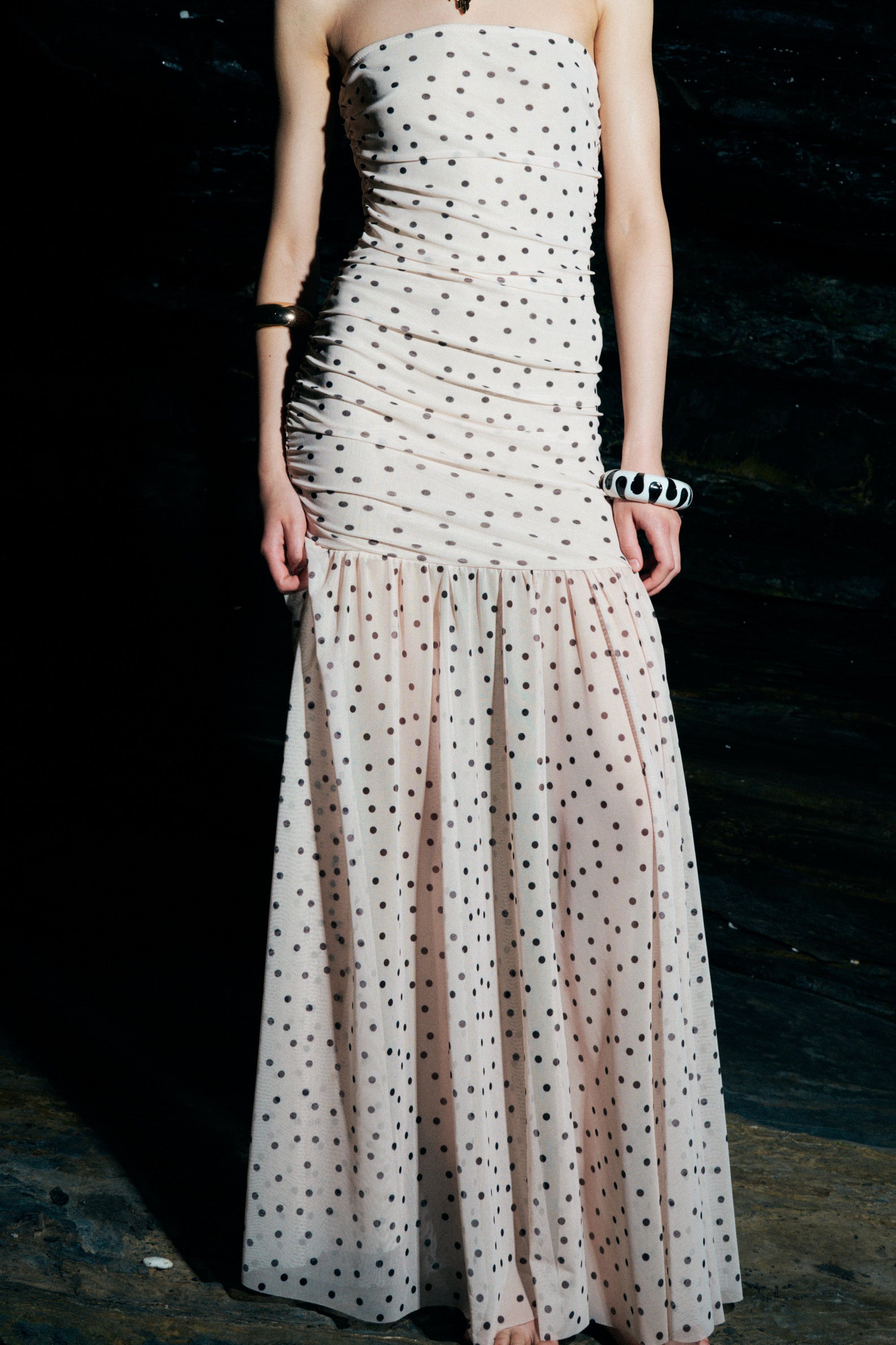 Abito halter in tulle con fantasia a pois e scollo morbido.