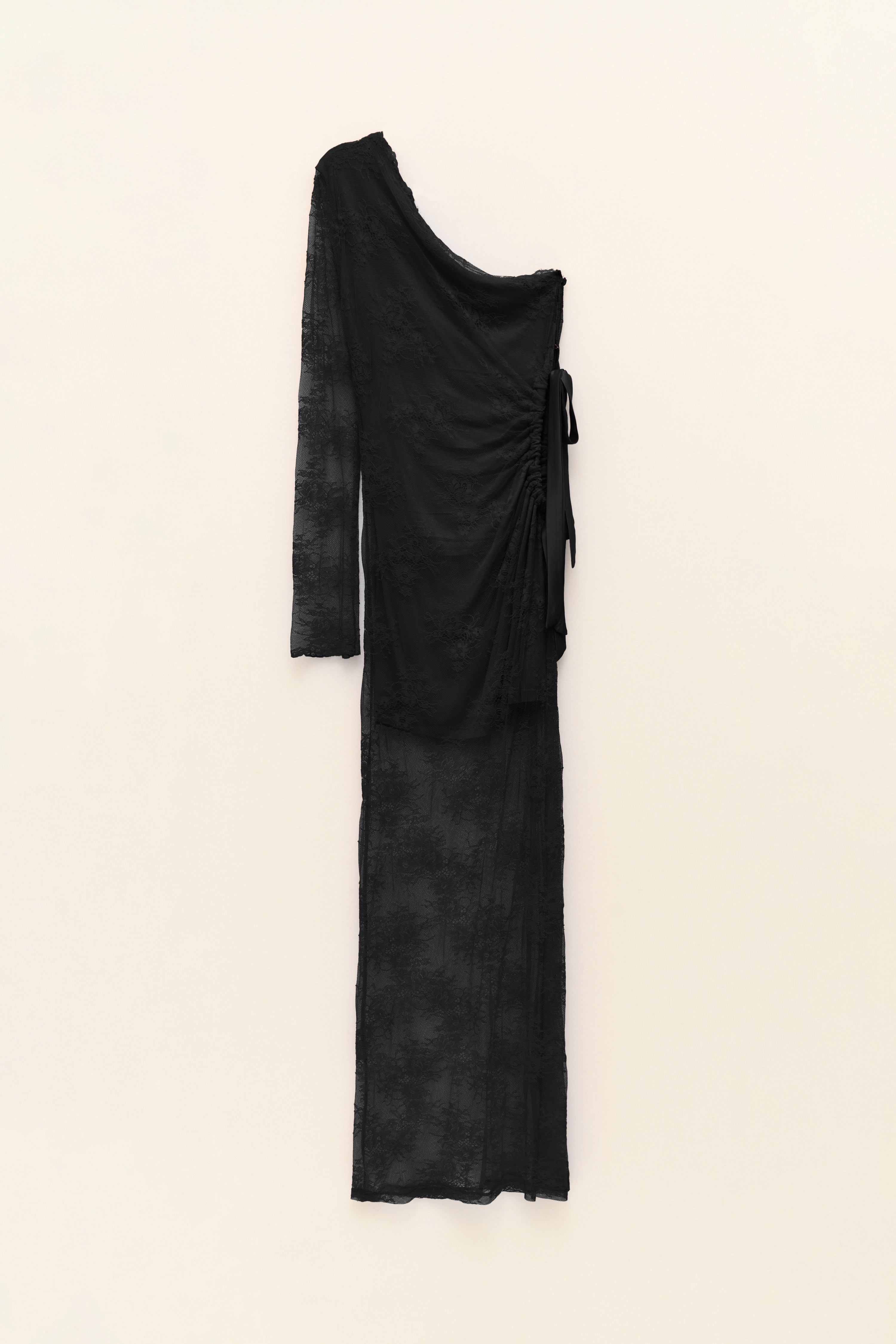 Abito lungo monospalla in pizzo trasparente. Dettaglio drappeggiato sul fianco. Fodera interna. Chiusura laterale con bottone e nastro. Vestibilità aderente, disponibile in taglia S, M, L.