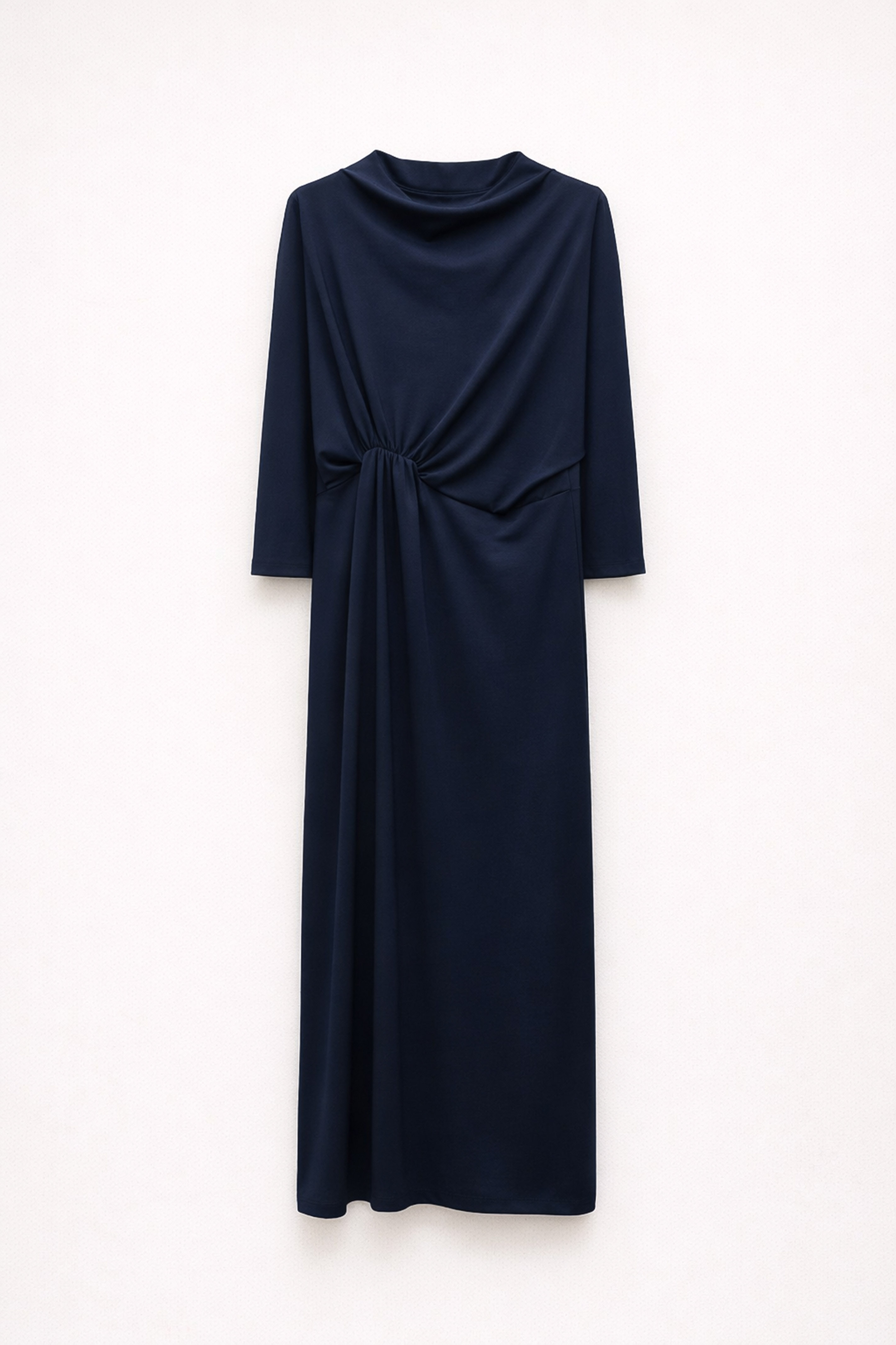 Abito lungo con scollo a barchetta. Maniche ampie stile kimono. Drappeggio frontale con punto vita definito. Chiusura con cerniera invisibile sul retro. Vestibilità regolare, disponibile in taglia S/M, M/L.