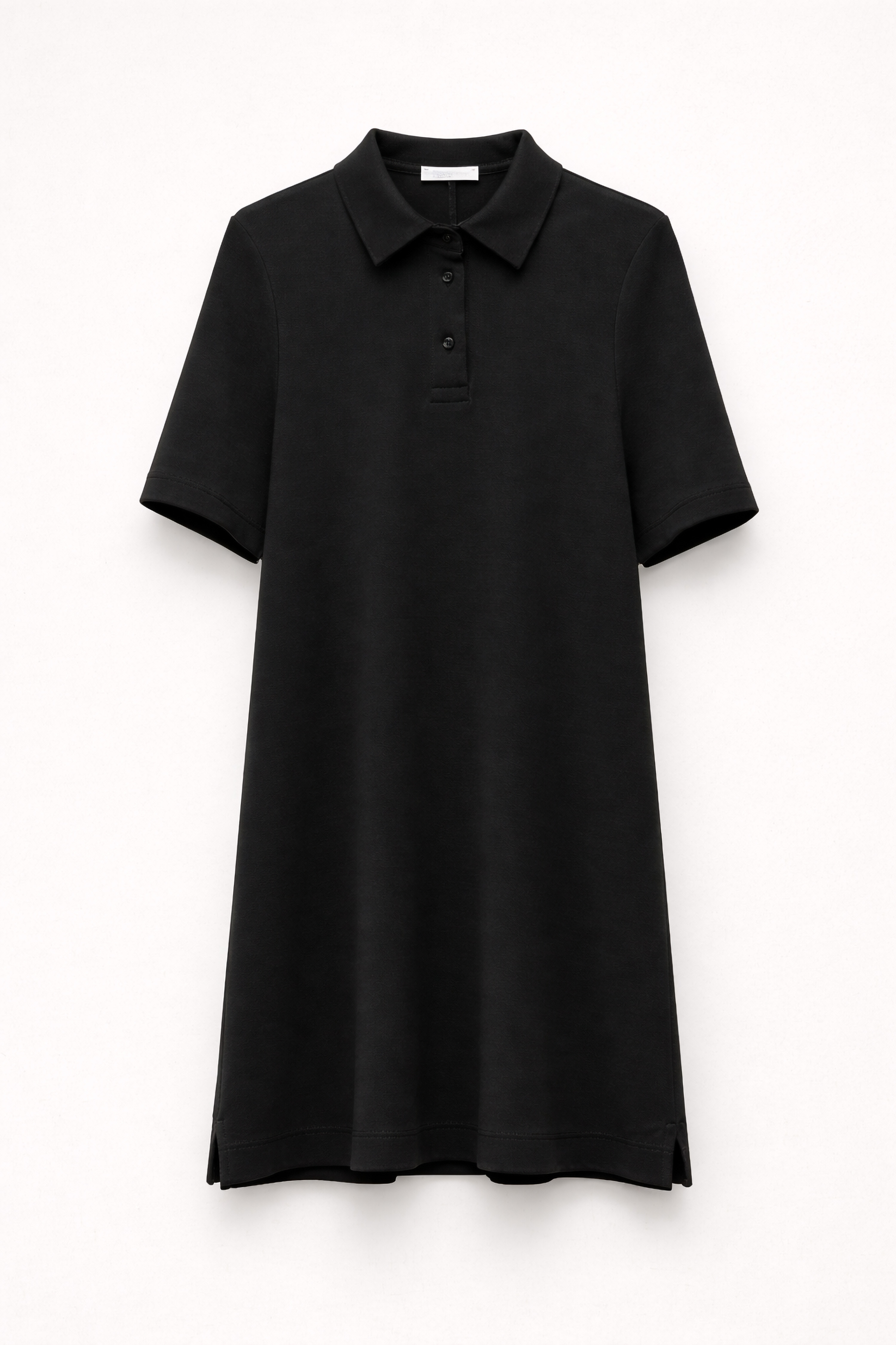 Abito midi con colletto a polo. Abbottonatura frontale con bottoni. Manica a metà braccio. Spalla regolare. Presenta piccoli spacchi laterali sul fondo. Vestibilità regolare, disponibile in taglia S/M, M/L.