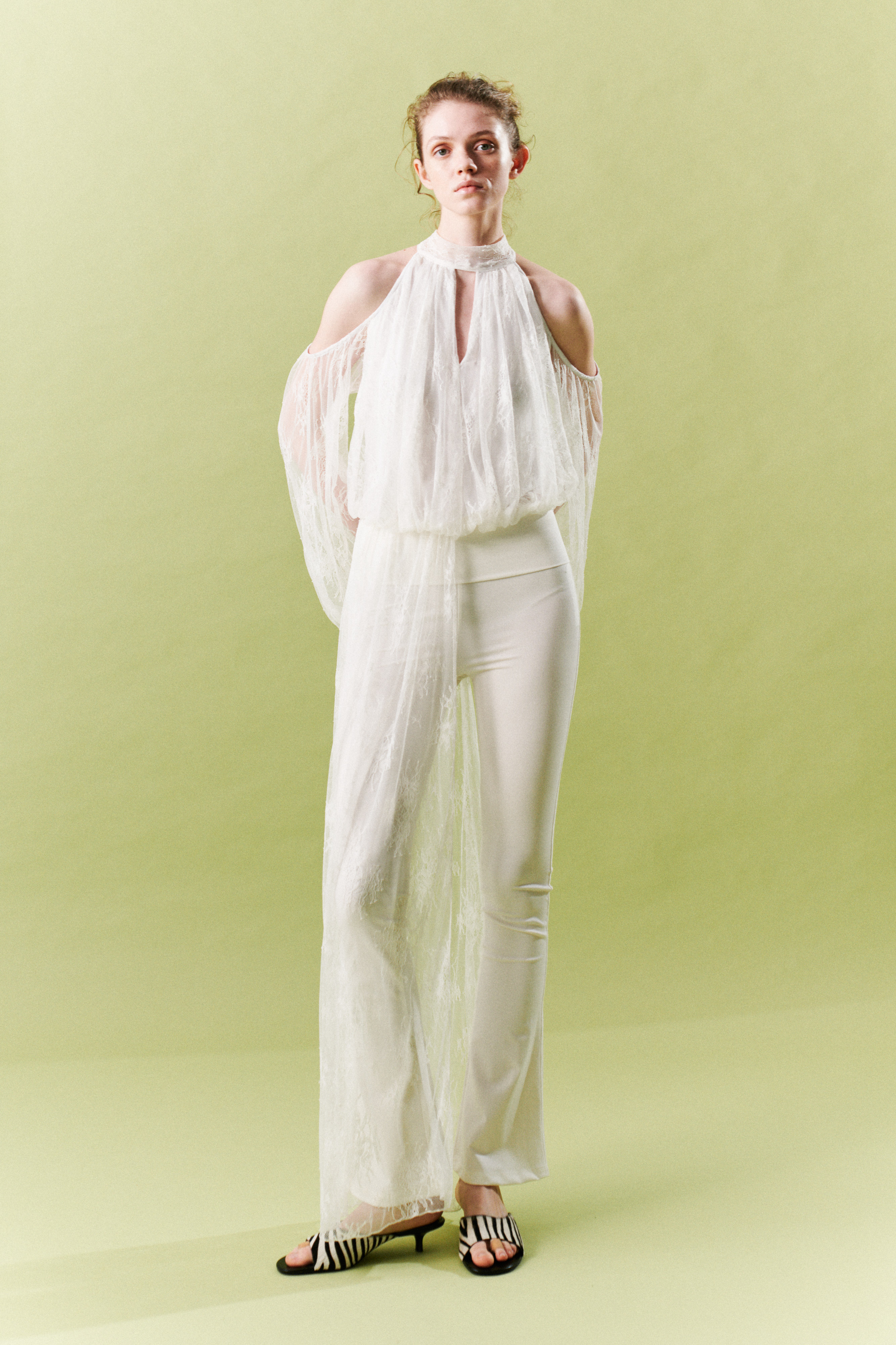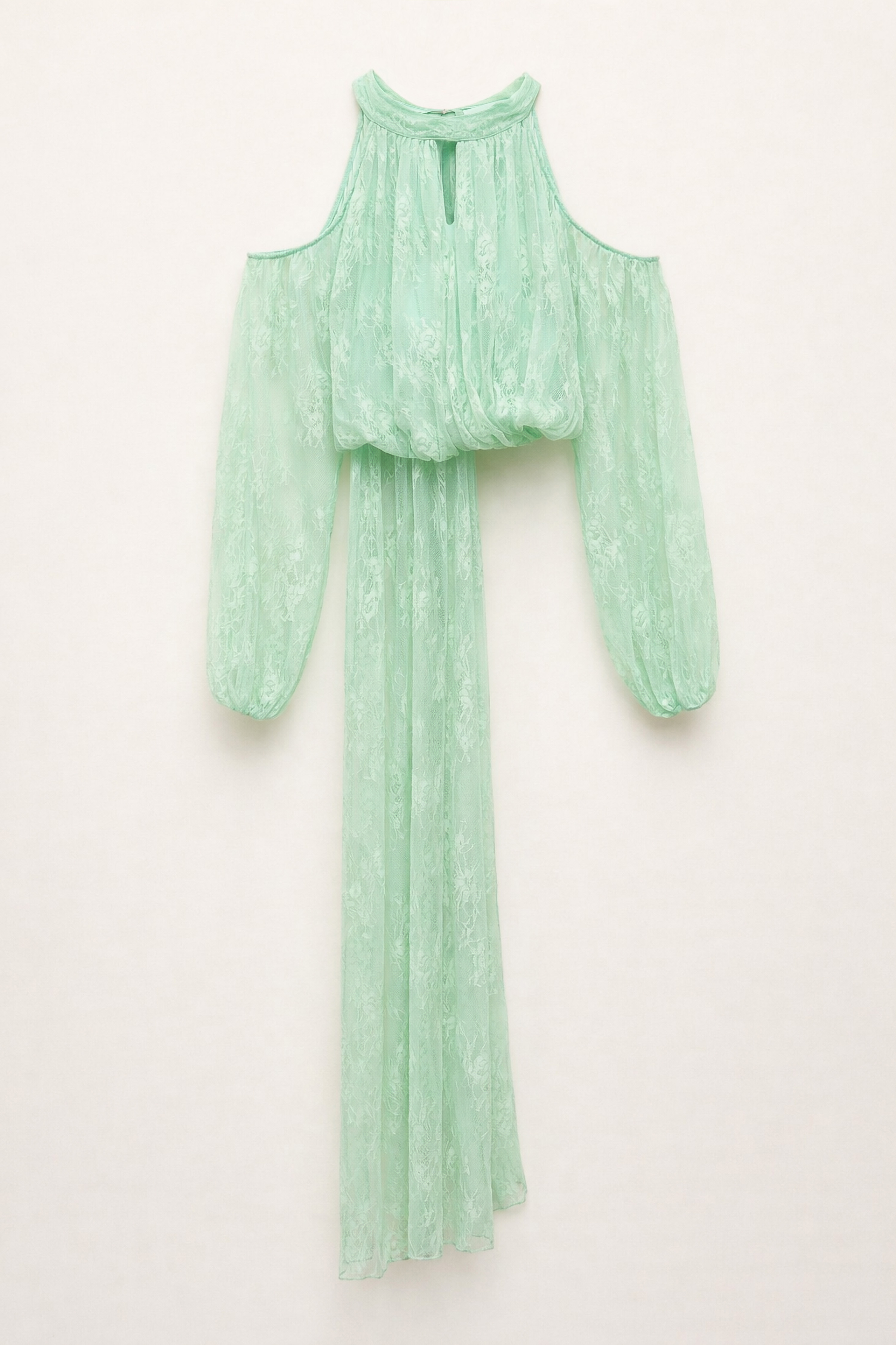 Abito in tulle con ricamo in pizzo floreale. Collo halter con drappeggio e chiusura a nodo sul retro. Apertura frontale a goccia sul busto. Fodera interna. Maniche lunghe ampie con spalle scoperte. Presenta volant lungo laterale. Vestibilità regolare, disponibile in taglia S/M, M/L.