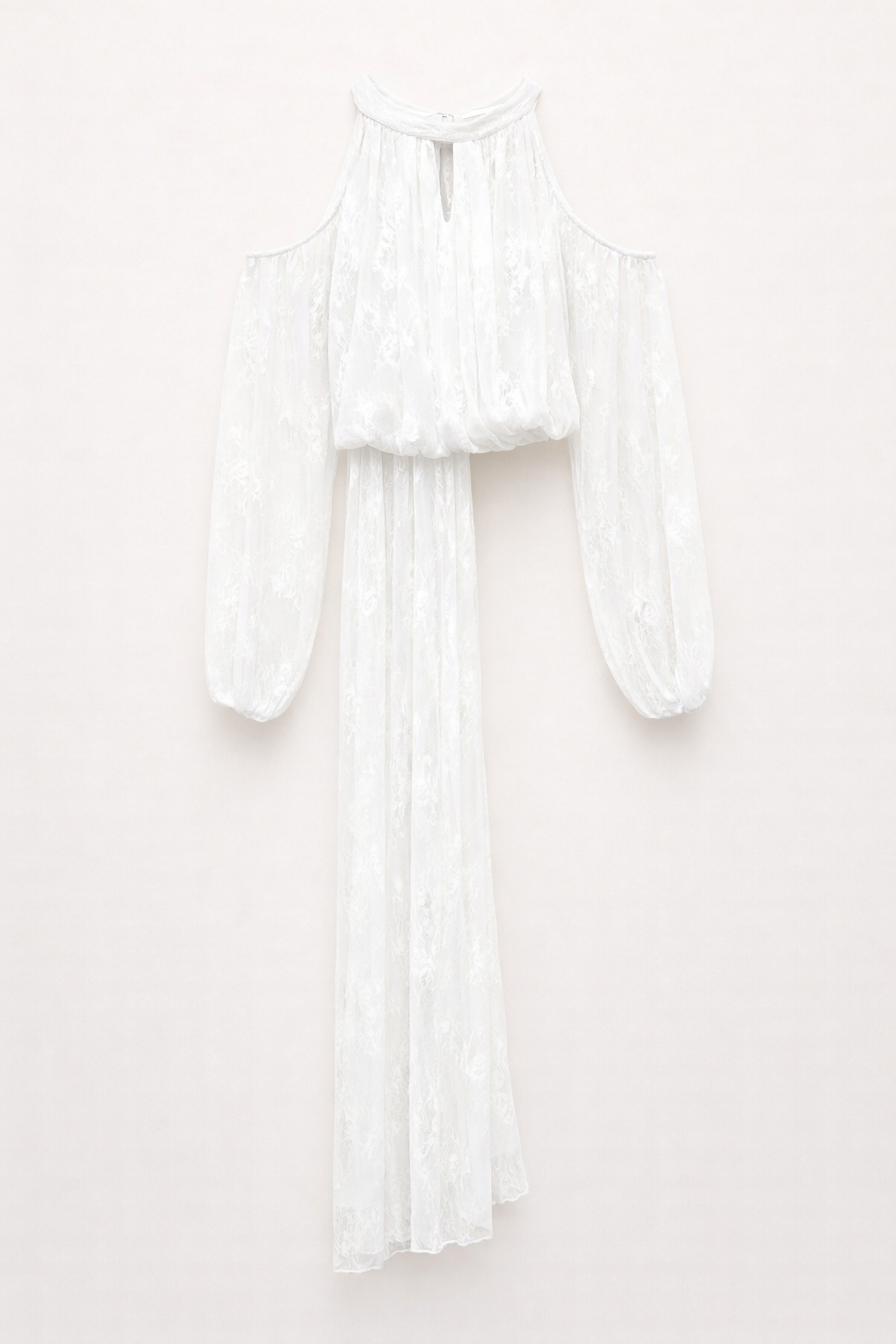 Abito lungo in sangallo con motivo floreale. Scollo alto con spalline sottili regolabili. Schiena scoperta ampia con chiusura regolabile. Chiusura laterale con zip invisibile. Gonna lunga ampia e fluida. Fodera interna. Vestibilità regolare, disponibile in taglia S, M, L.