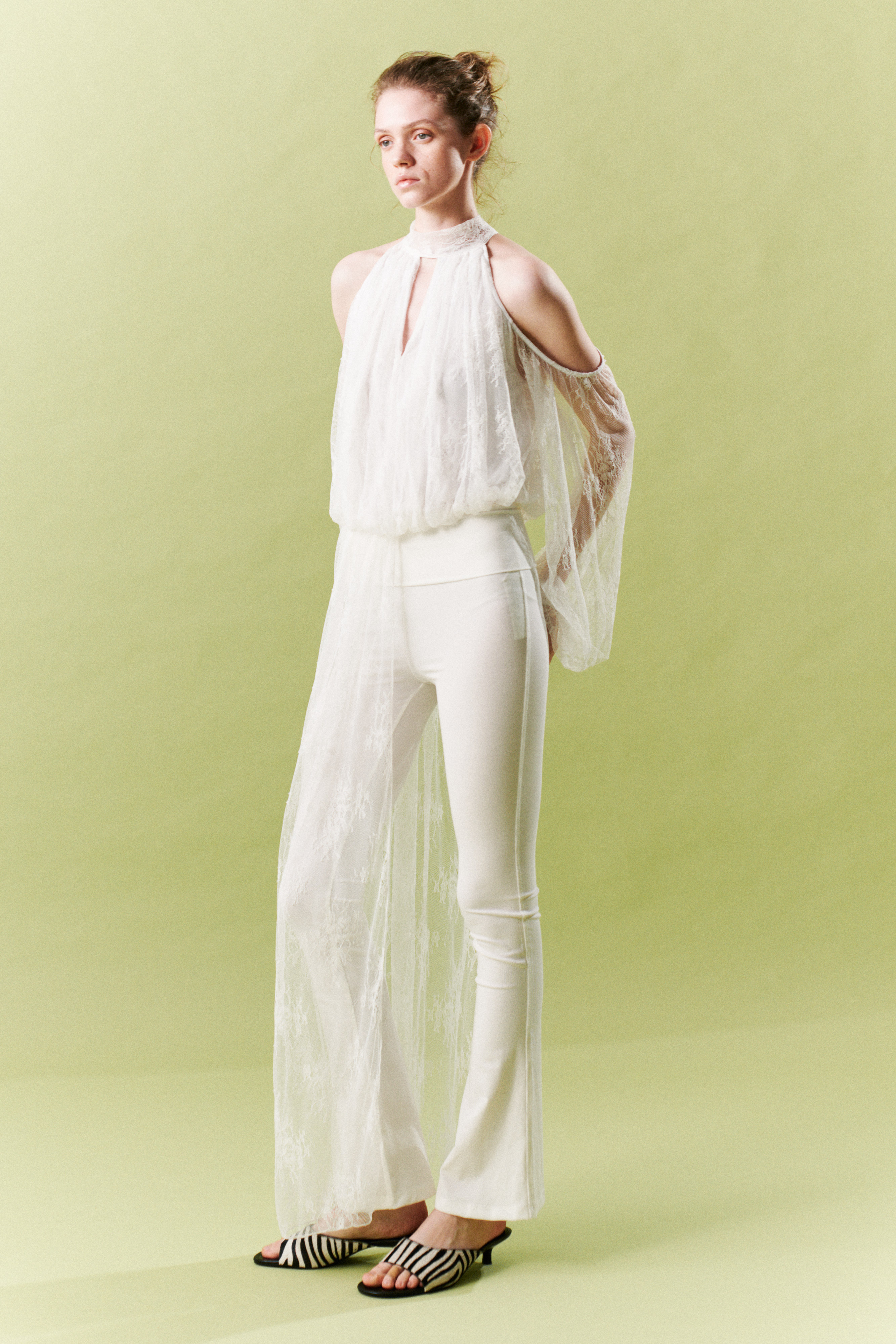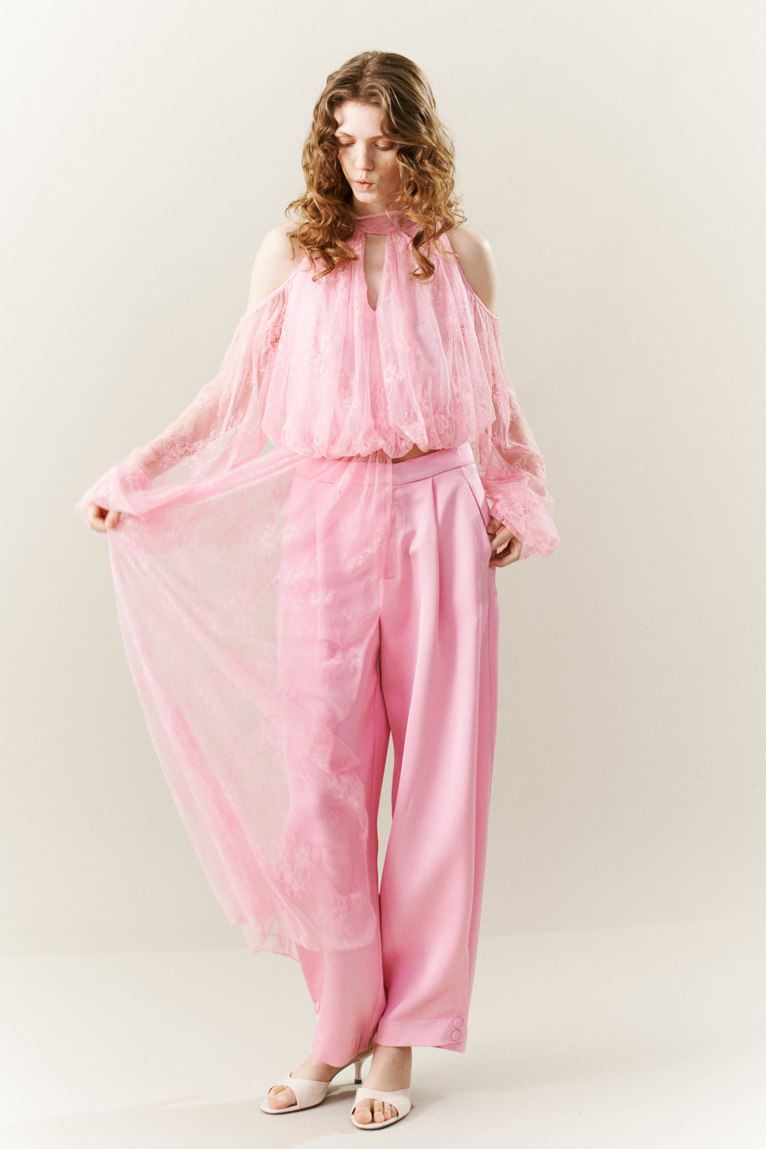 Pantaloni in tulle con ricamo in pizzo floreale. Vita elasticizzata. Gamba ampia e fluida. Balza decorativa in tulle applicata nella parte superiore. Fondo con elastico arricciato effetto balloon. Vestibilità regolare, disponibile in taglia S/M, M/L.