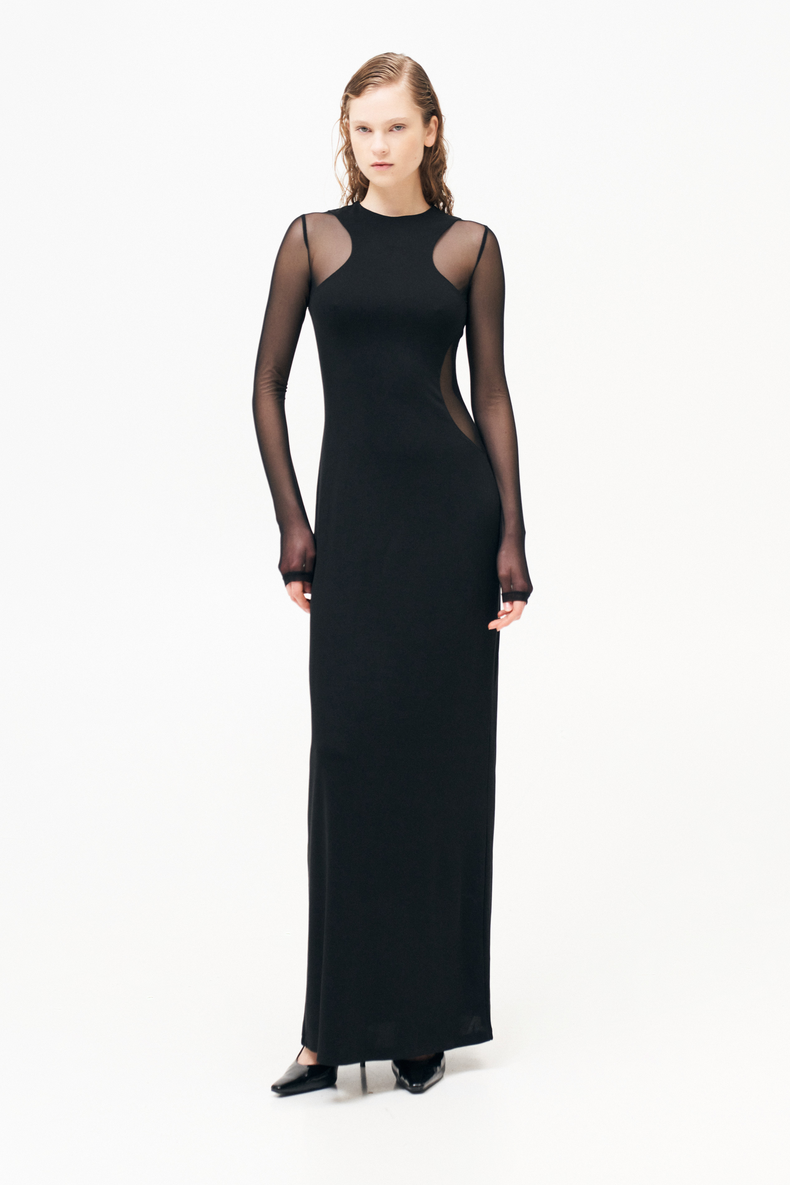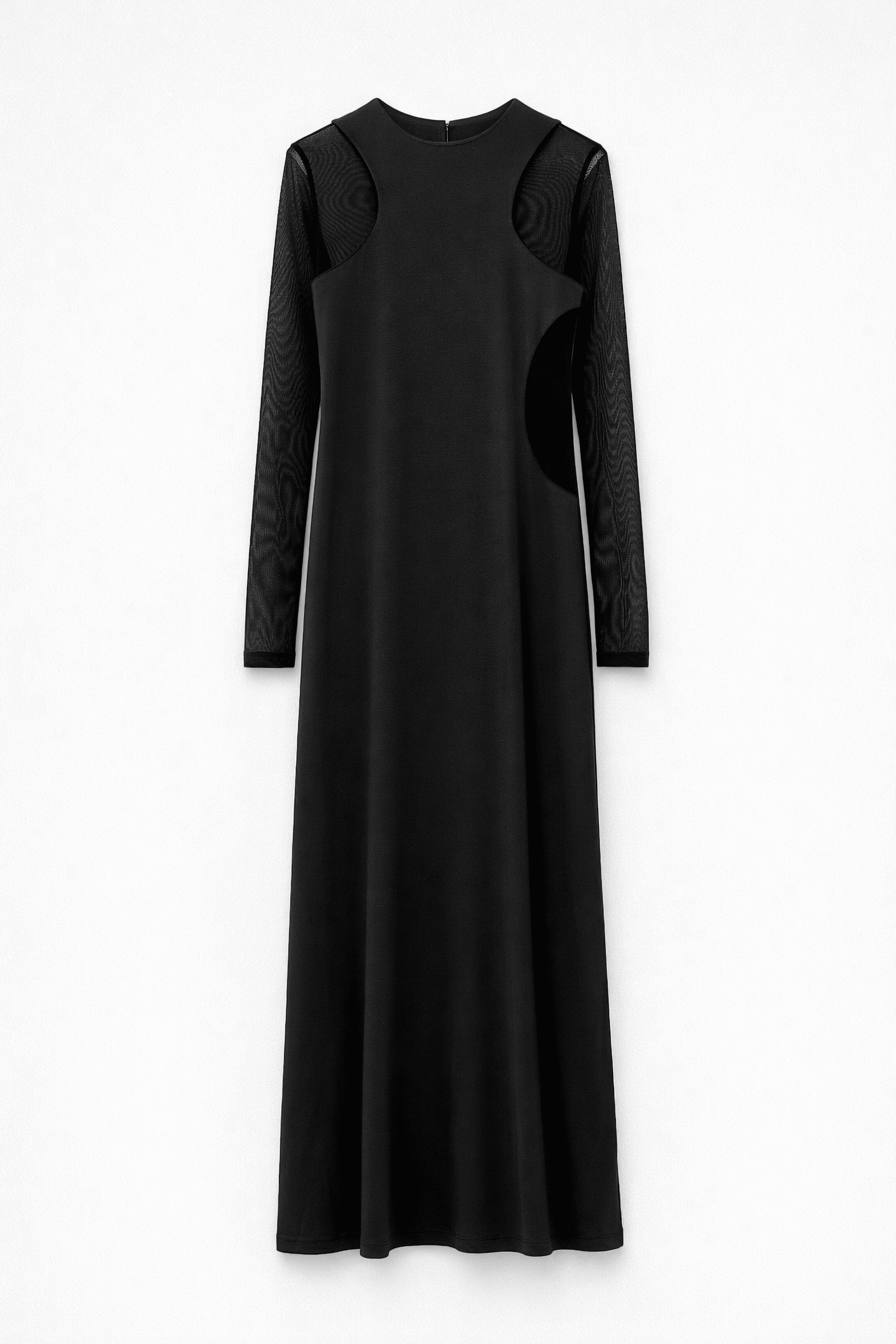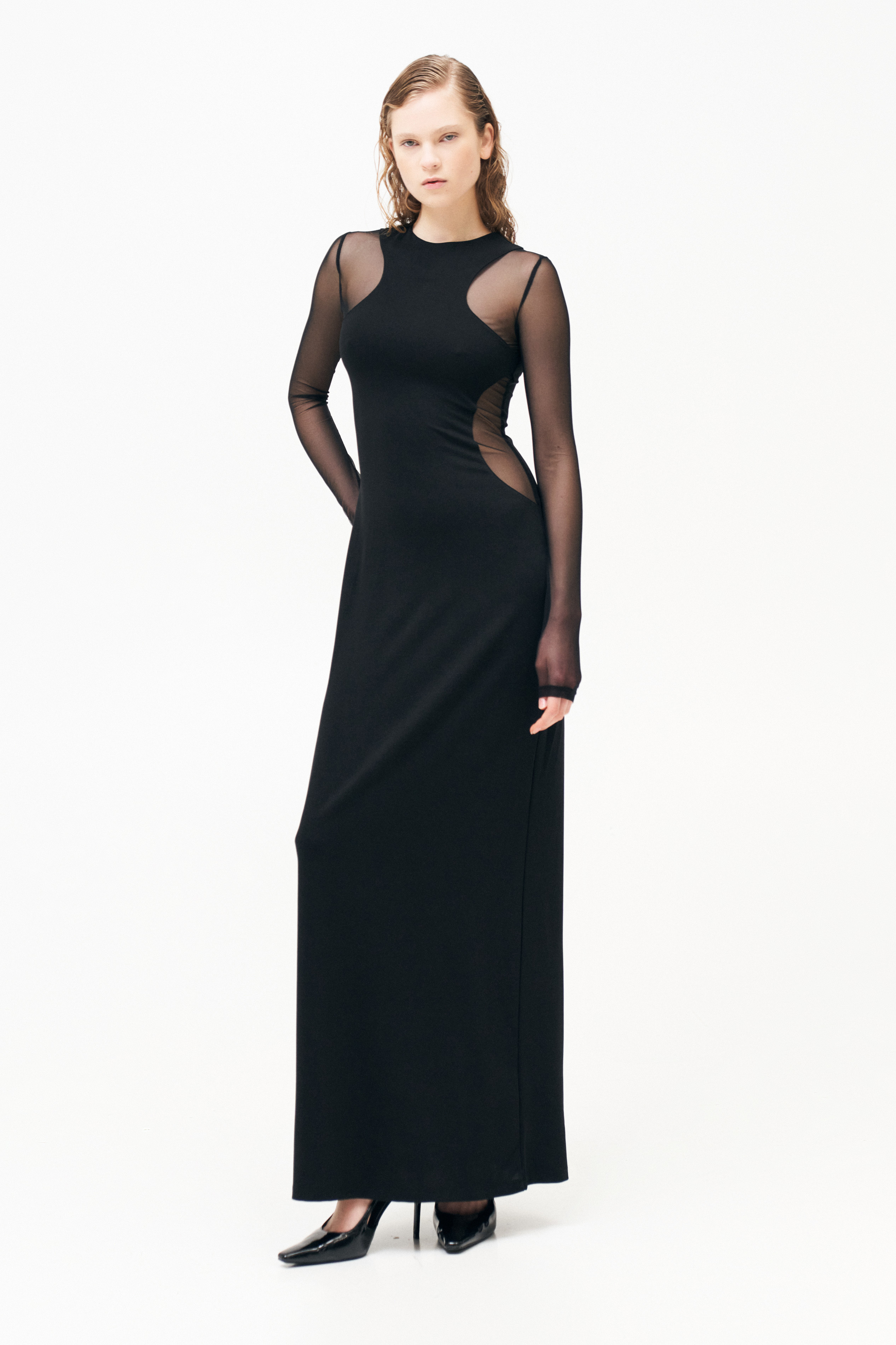 Abito lungo con inserti in tulle trasparente.