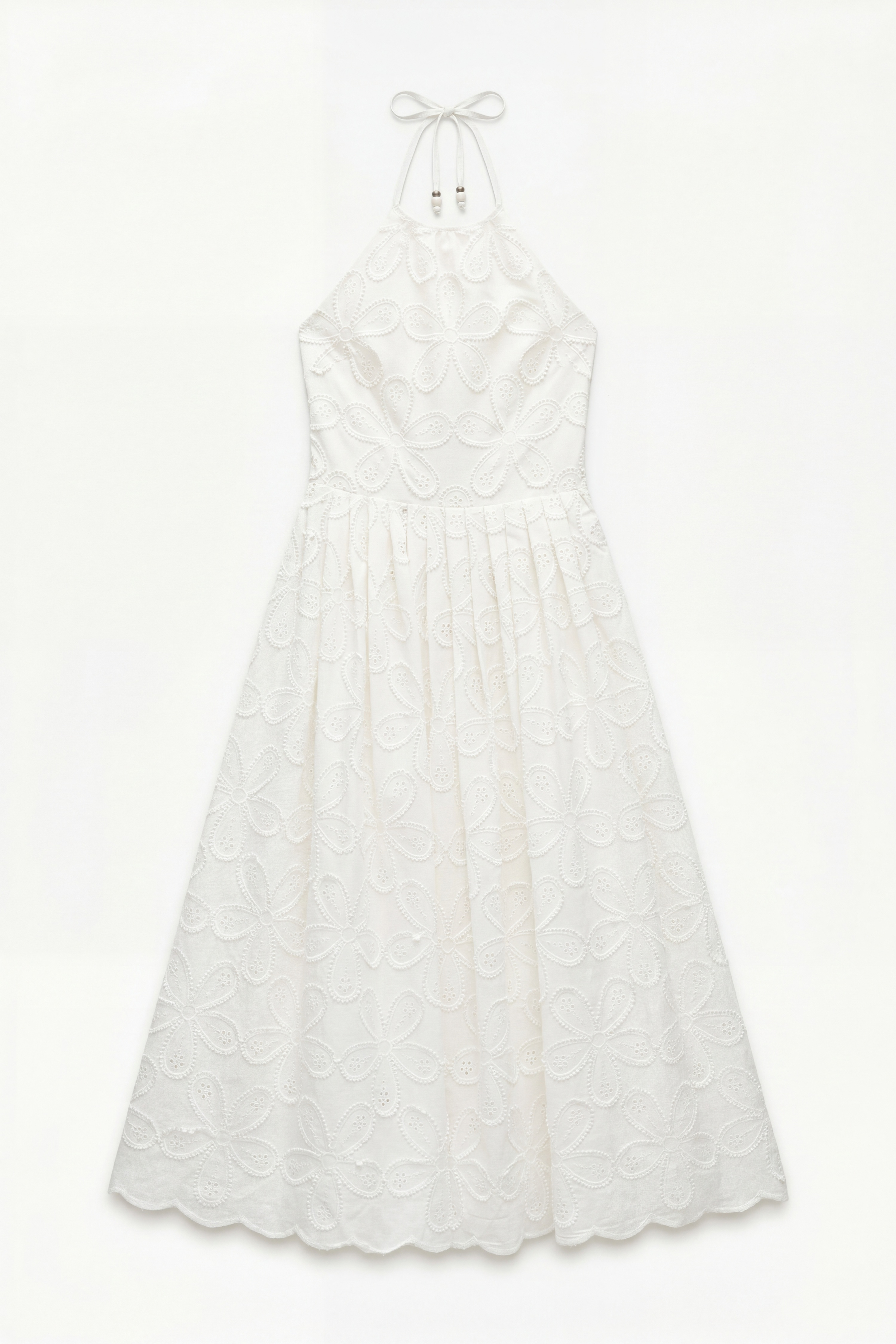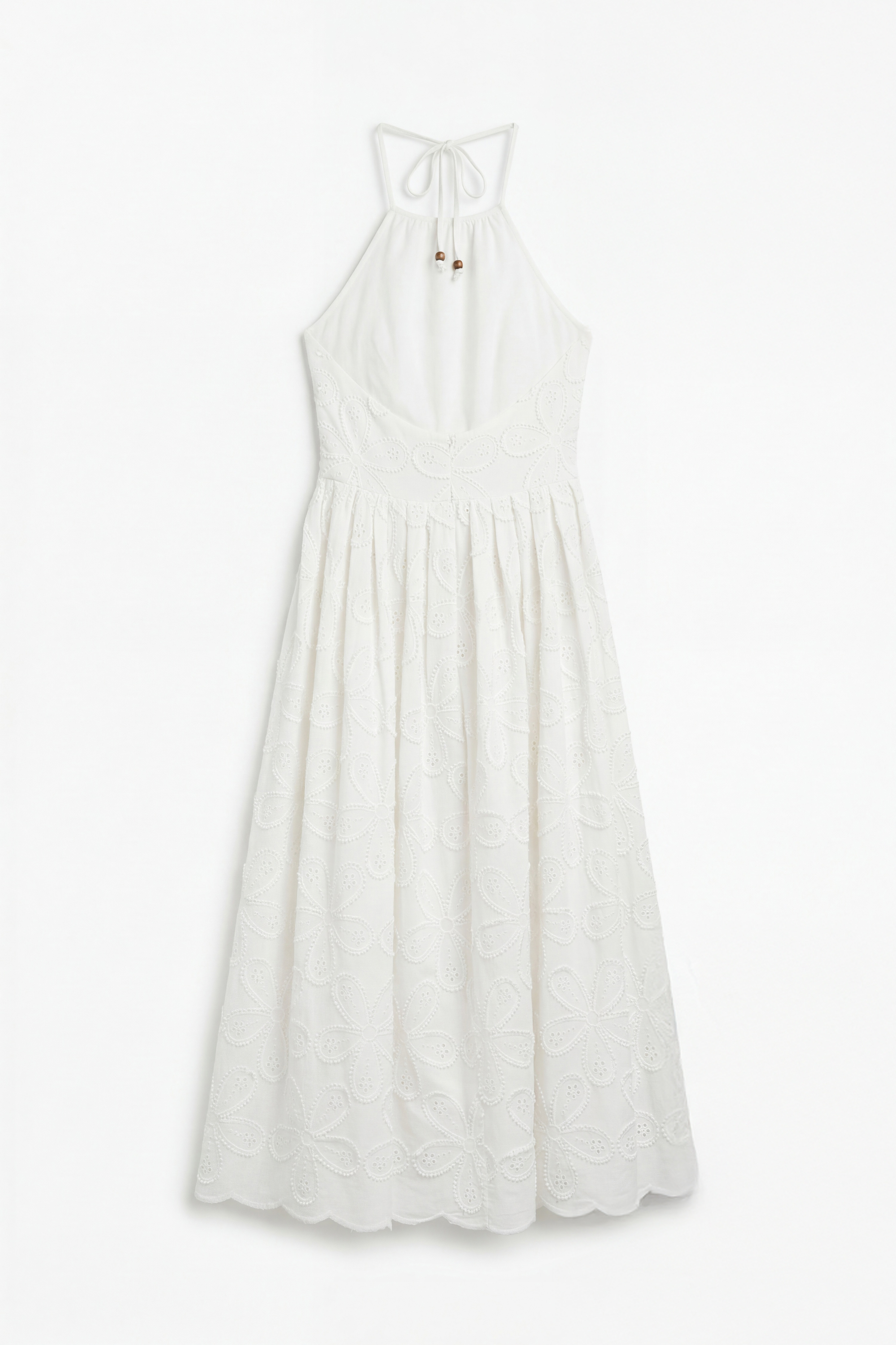 Abito lungo in sangallo con motivo floreale. Scollo alto con spalline sottili regolabili. Schiena scoperta ampia con chiusura regolabile. Chiusura laterale con zip invisibile. Gonna lunga ampia e fluida. Fodera interna. Vestibilità regolare, disponibile in taglia S, M, L.