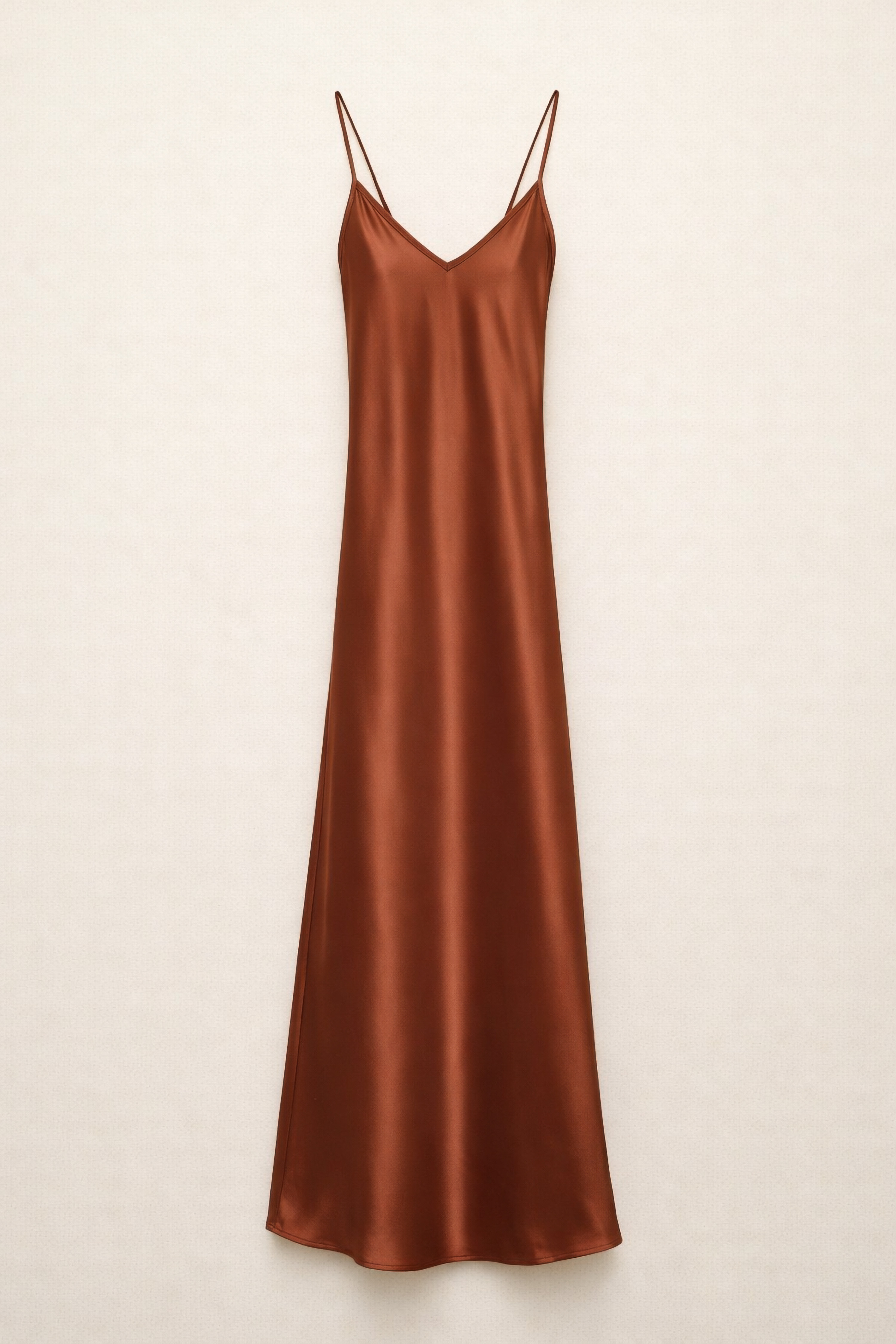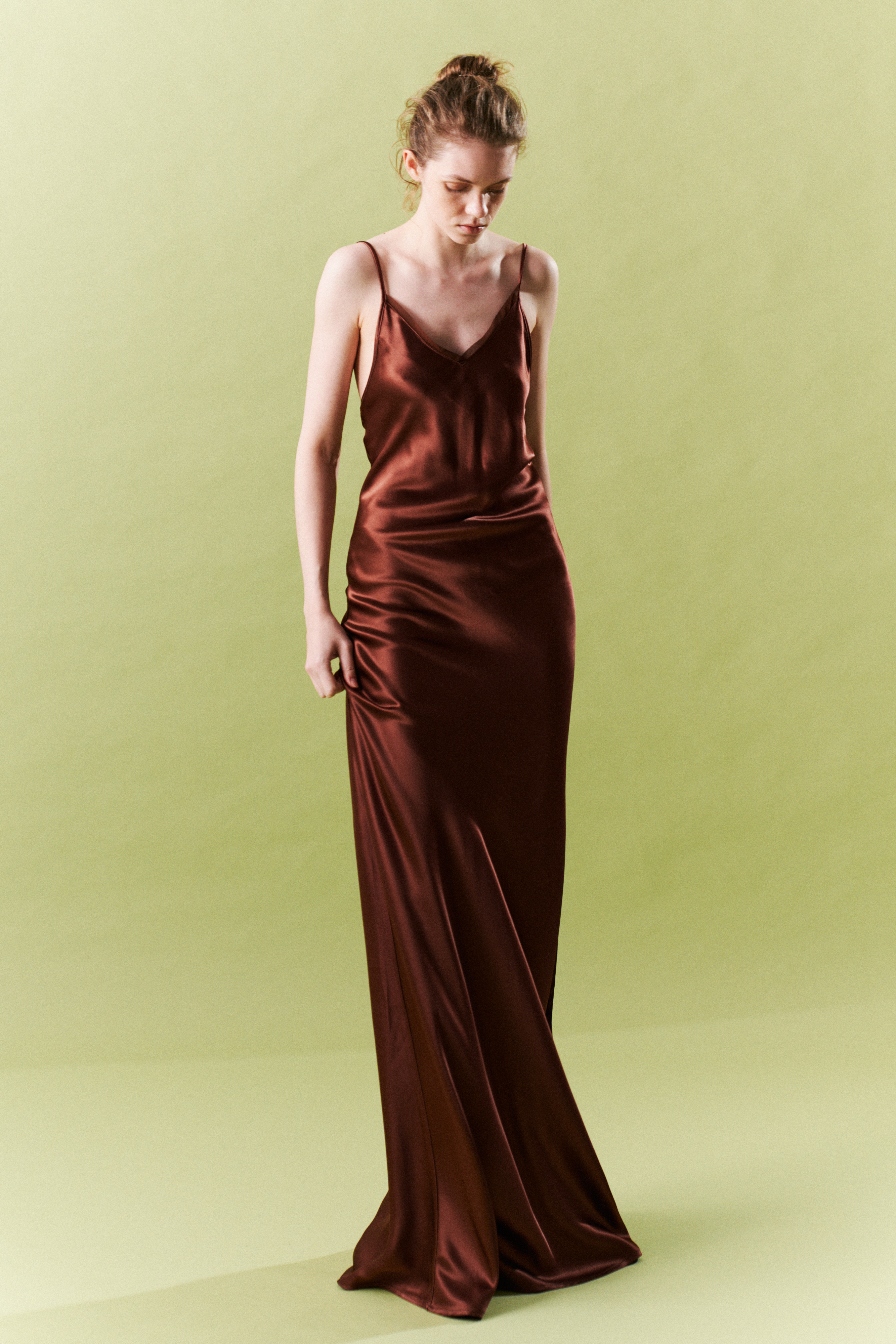 Abito lungo in raso fluido e satinato.