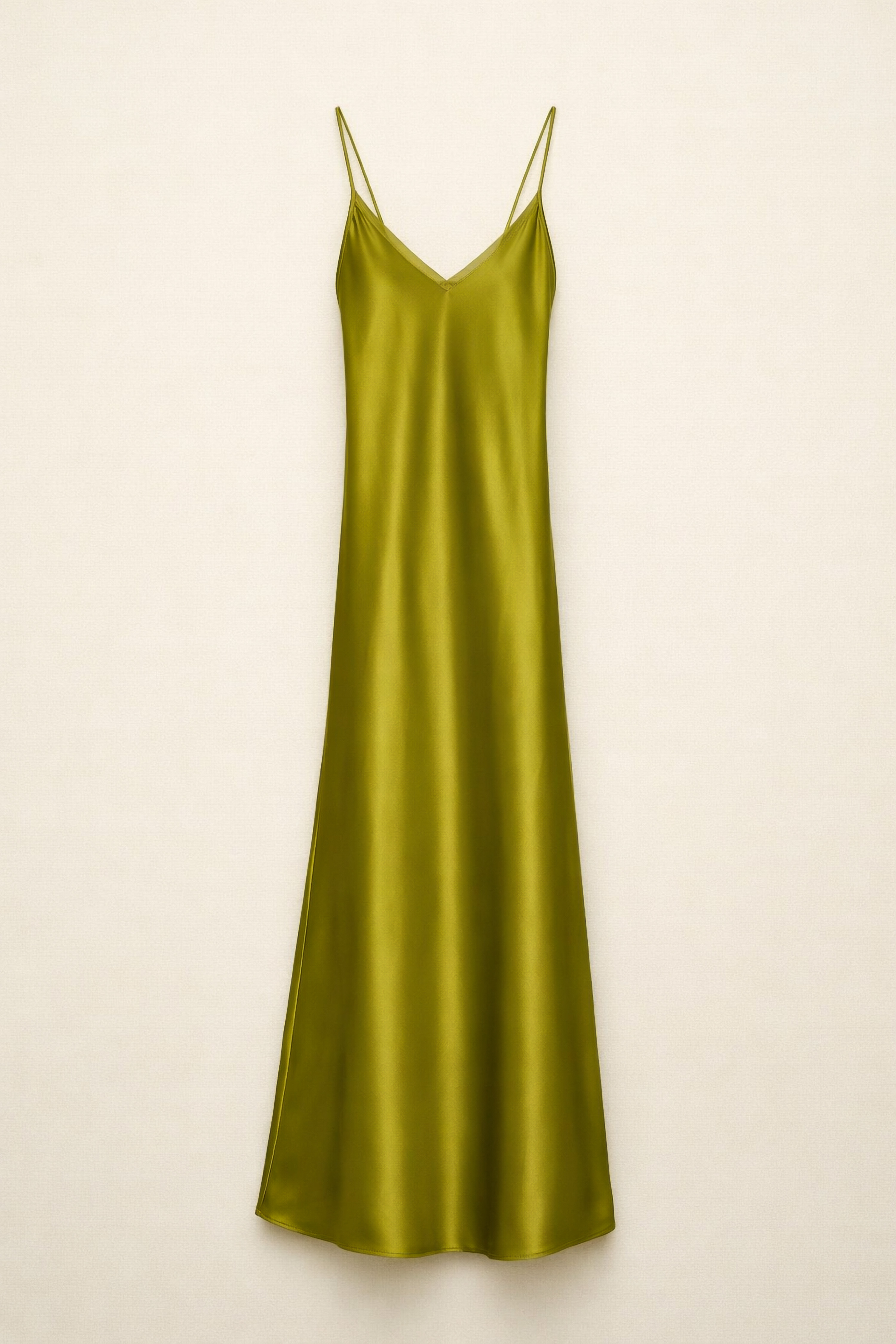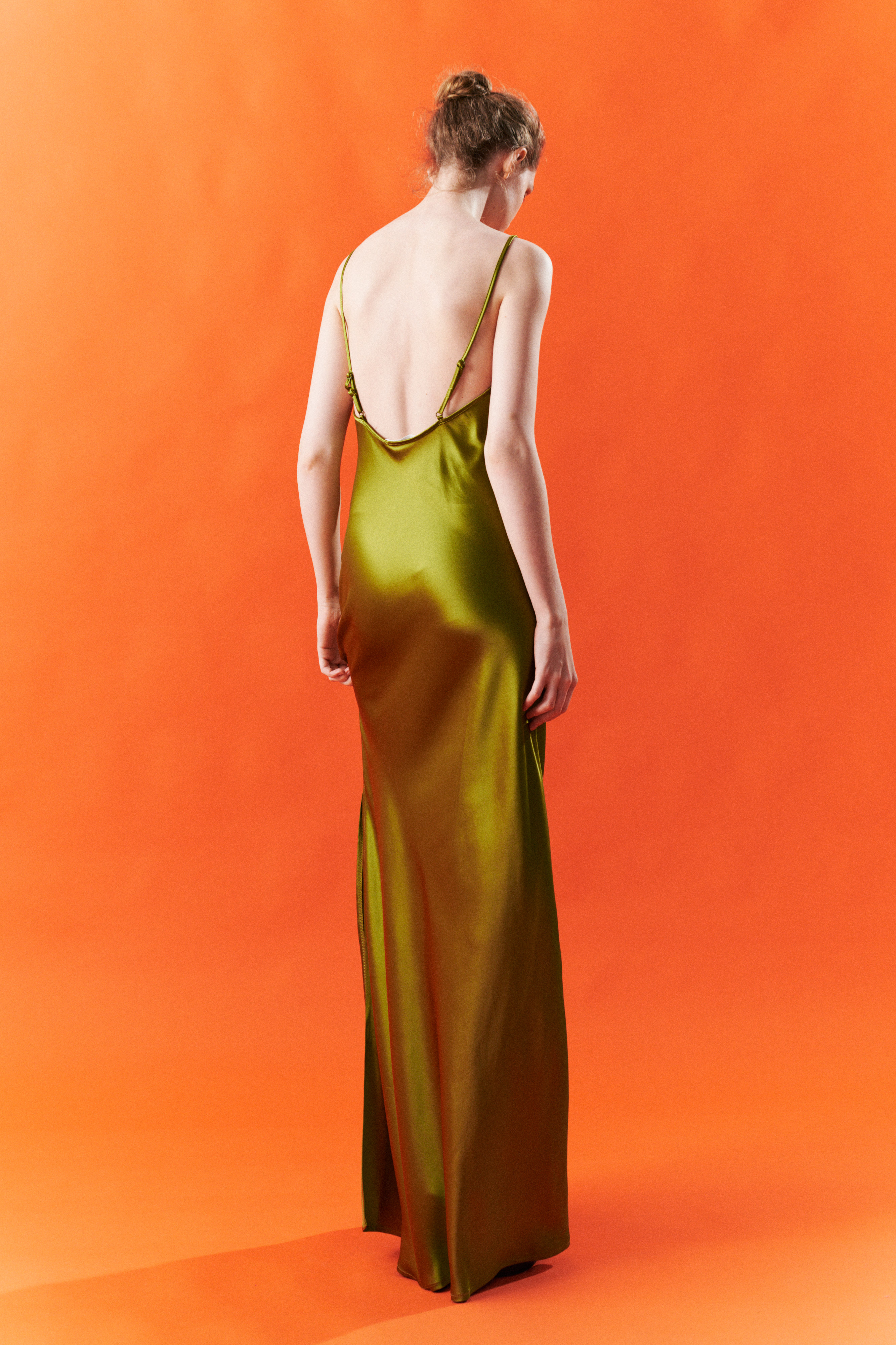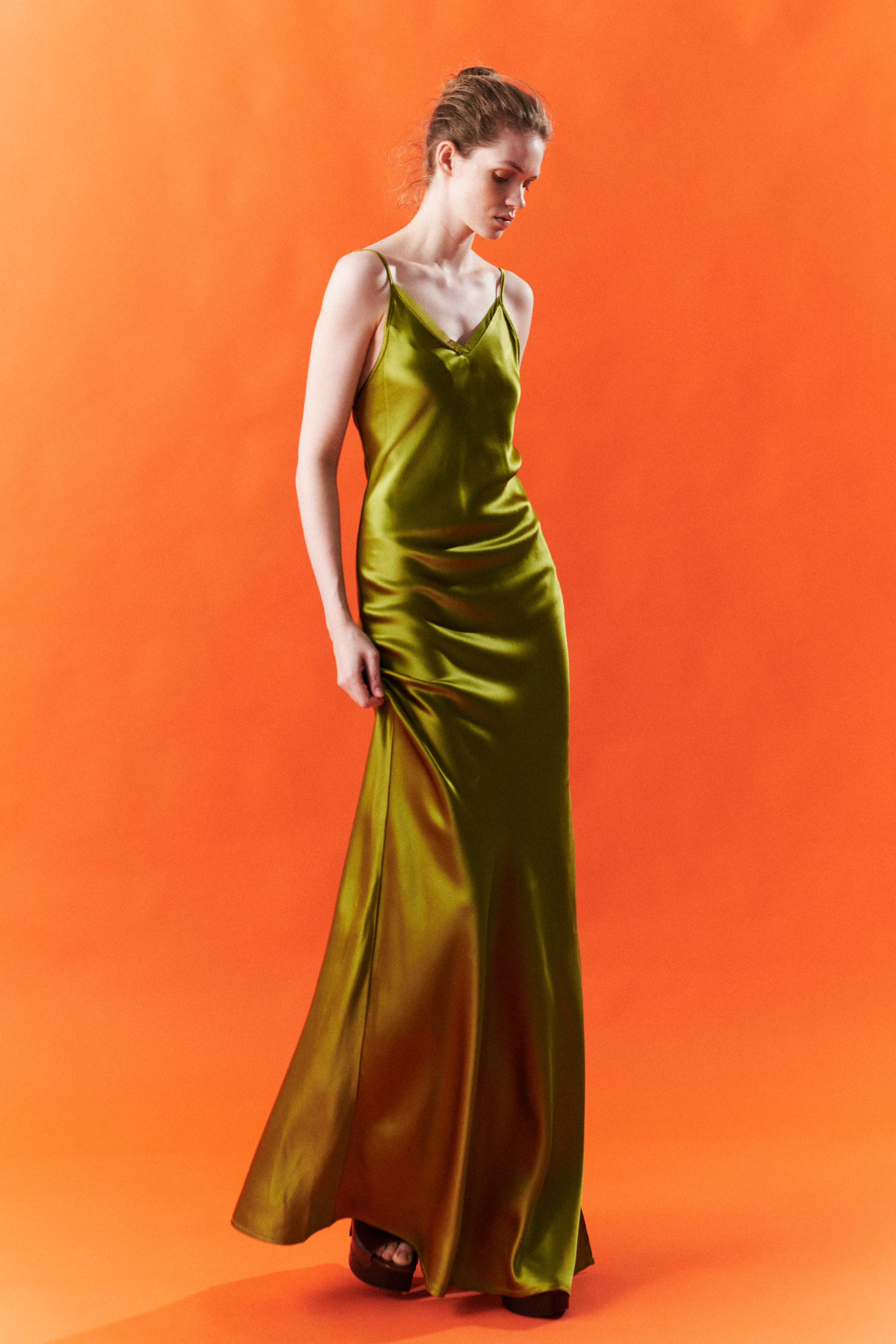 Abito lungo in raso fluido e satinato.