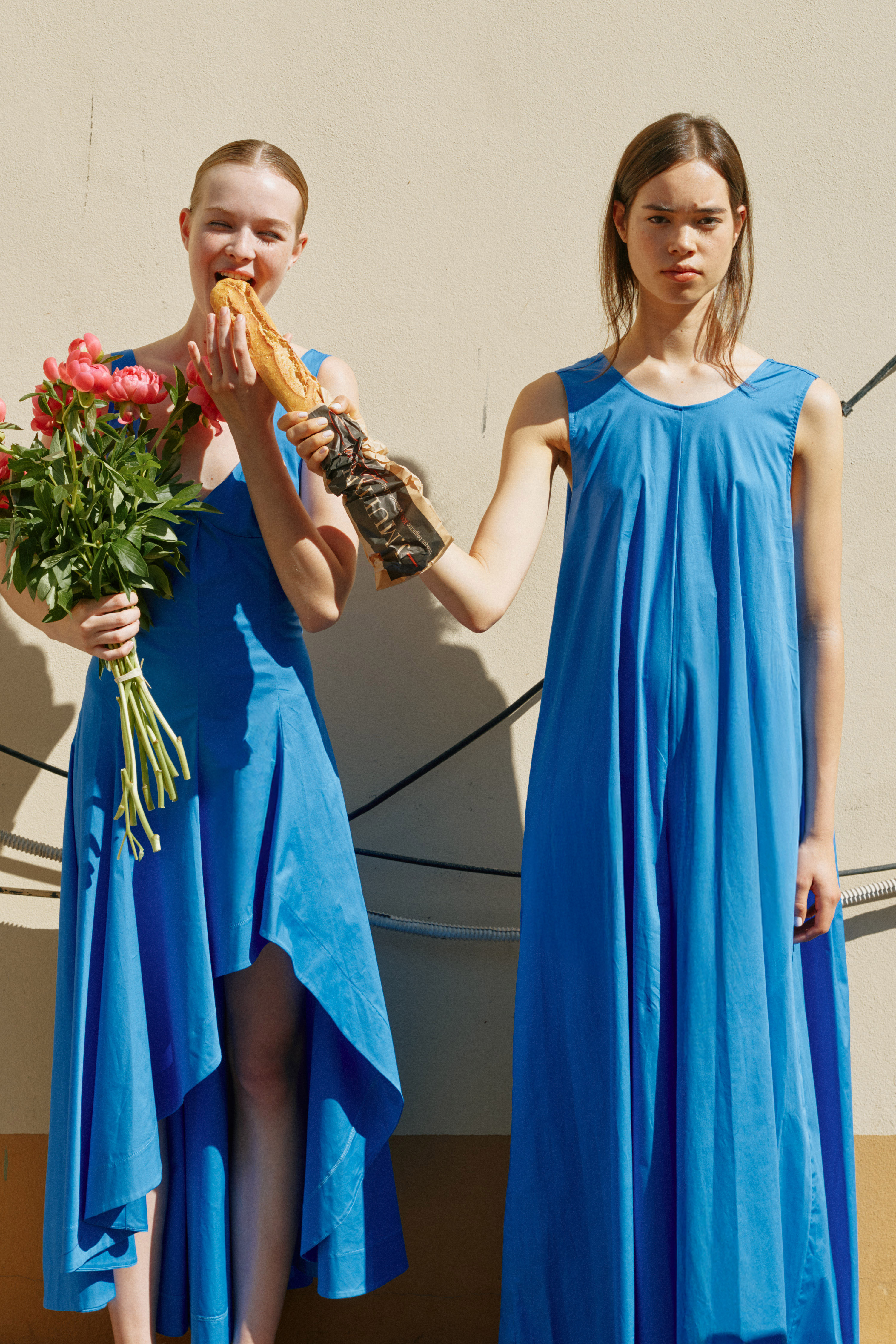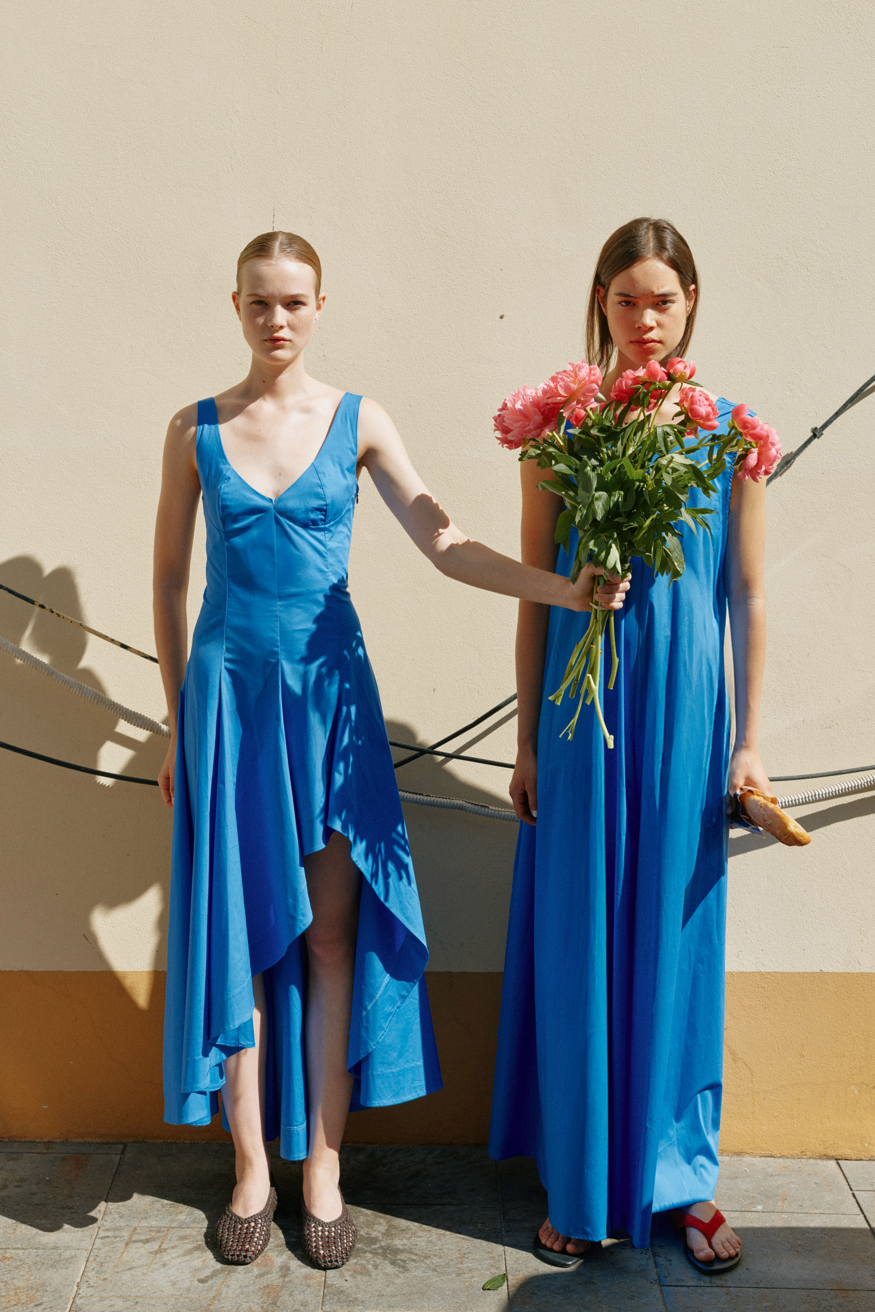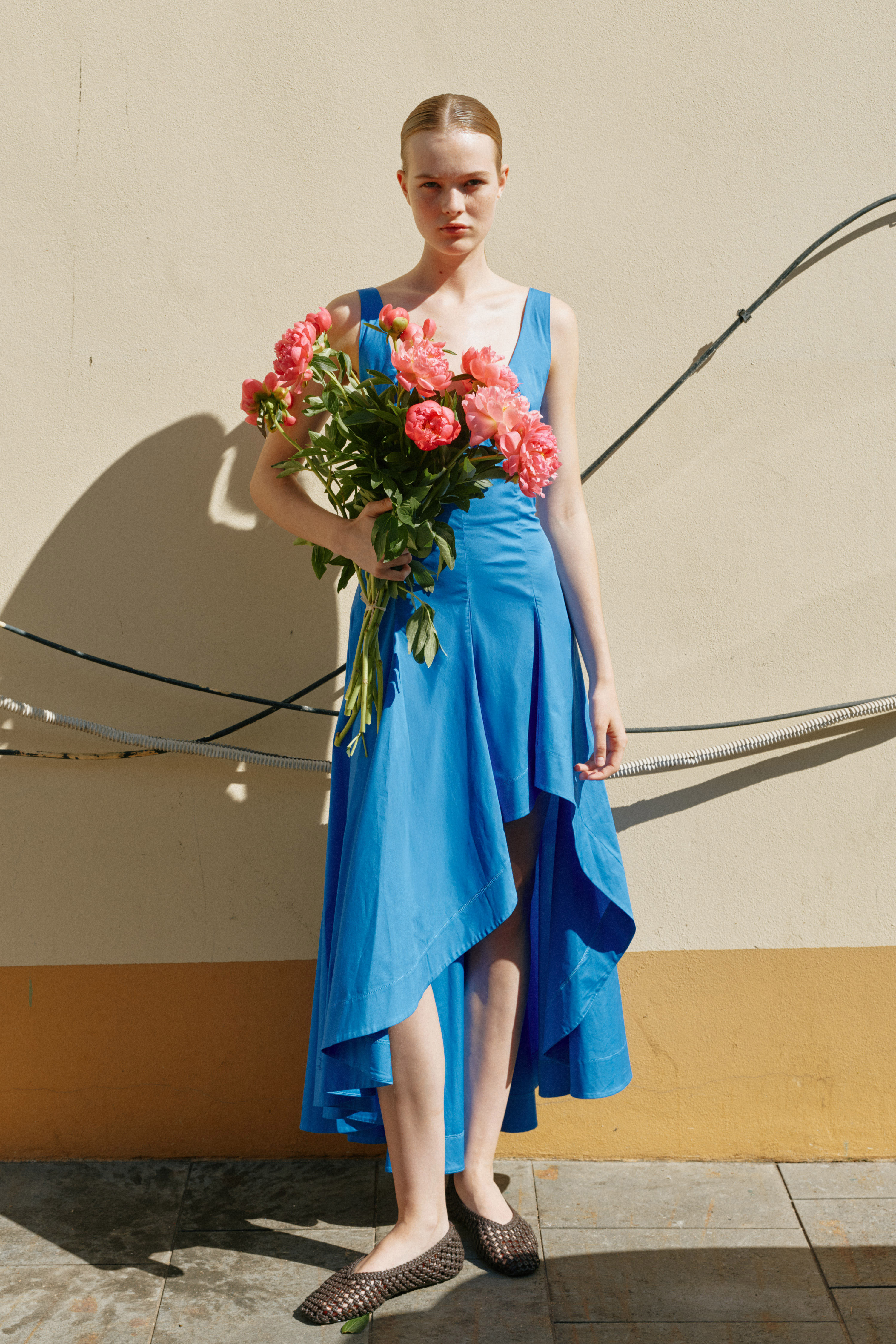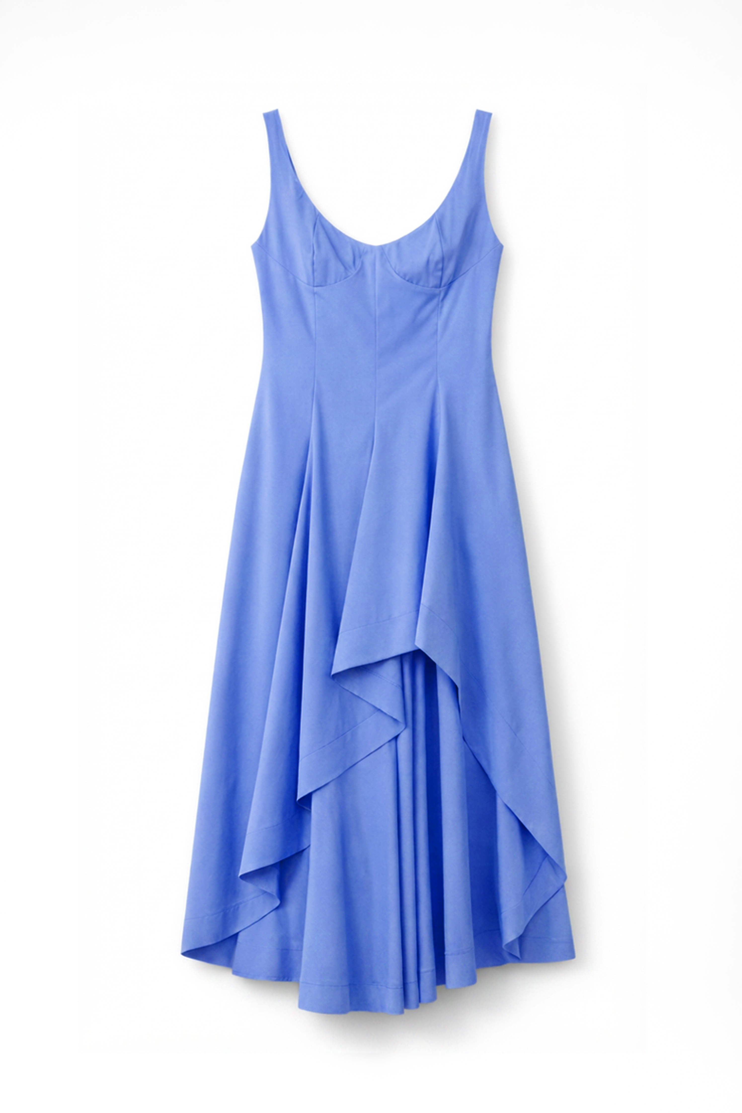 Abito lungo scollo a V con coppe sagomate in cotone elasticizzato. Corpetto strutturato con cuciture verticali modellanti. Gonna ampia con costruzione asimmetrica e balze sovrapposte. Chiusura con zip laterale invisibile. Vestibilità regolare, disponibile in taglia S, M, L.