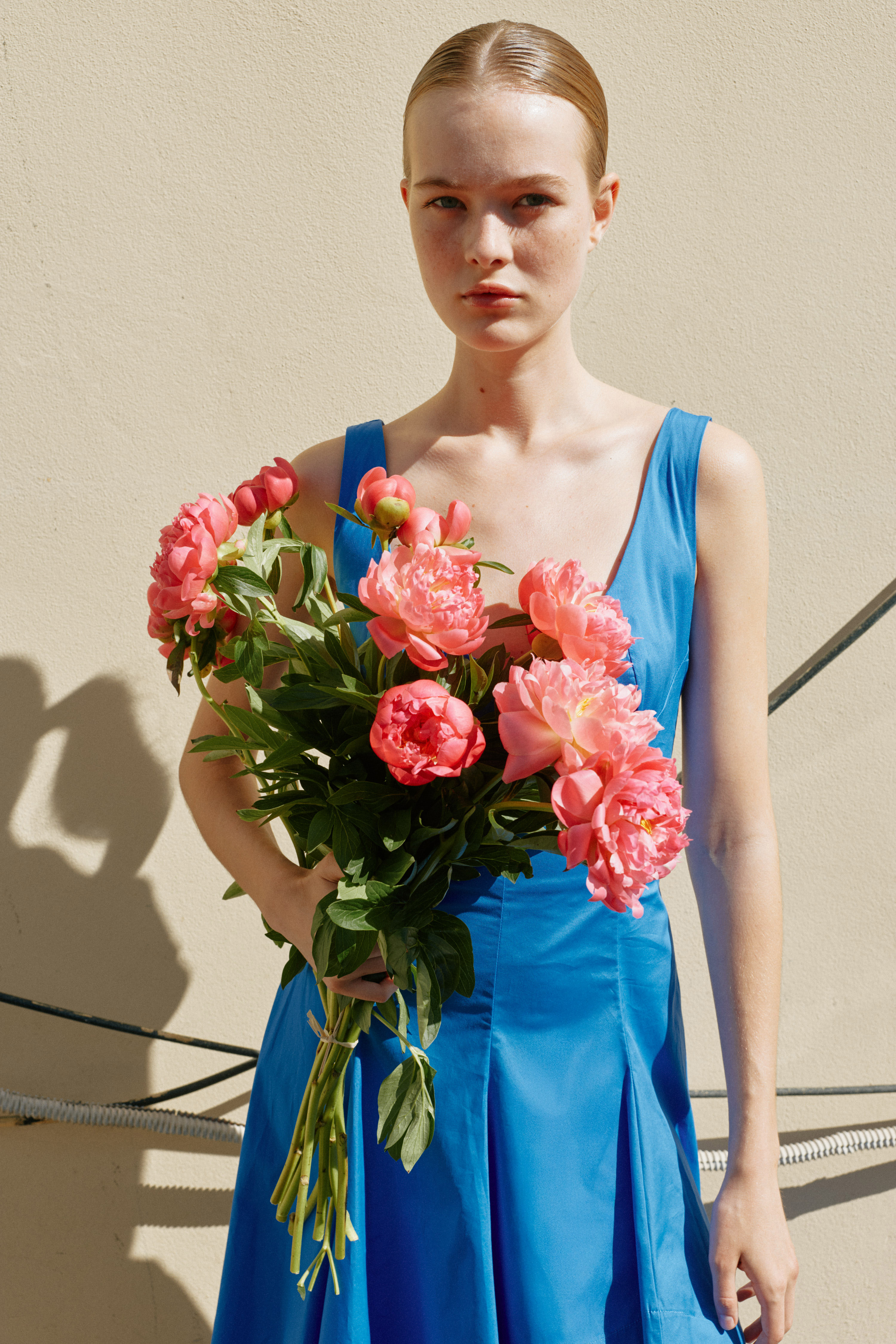 Abito lungo con stampa floreale all-over. Scollo dritto con spalline sottili regolabili. Retro con scollo aperto e laccetti regolabili. Costruzione ampia con gonna svasata. Presenza di tasche laterali inserite. Vestibilità regolare, disponibile in taglia S, M, L.