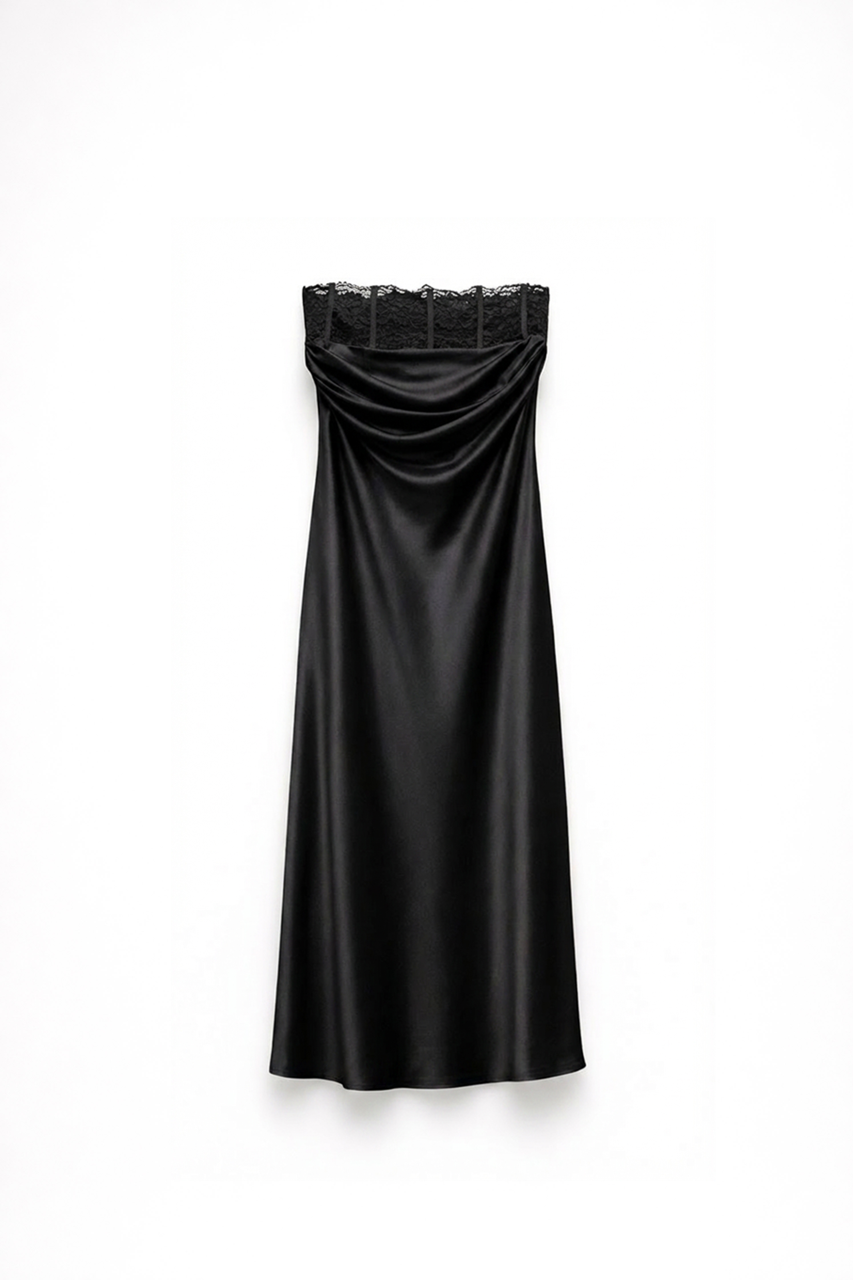 Abito lungo in tessuto satinato in 100% rayon. Corpetto strutturato con pizzo trasparente. Scollo drappeggiato morbido sul davanti. Bustino con stecche verticali effetto corsetto. Chiusura con zip laterale invisibile. Vestibilità regolare, disponibile in taglia S, M, L.
