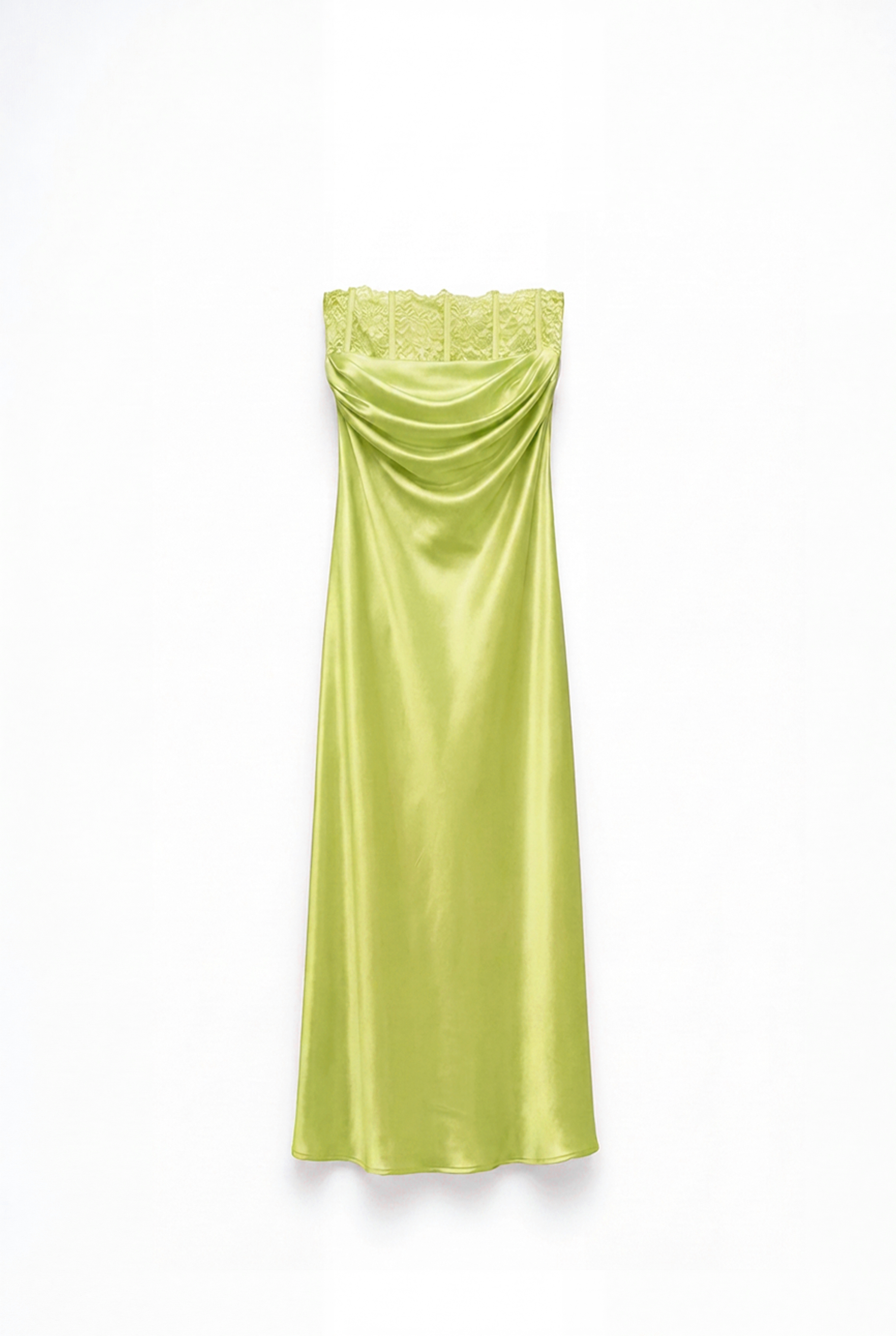 Abito lungo in tessuto satinato in 100% rayon. Corpetto strutturato con pizzo trasparente. Scollo drappeggiato morbido sul davanti. Bustino con stecche verticali effetto corsetto. Chiusura con zip laterale invisibile. Vestibilità regolare, disponibile in taglia S, M, L.