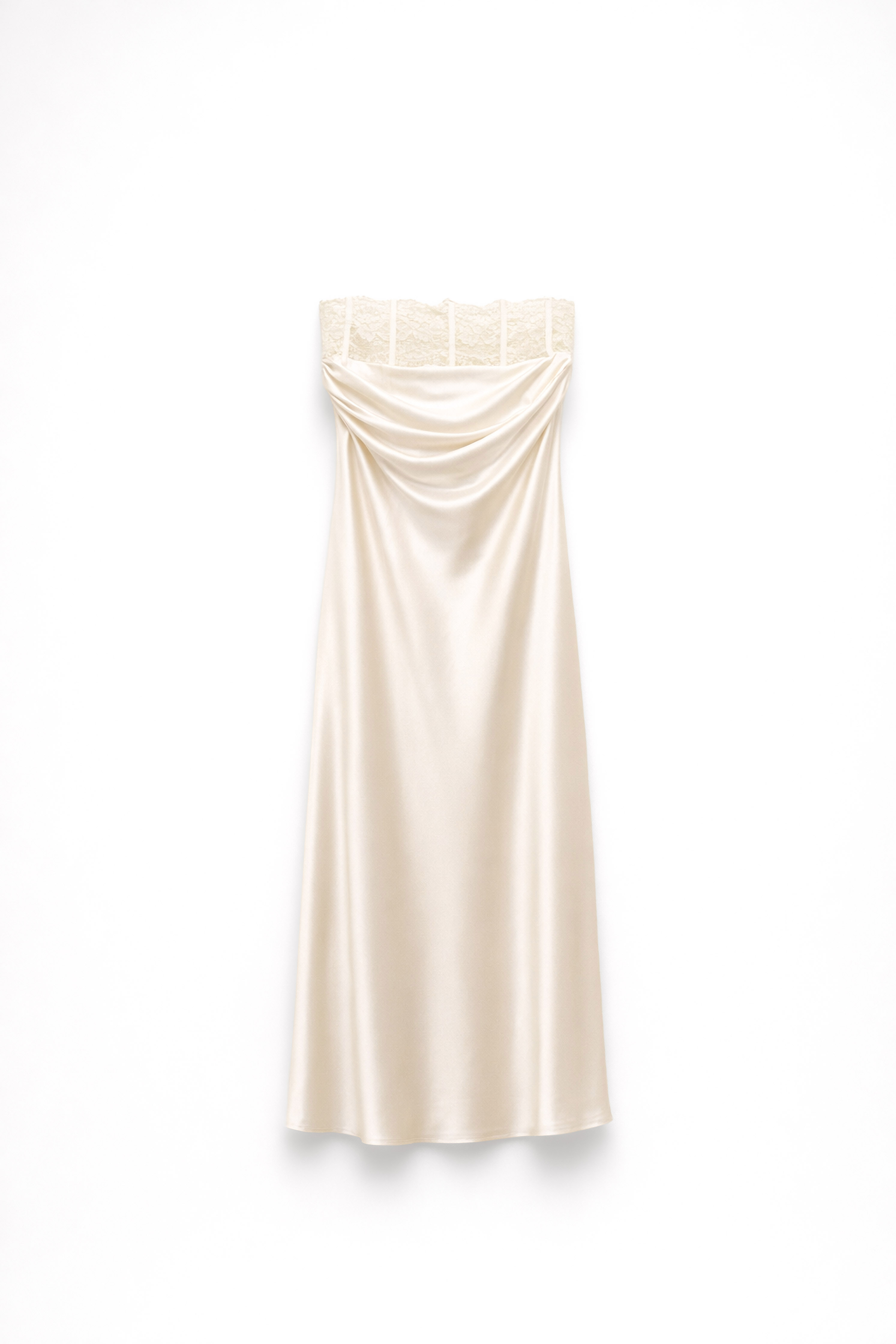 Abito lungo in tessuto satinato in 100% rayon. Corpetto strutturato con pizzo trasparente. Scollo drappeggiato morbido sul davanti. Bustino con stecche verticali effetto corsetto. Chiusura con zip laterale invisibile. Vestibilità regolare, disponibile in taglia S, M, L.