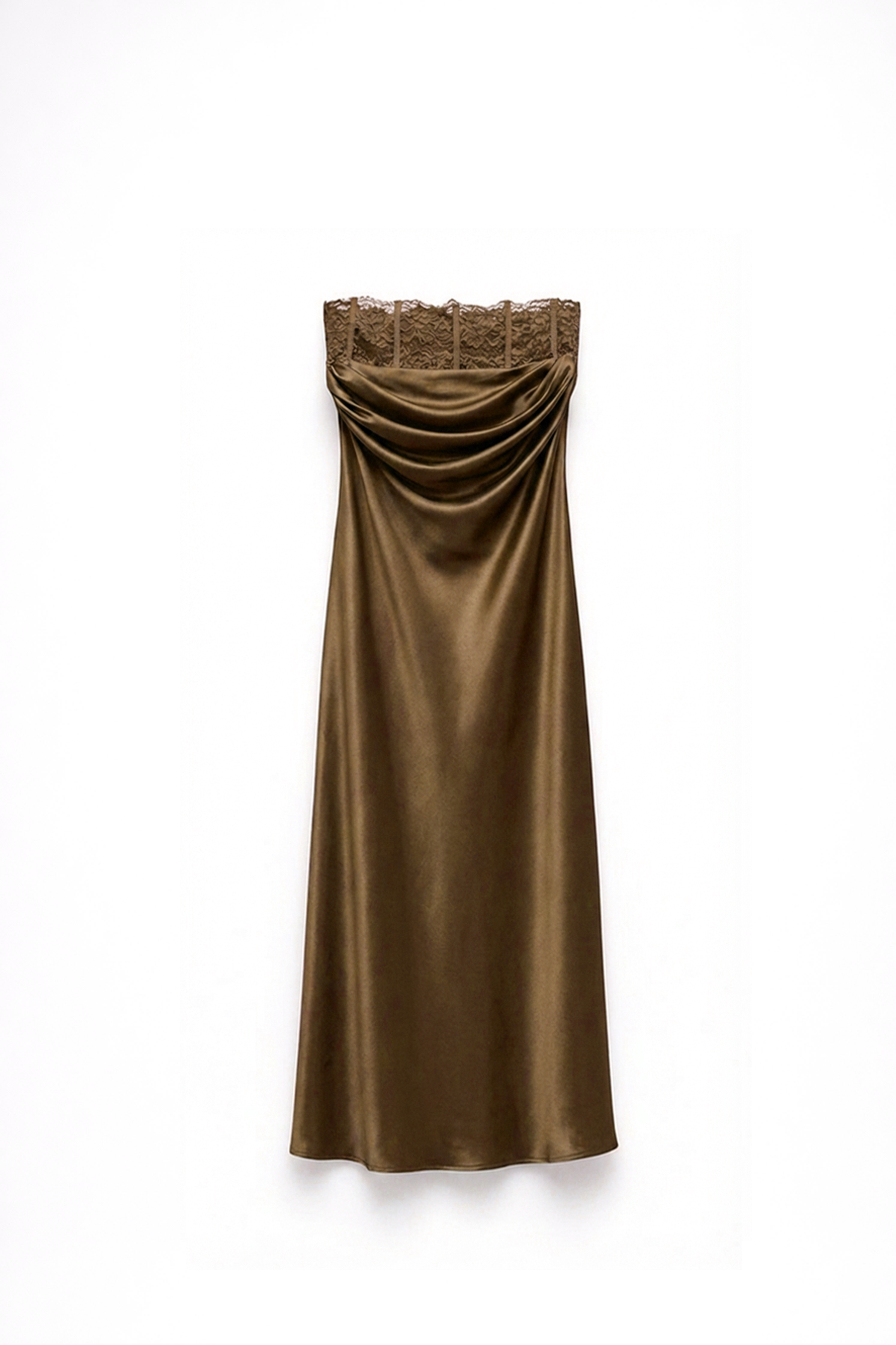 Abito lungo in tessuto satinato in 100% rayon. Inserto in pizzo sulla scollatura interna. Scollo morbido drappeggiato sul davanti. Spalline sottili regolabili. Fodera interna. Chiusura posteriore con zip invisibile centrale. Vestibilità regolare, disponibile in taglia S, M, L.