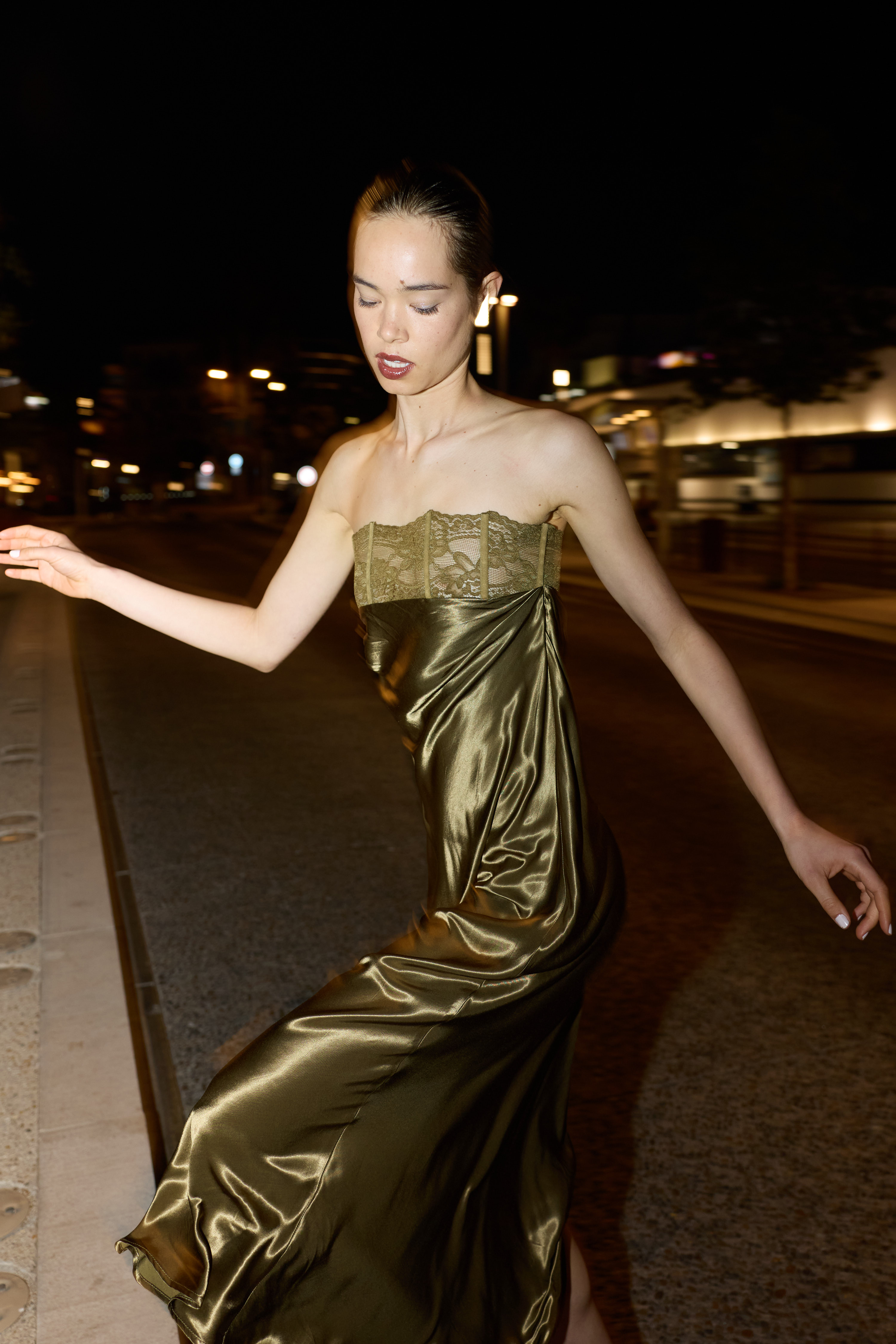 Abito lungo in tessuto satinato in 100% rayon. Corpetto strutturato con pizzo trasparente. Scollo drappeggiato morbido sul davanti. Bustino con stecche verticali effetto corsetto. Chiusura con zip laterale invisibile. Vestibilità regolare, disponibile in taglia S, M, L.