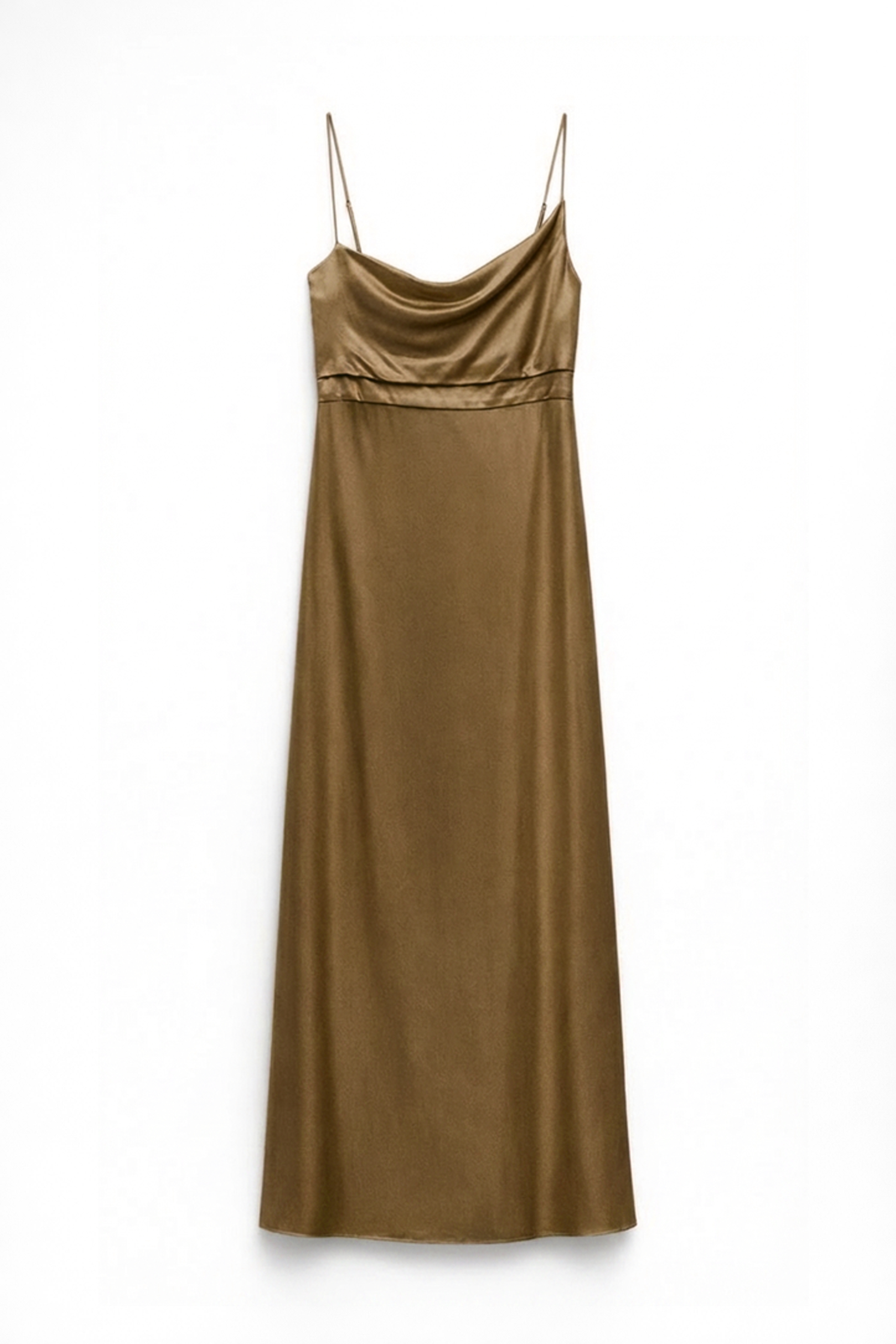 Abito lungo in tessuto satinato in 100% rayon. Inserto in pizzo sulla scollatura interna. Scollo morbido drappeggiato sul davanti. Spalline sottili regolabili. Fodera interna. Chiusura posteriore con zip invisibile centrale. Vestibilità regolare, disponibile in taglia S, M, L.