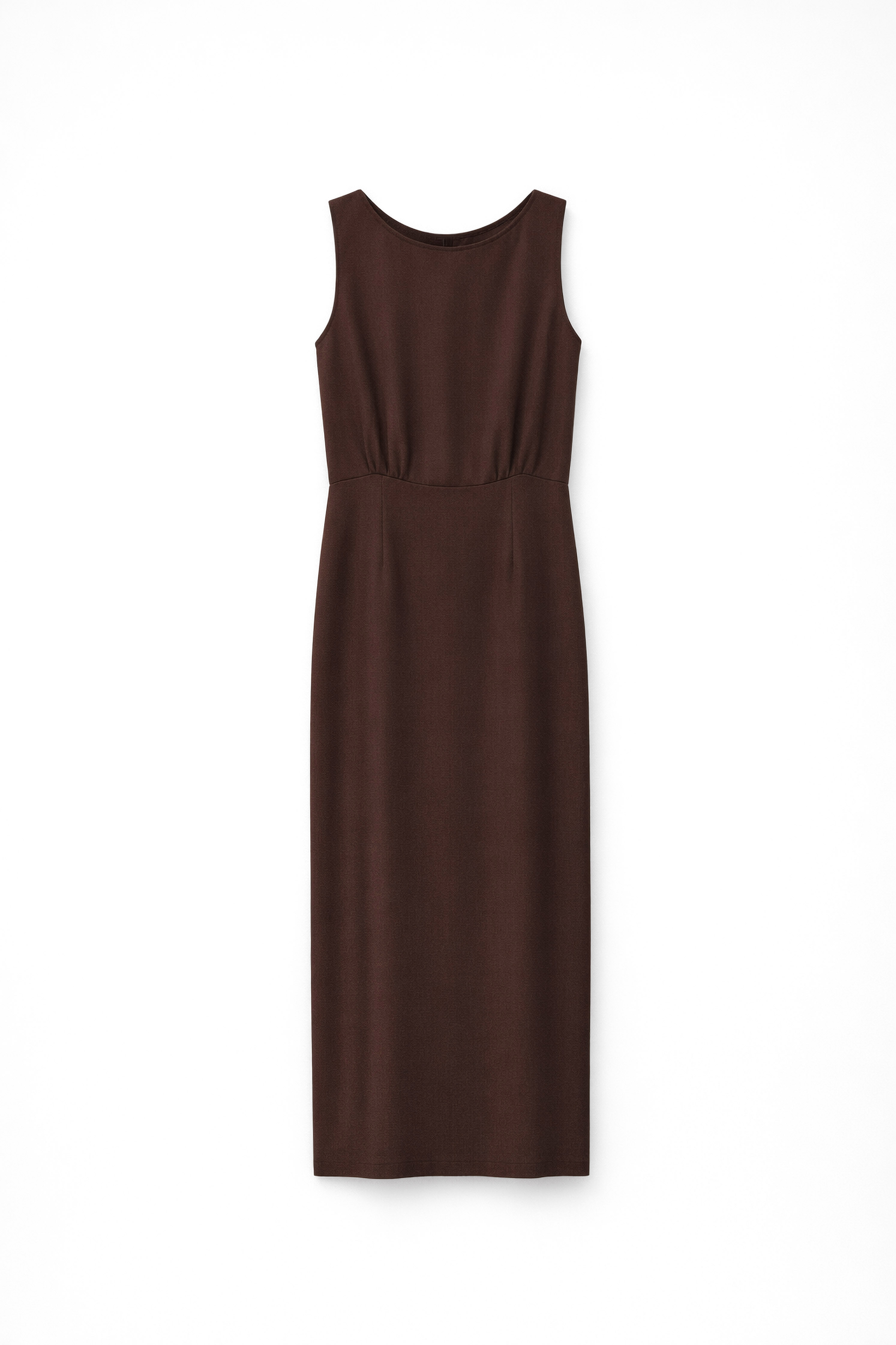 Abito lungo in tessuto leggero misto lino. Scollo rotondo sul davanti. Senza maniche. Scollo profondo sul retro con chiusura a bottone. Chiusura con zip invisibile posteriore. Vestibilità regolare, disponibile in taglia S/M, M/L.