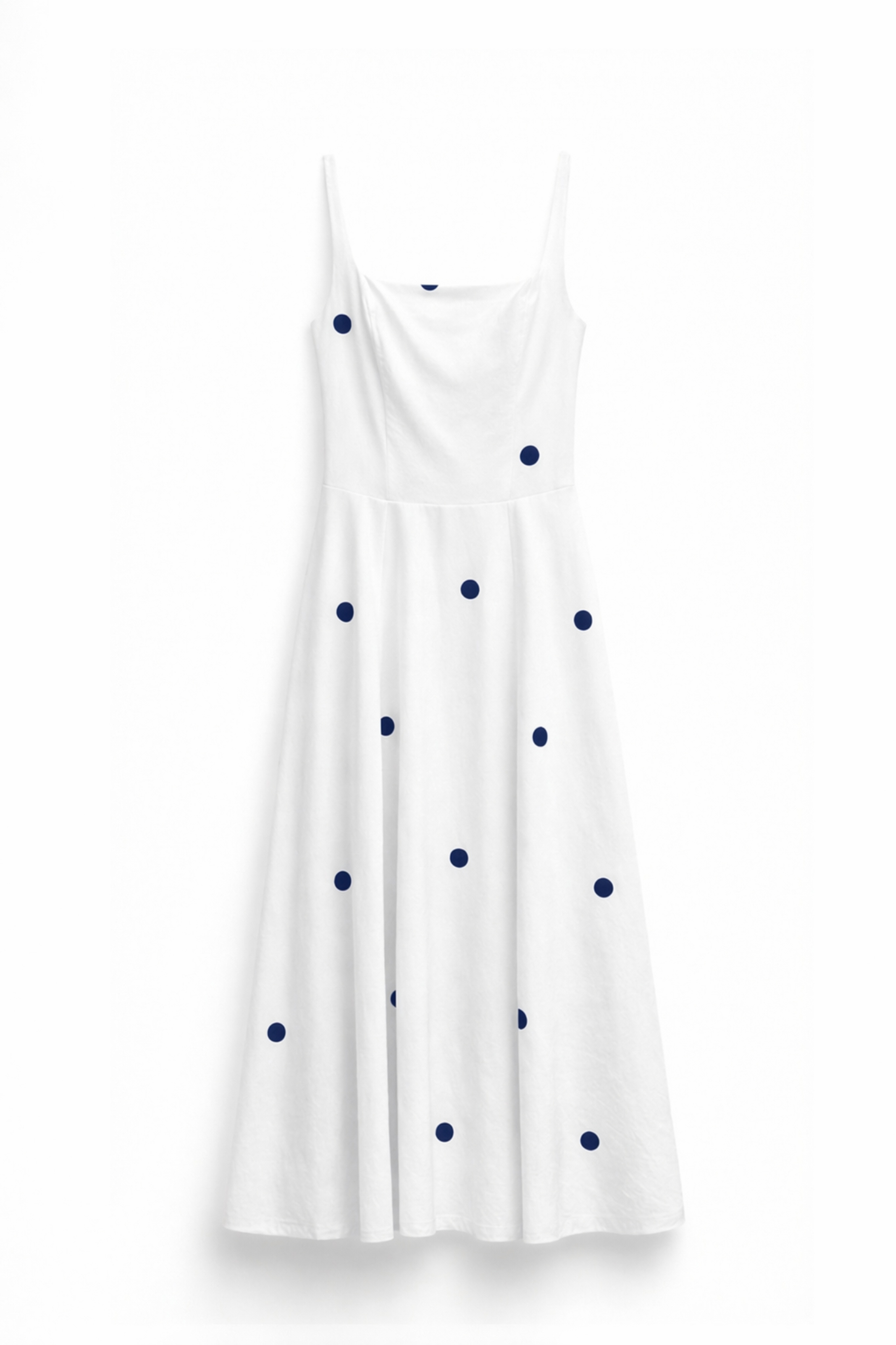 Abito lungo con stampa a pois in misto lino. Scollo con coppe strutturate e cut-out centrale. Spalline sottili regolabili. Fodera interna. Balze asimmetriche applicate sulla gonna. Chiusura posteriore con zip invisibile centrale. Vestibilità regolare, disponibile in taglia S, M, L.