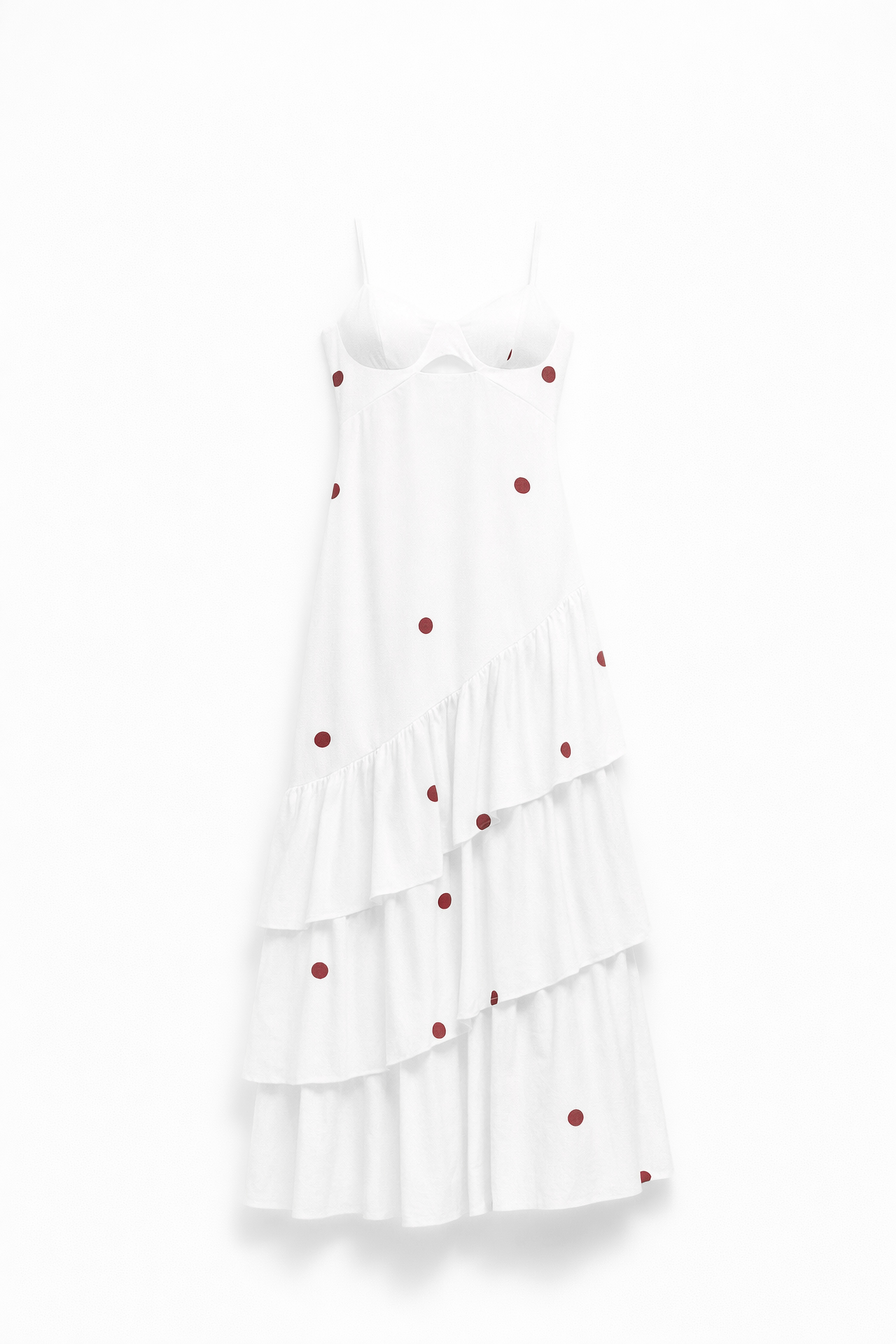 Abito lungo con stampa a pois in misto lino. Scollo con coppe strutturate e cut-out centrale. Spalline sottili regolabili. Fodera interna. Balze asimmetriche applicate sulla gonna. Chiusura posteriore con zip invisibile centrale. Vestibilità regolare, disponibile in taglia S, M, L.