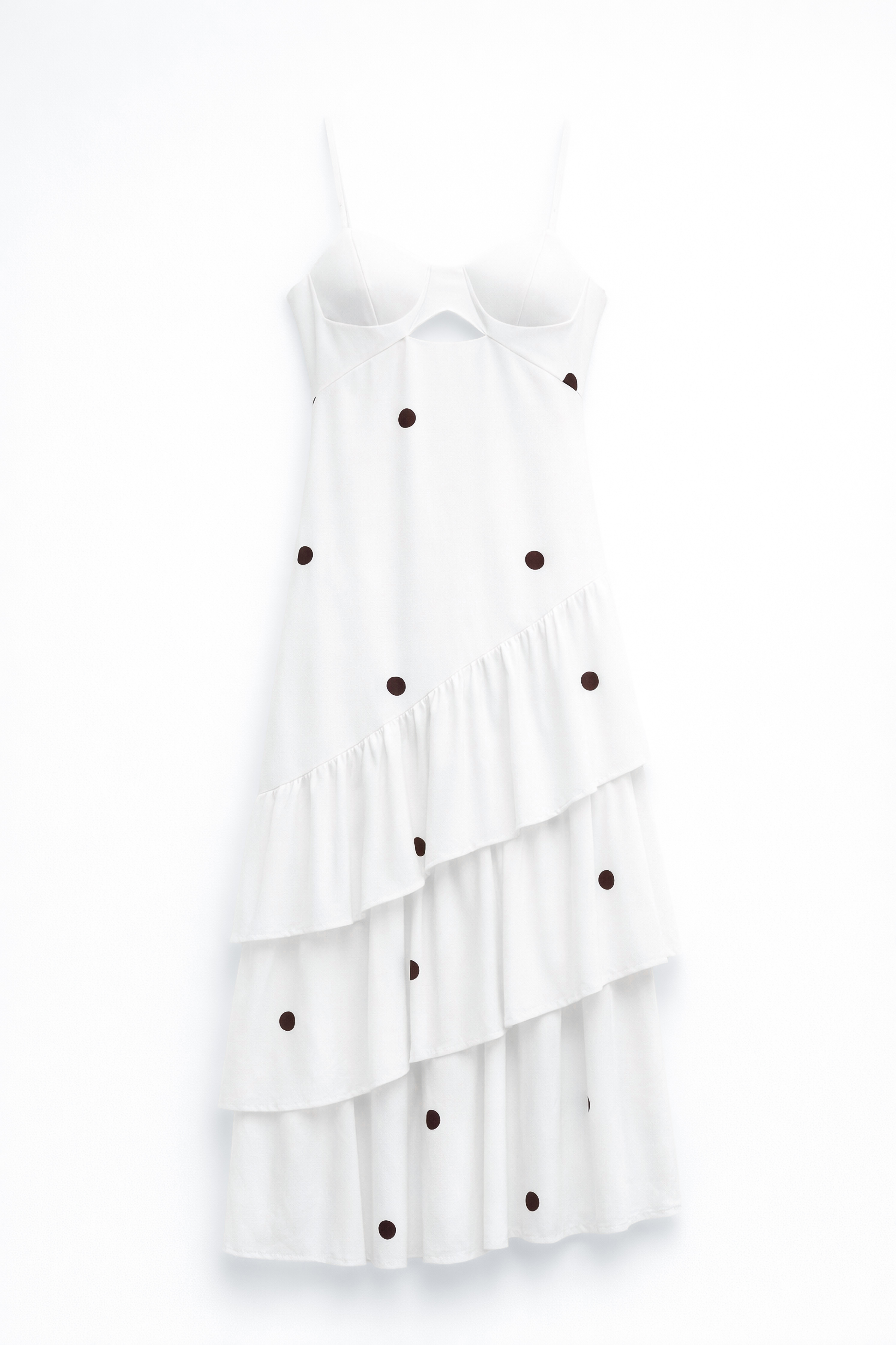 Abito lungo con stampa a pois in misto lino. Scollo con coppe strutturate e cut-out centrale. Spalline sottili regolabili. Fodera interna. Balze asimmetriche applicate sulla gonna. Chiusura posteriore con zip invisibile centrale. Vestibilità regolare, disponibile in taglia S, M, L.